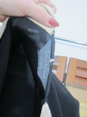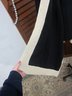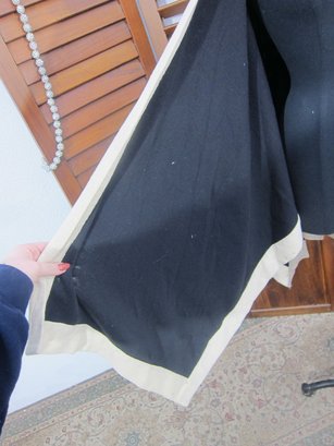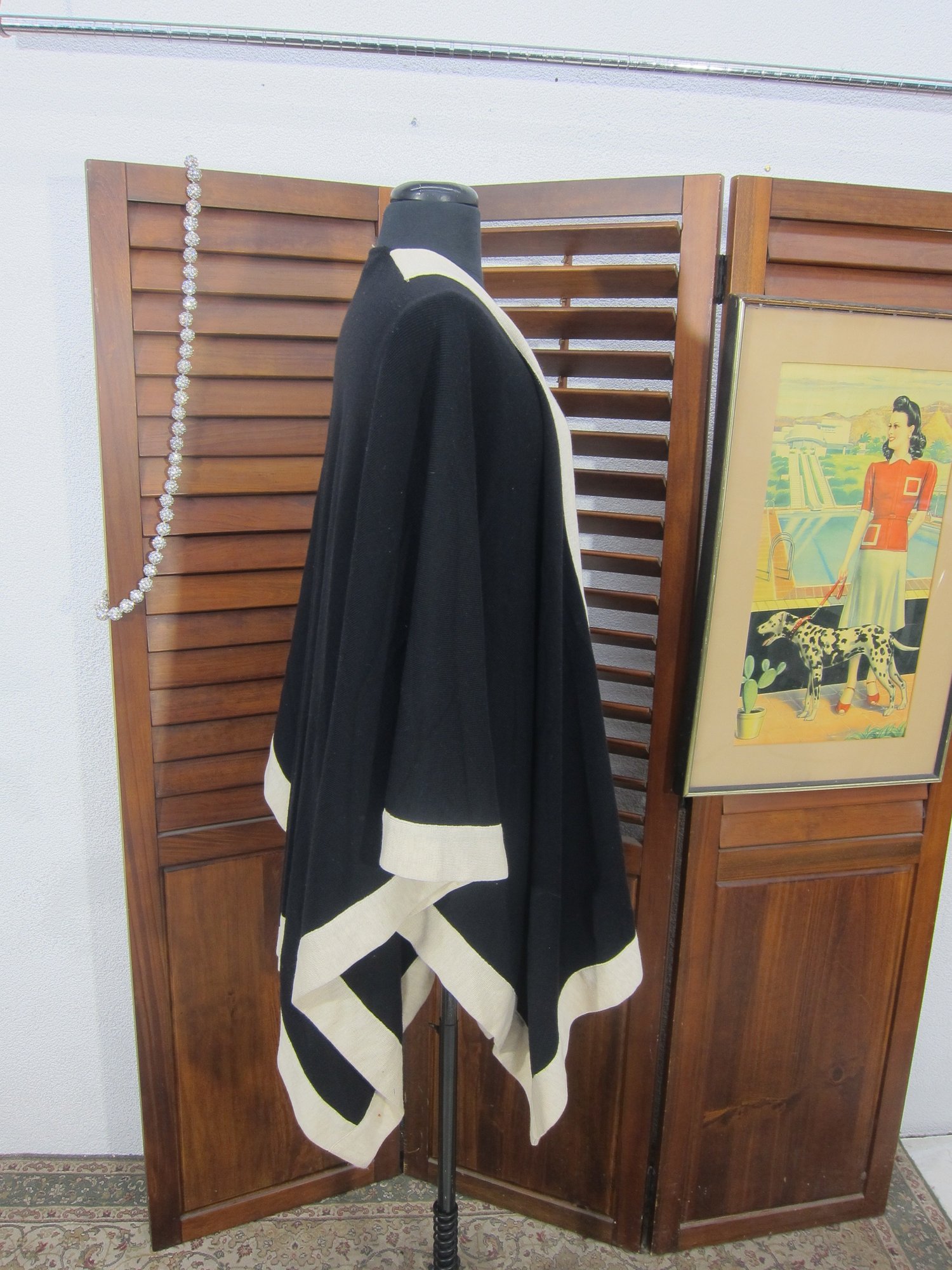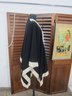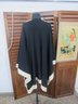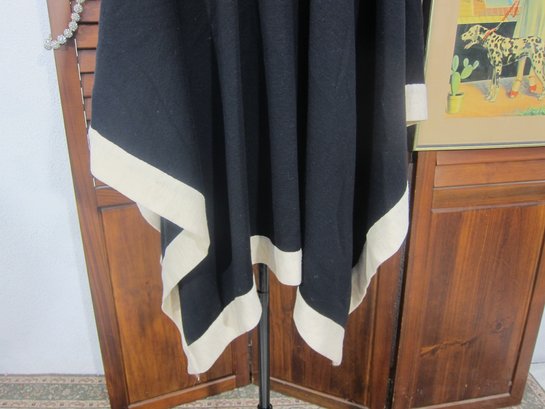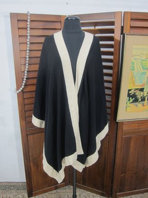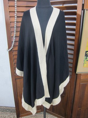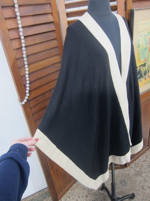 Chic and versatile black draped cape/poncho featuring bold ivory contrast trim throughout. This elegant open-front design has a fluid silhouette with wide, flowing sides and a relaxed fit, making it an easy statement piece that layers beautifully over dresses or separates.