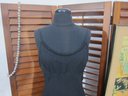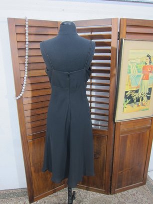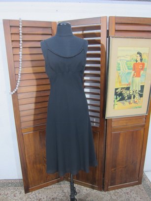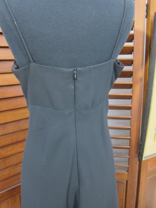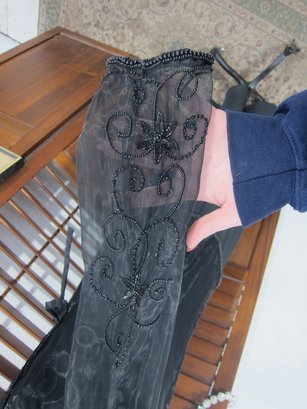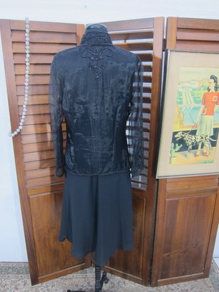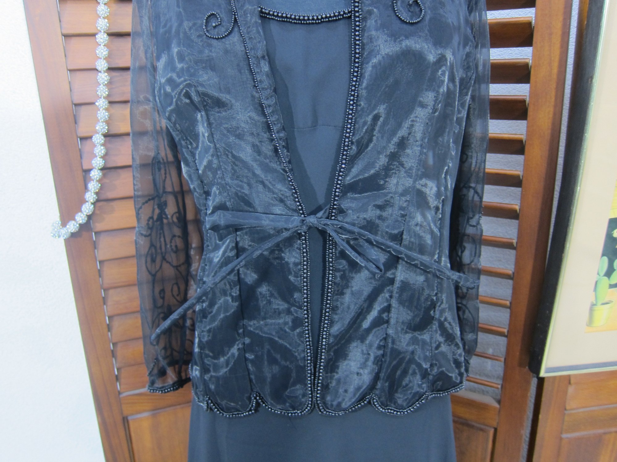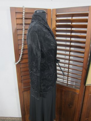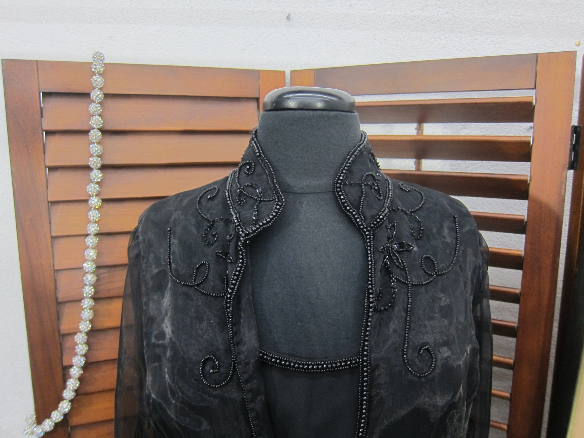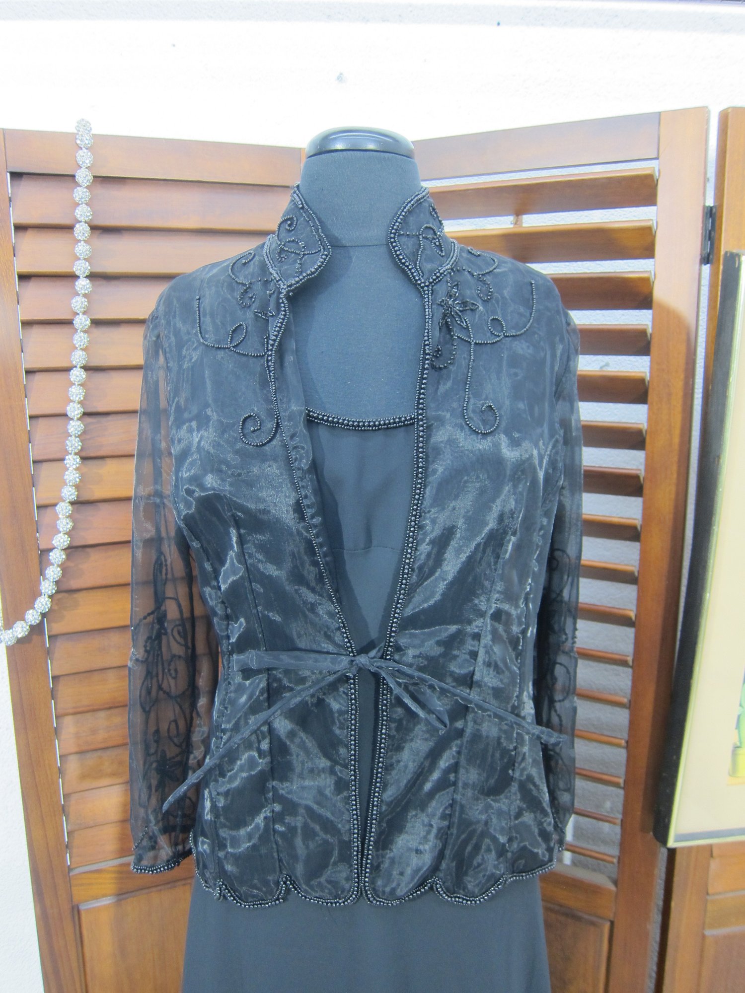 two-piece black evening ensemble featuring a sleeveless dress paired with a beautifully detailed lace jacket. The jacket showcases sheer lace sleeves with intricate swirling embroidery, scalloped edges, and subtle beaded trim, adding texture and sophistication to the look.