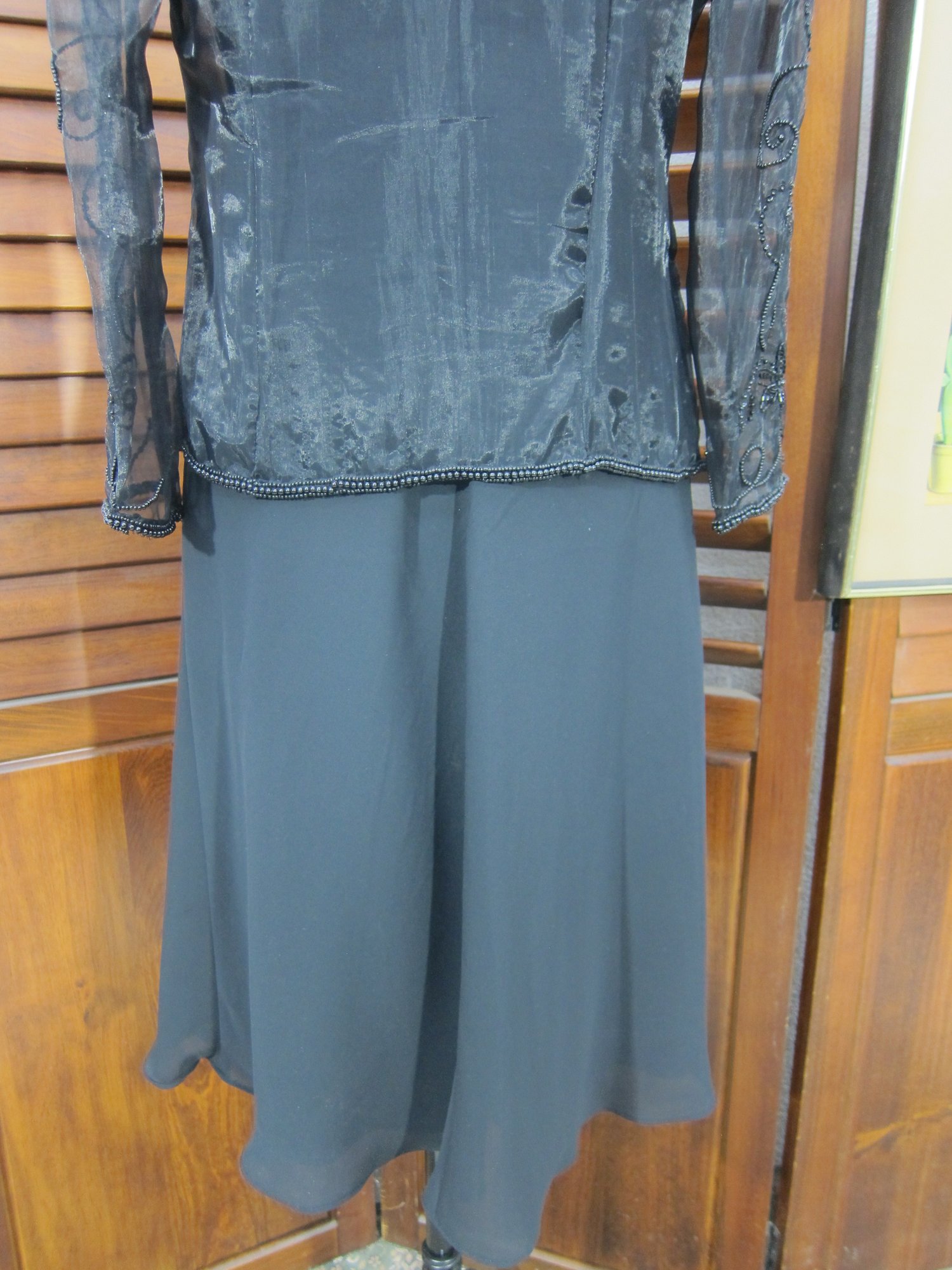 The coordinating dress has a clean, flattering silhouette with delicate beaded detailing along the neckline and a softly flared skirt, making this set perfect for formal events, evening wear, or special occasions.
