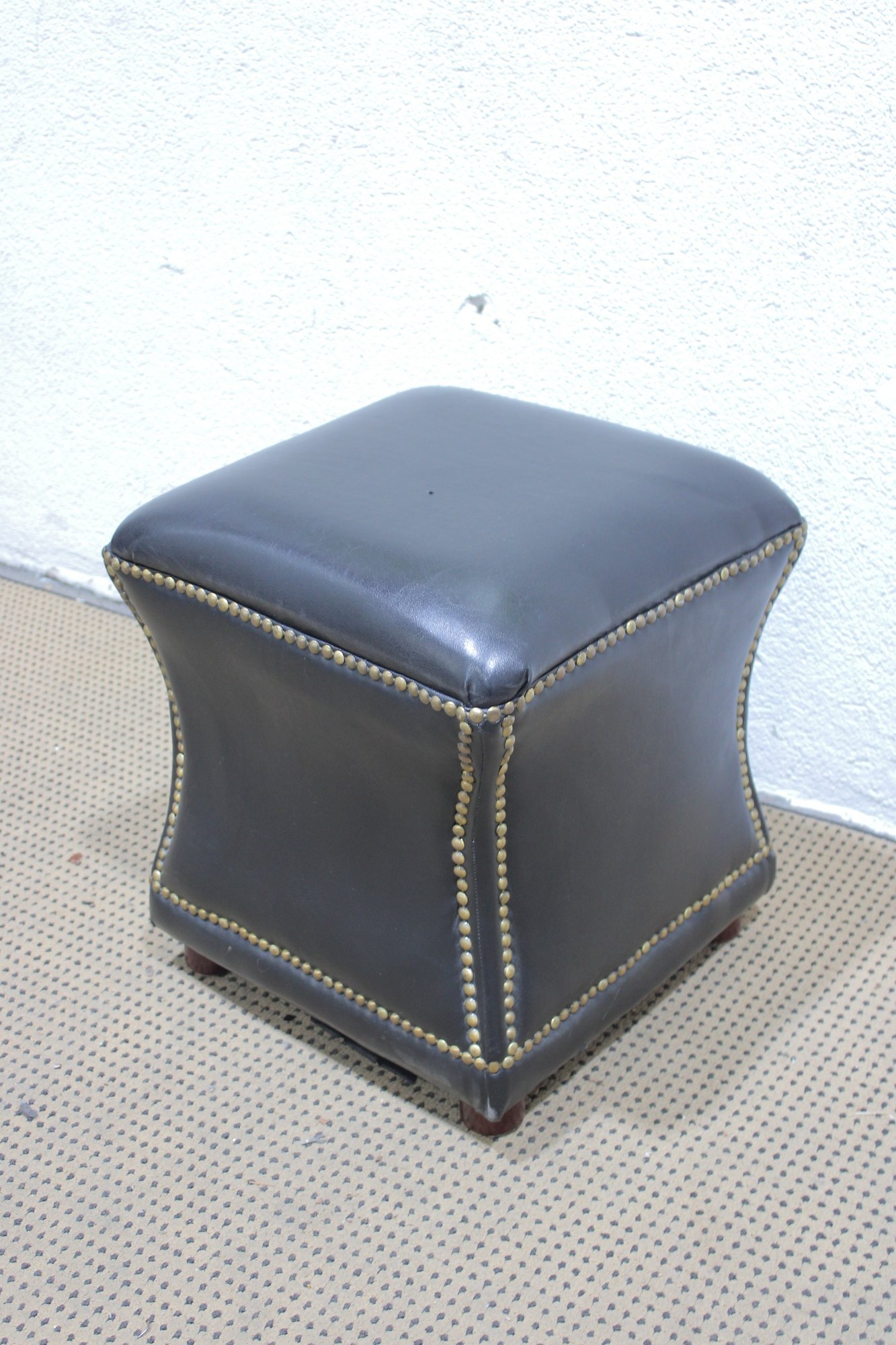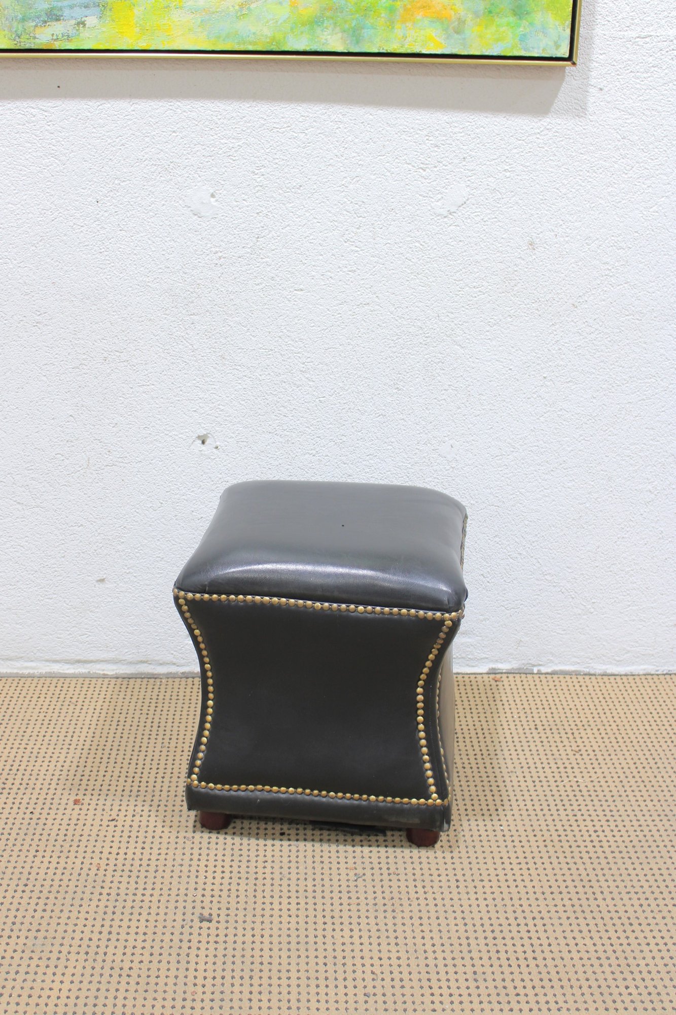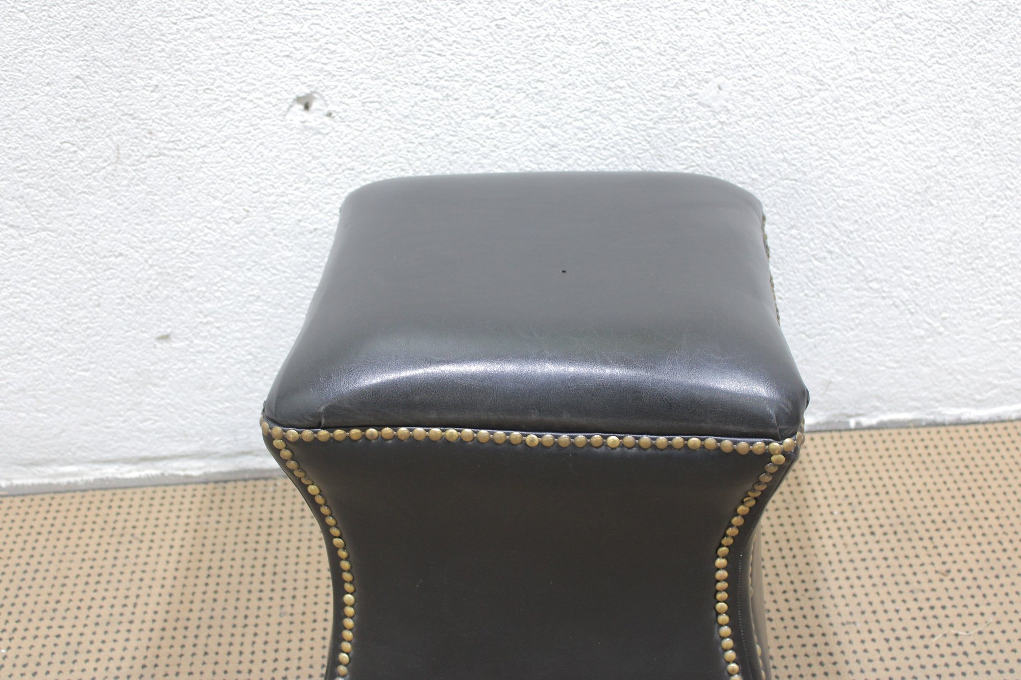 This stylish black leather ottoman stool adds a touch of classic elegance to any room. Measuring approximately 18.5” high x 16.5” wide, it features smooth black leather upholstery accented with decorative brass nailhead trim that outlines its sculpted silhouette.