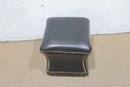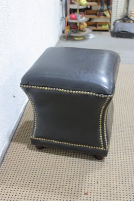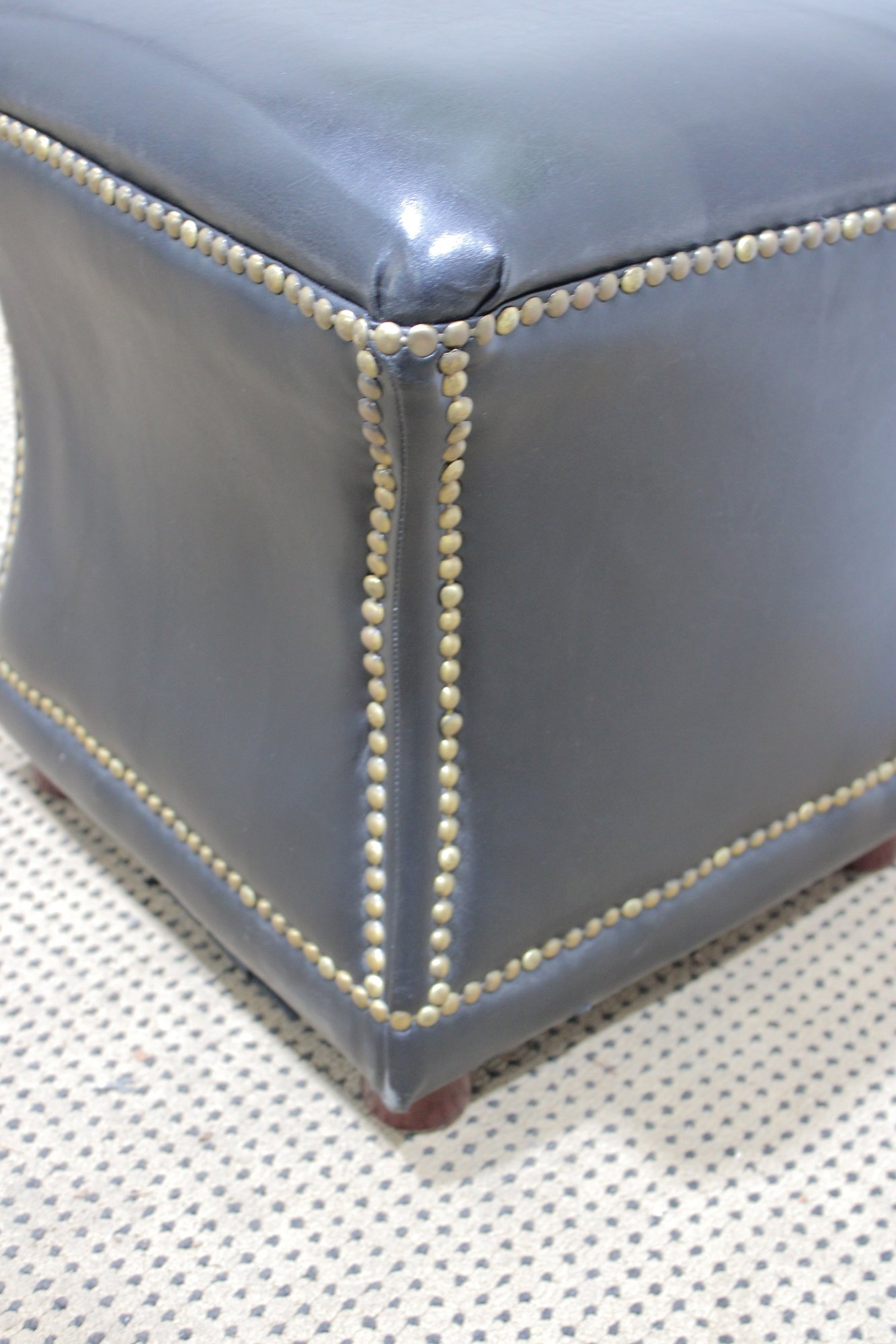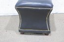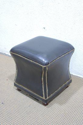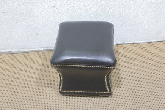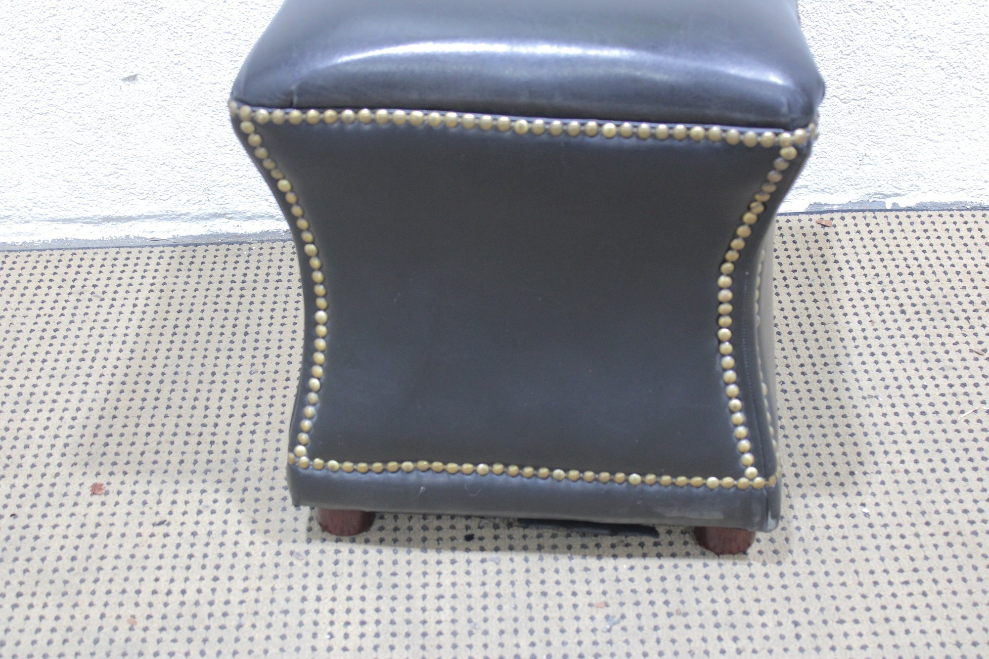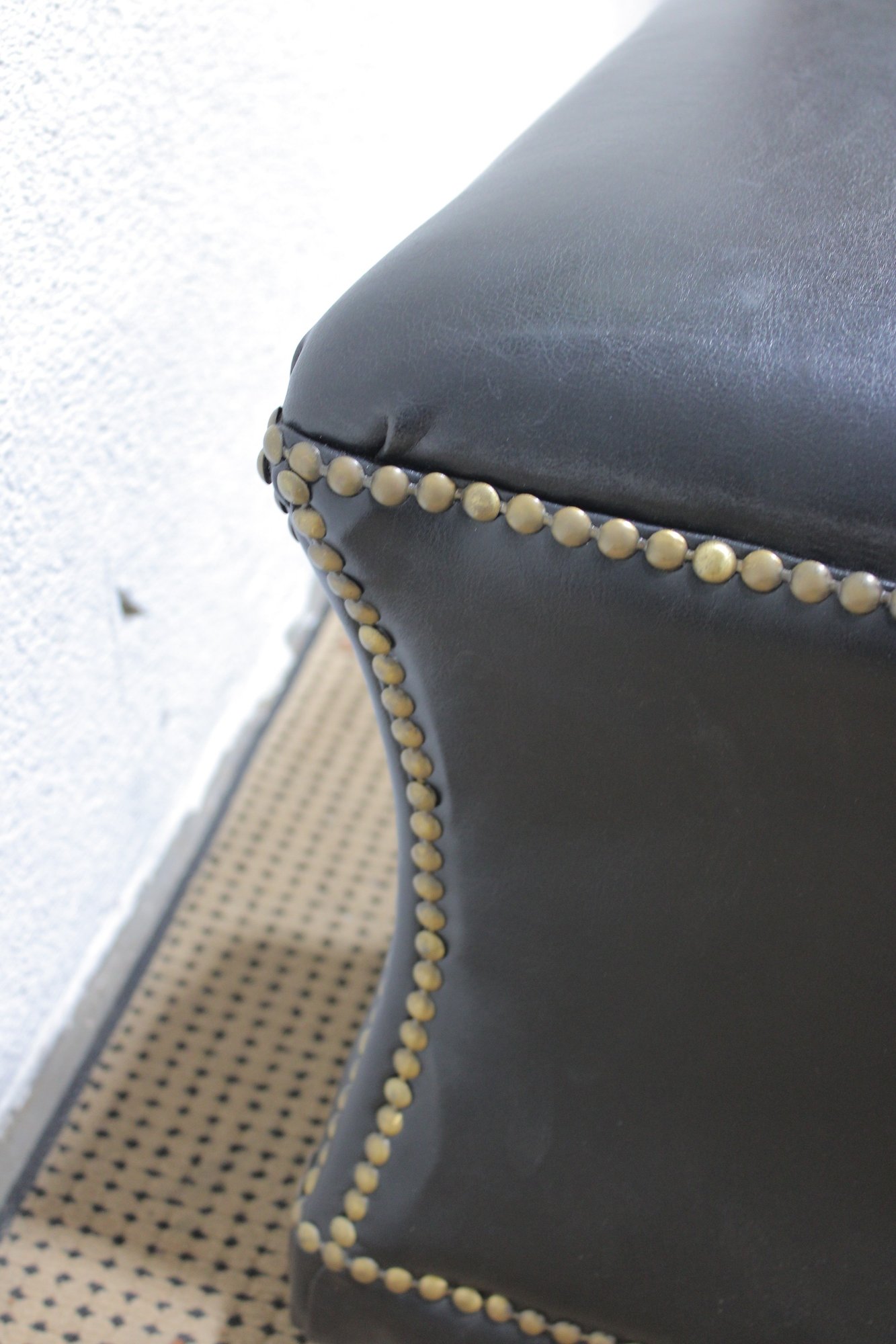 This stylish black leather ottoman stool adds a touch of classic elegance to any room. Measuring approximately 18.5” high x 16.5” wide, it features smooth black leather upholstery accented with decorative brass nailhead trim that outlines its sculpted silhouette.