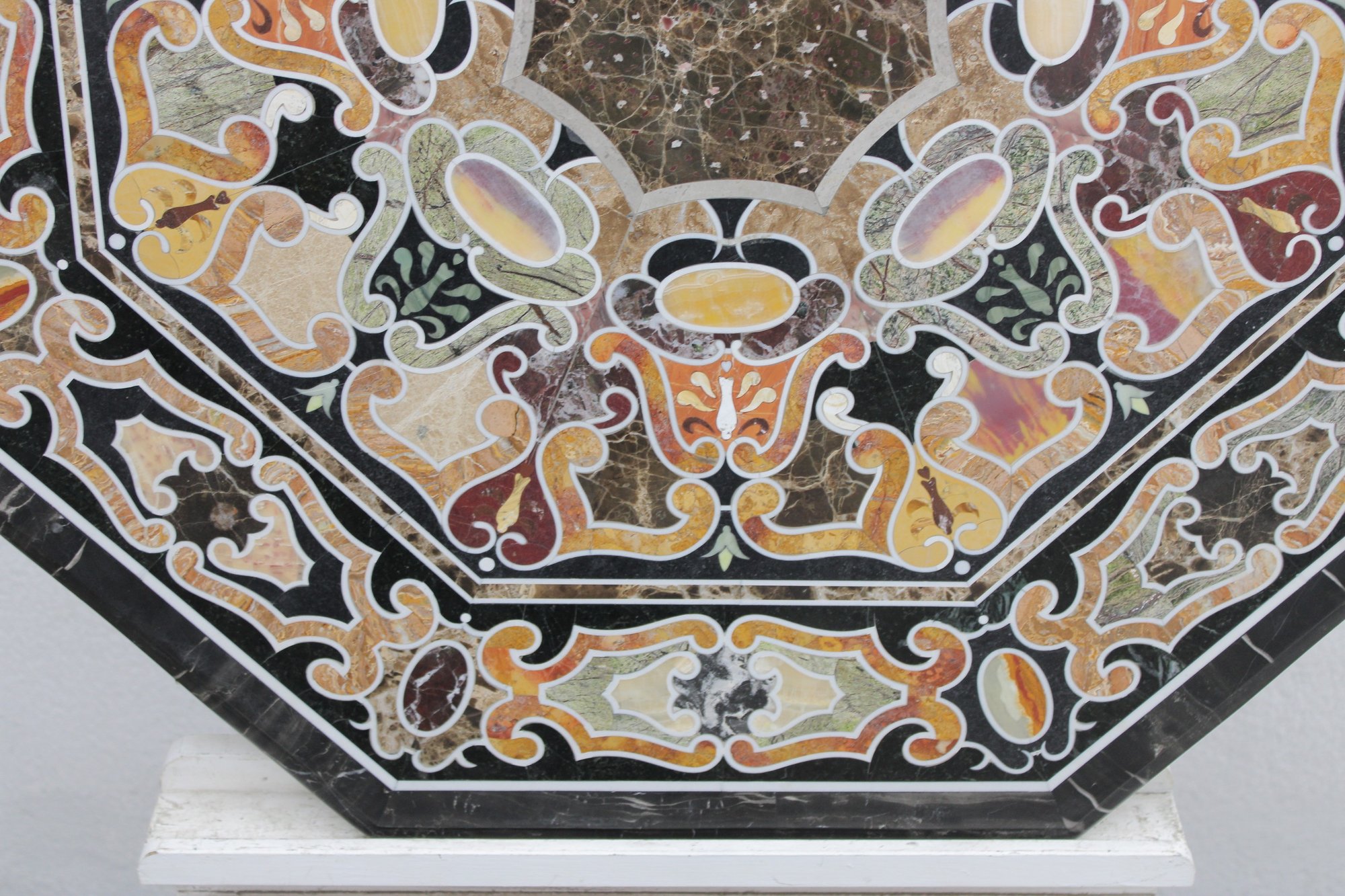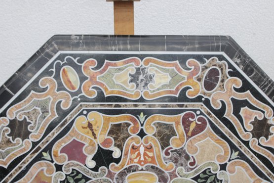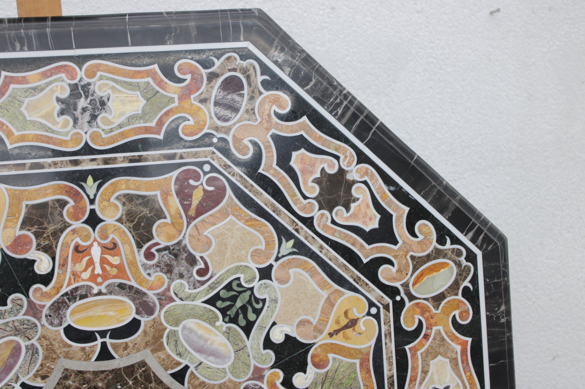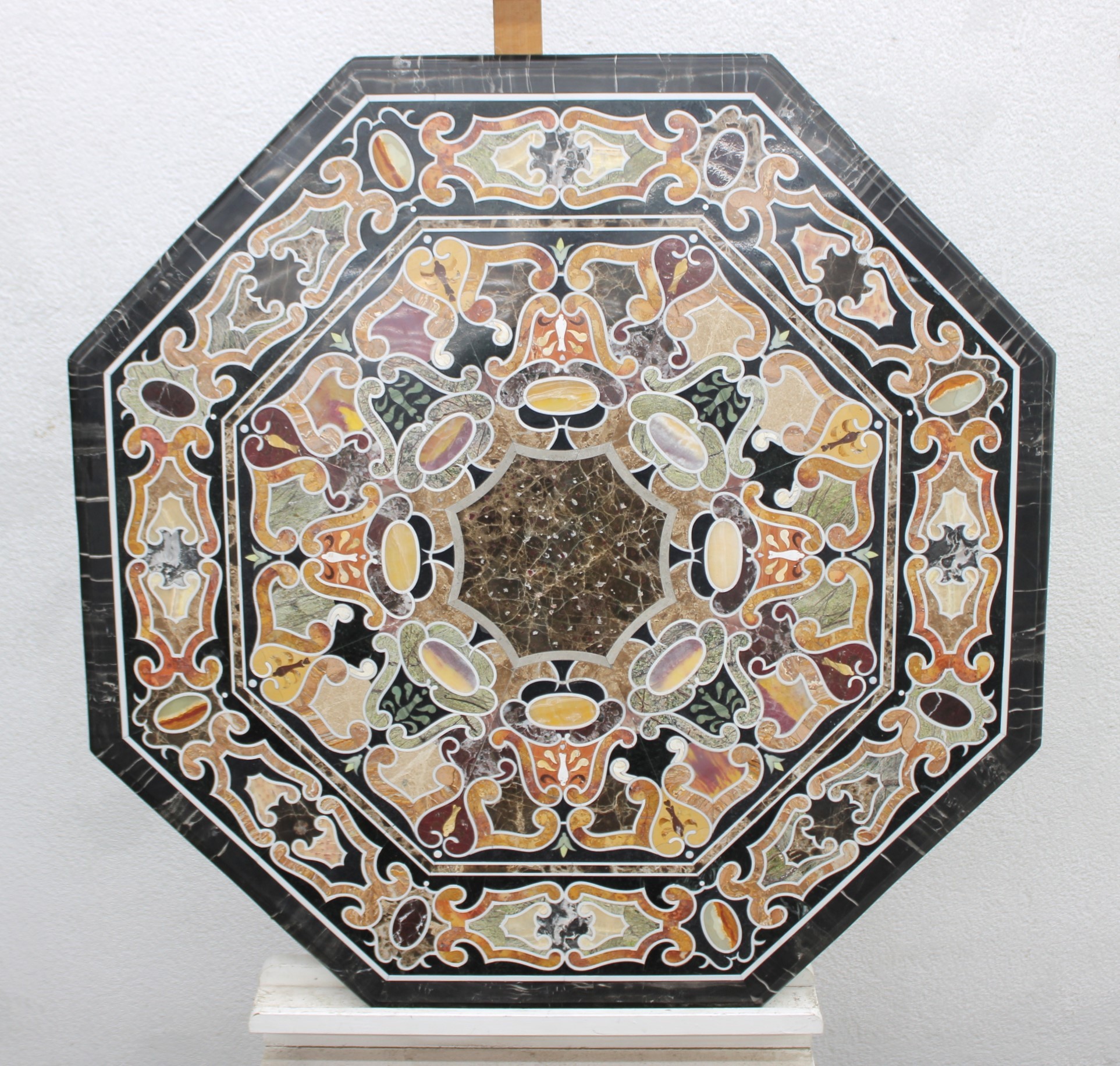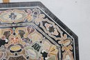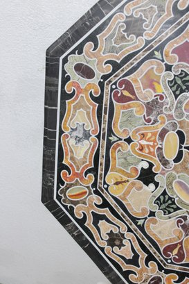 Elevate your space with this exceptional black marble inlaid table top featuring a rare and intricate pietra dura mosaic design. Measuring approximately 36” x 36” with an elegant octagonal shape, this piece showcases masterful craftsmanship with finely cut stone inlays forming a richly detailed geometric and floral pattern.