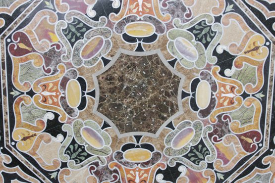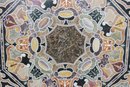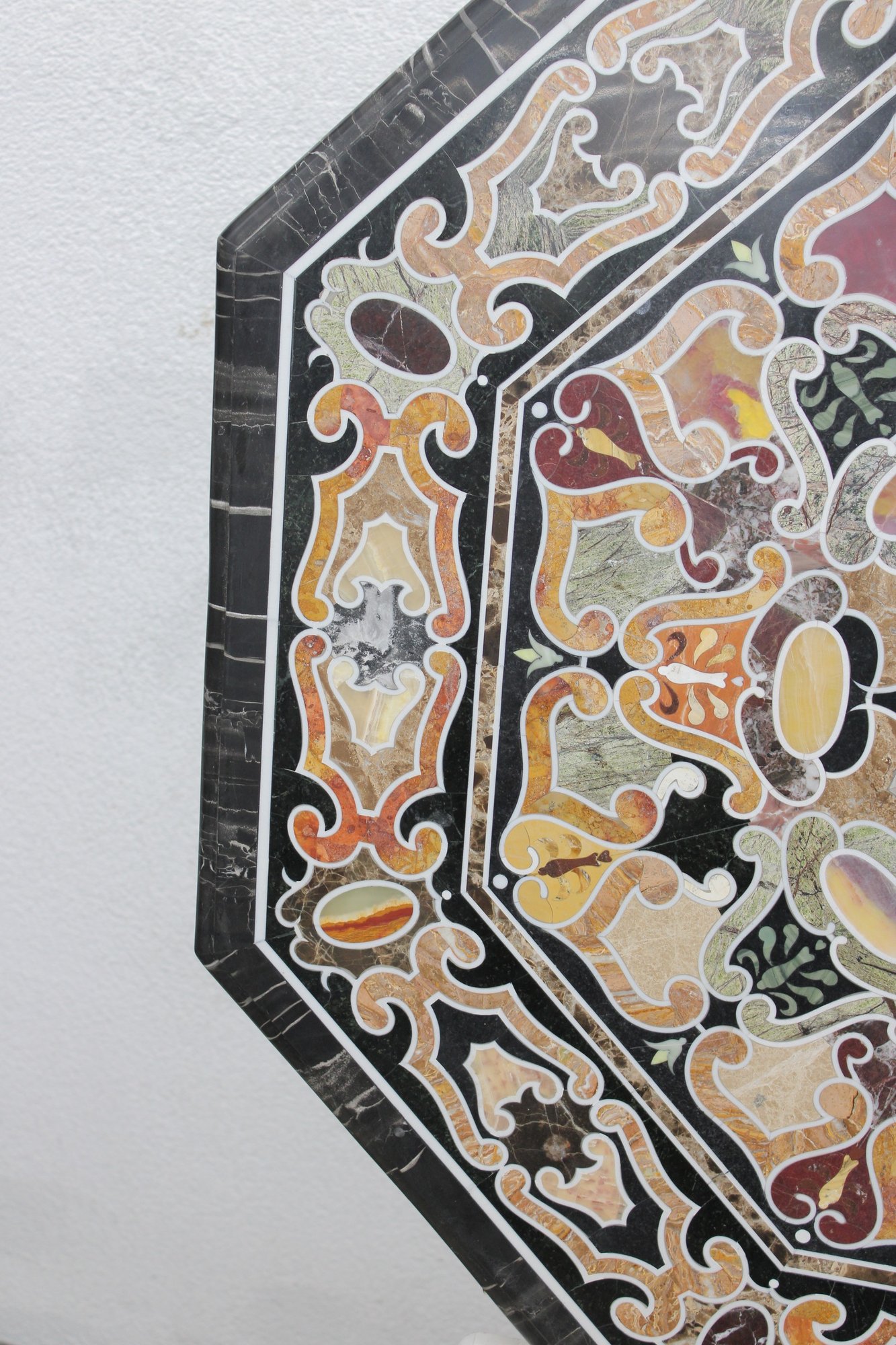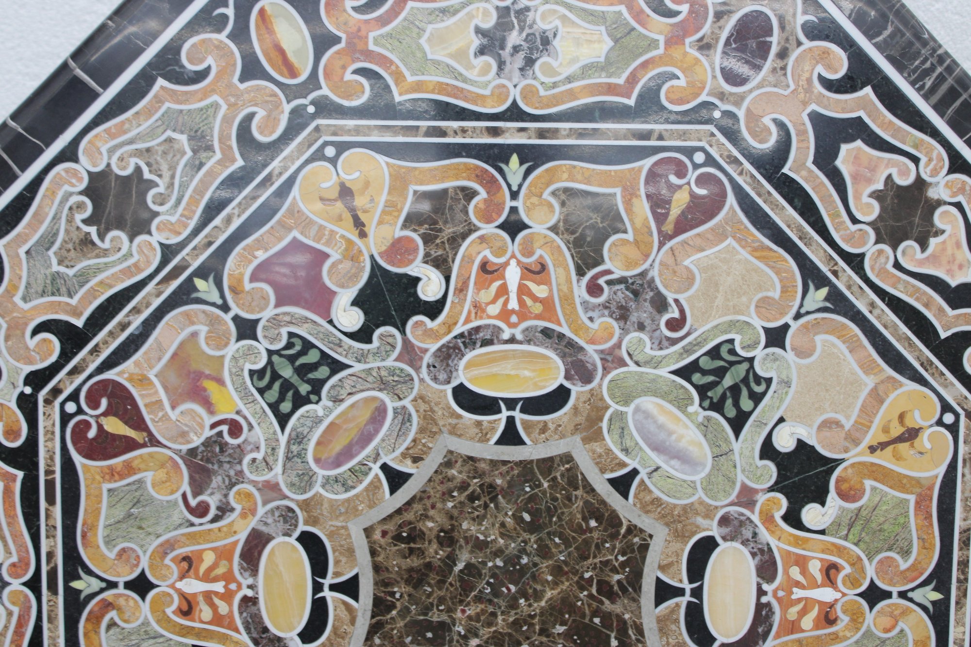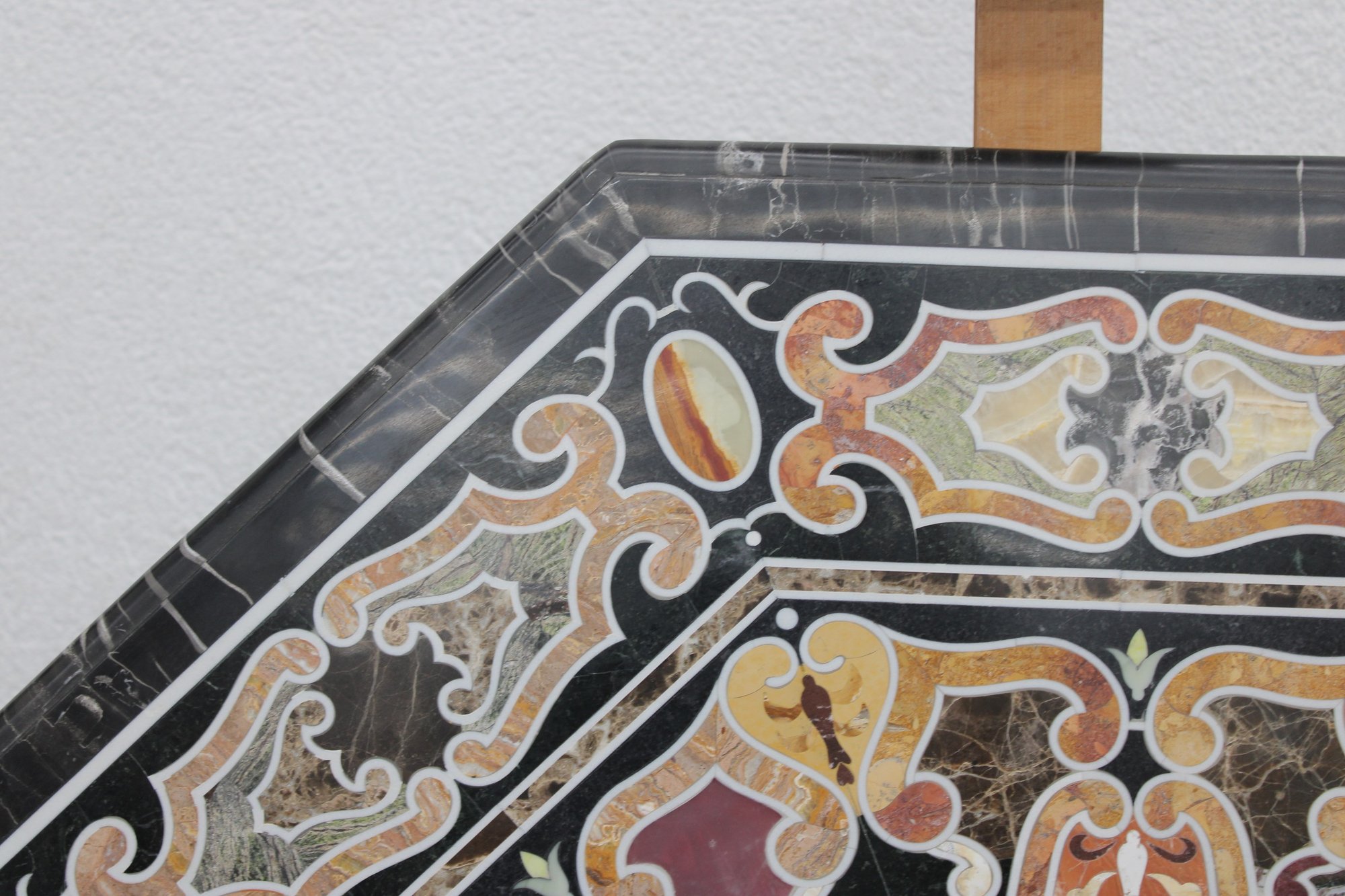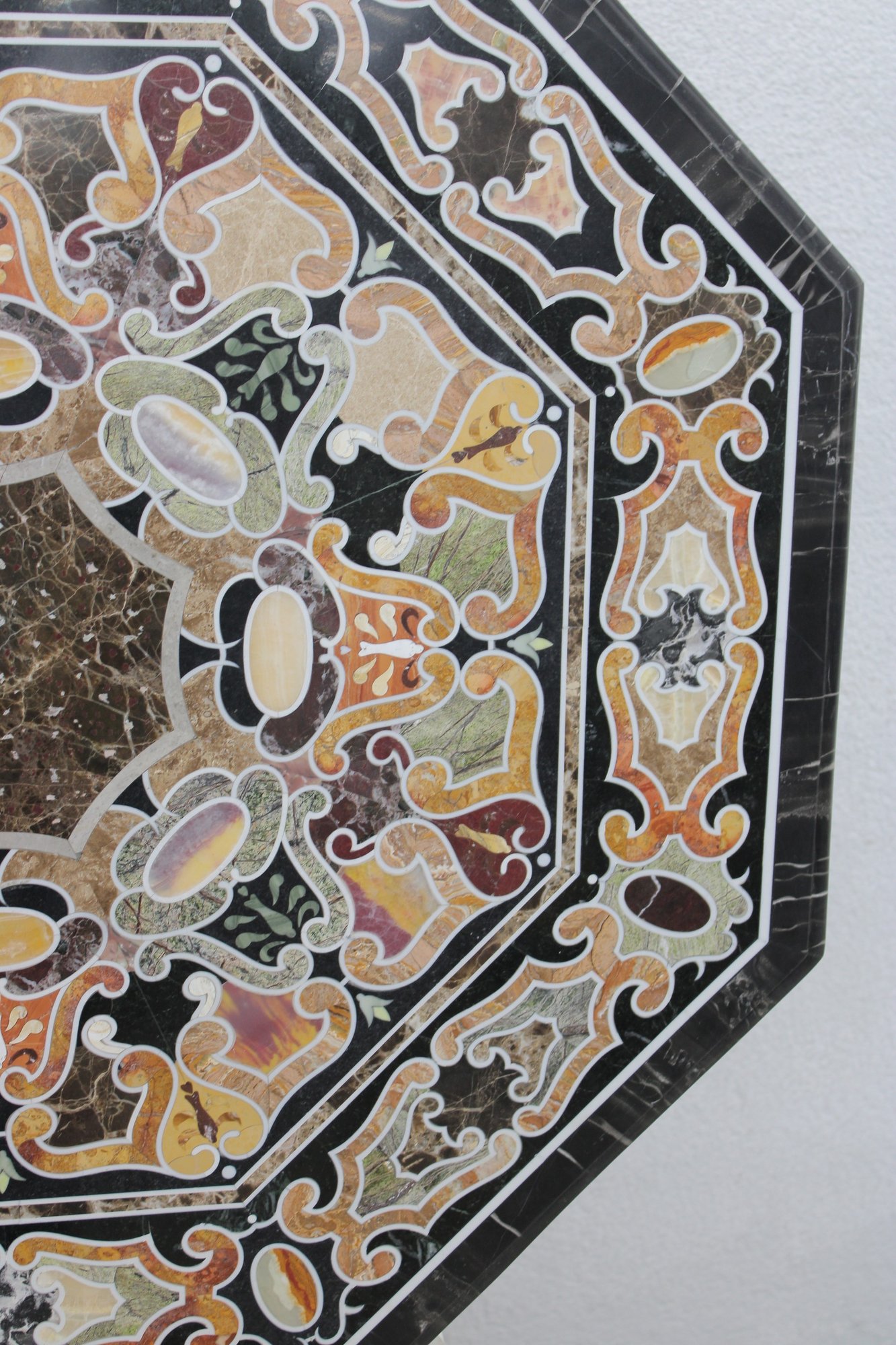 Elevate your space with this exceptional black marble inlaid table top featuring a rare and intricate pietra dura mosaic design. Measuring approximately 36” x 36” with an elegant octagonal shape, this piece showcases masterful craftsmanship with finely cut stone inlays forming a richly detailed geometric and floral pattern.