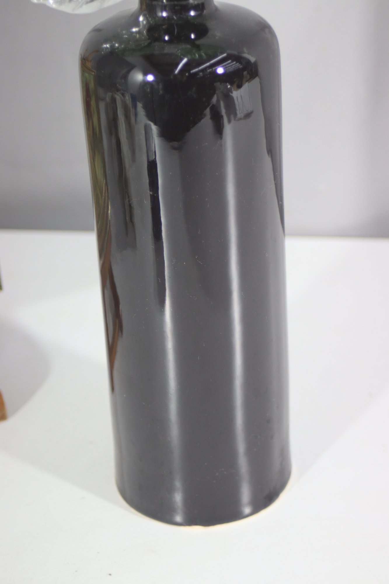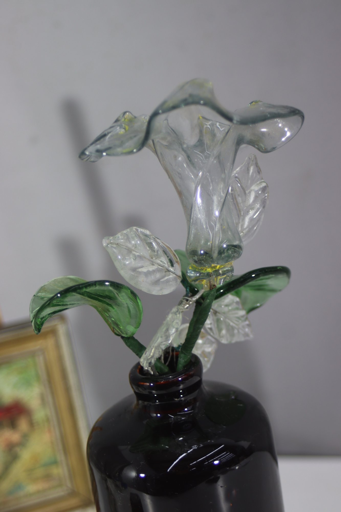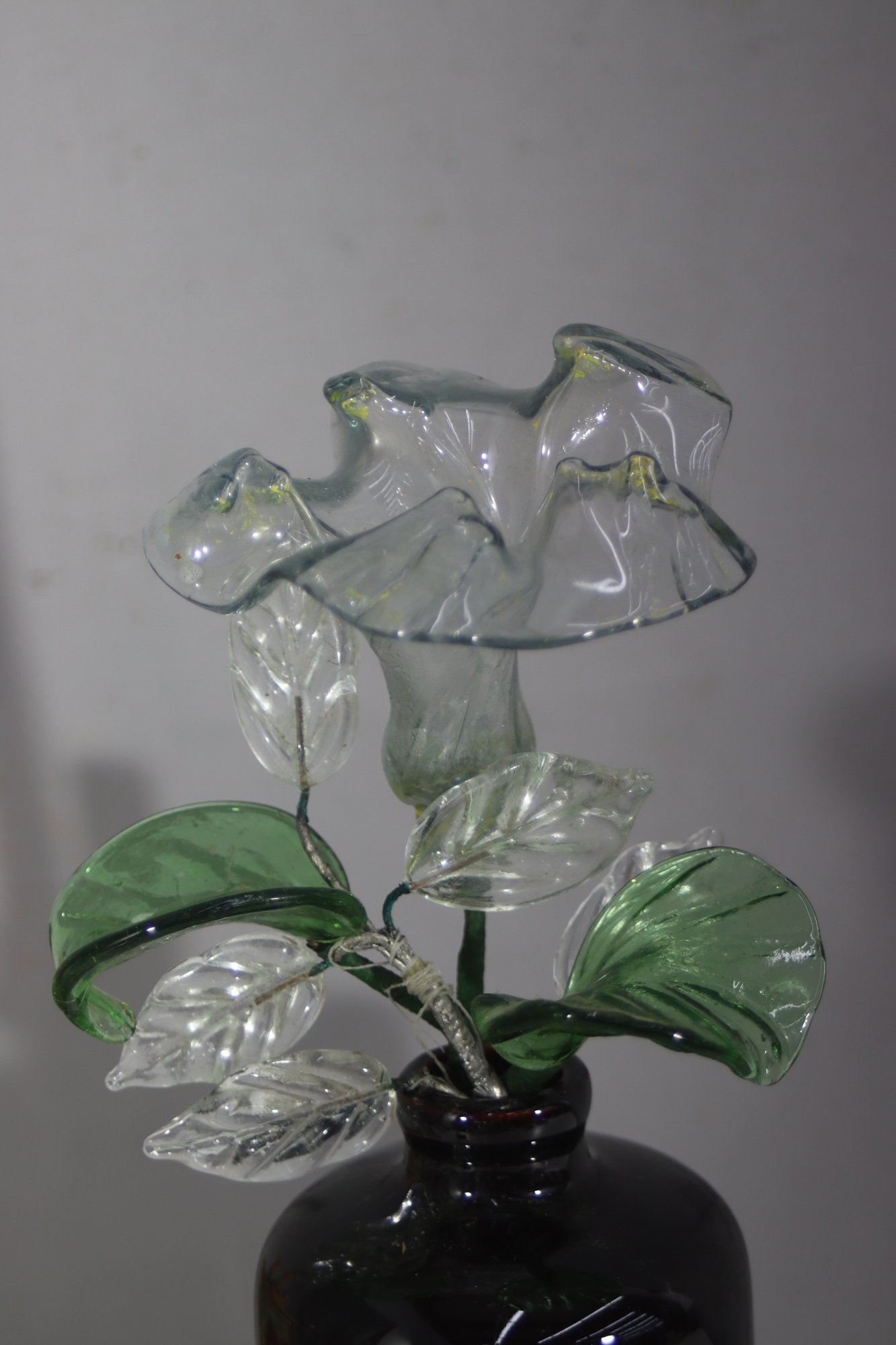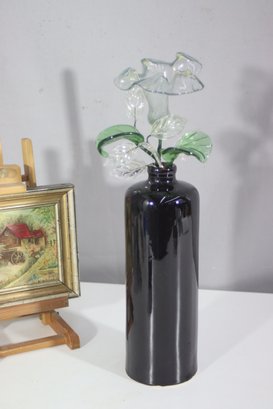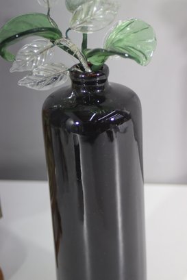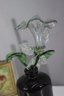 This stunning decorative piece features a sleek black ceramic vase paired with intricately handcrafted glass flowers. The delicate glass blooms and leaves are beautifully detailed, showcasing fine artistry. The glossy black vase provides a striking contrast, making this an eye-catching addition to any home, office, or art collection.