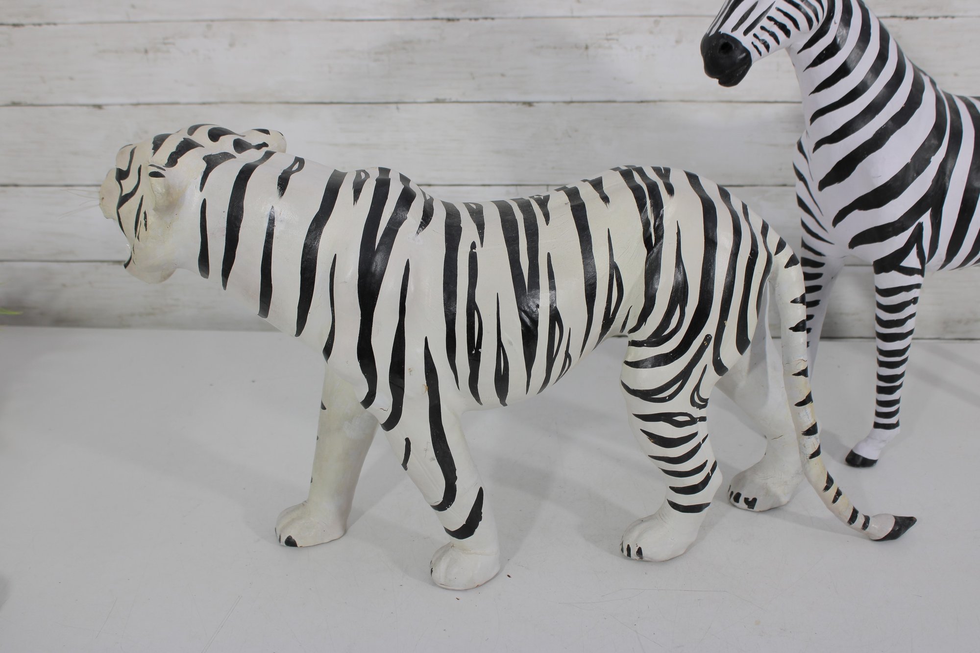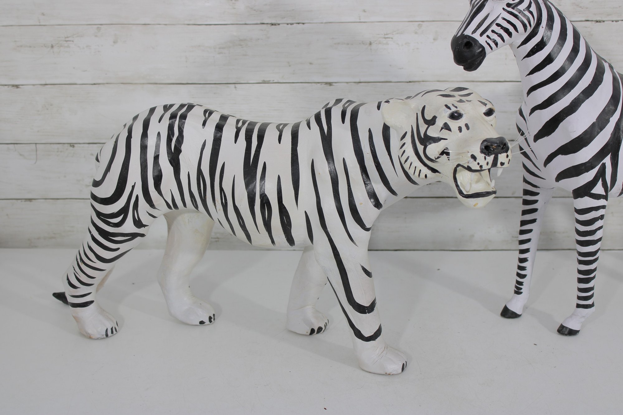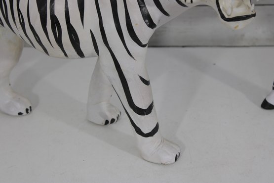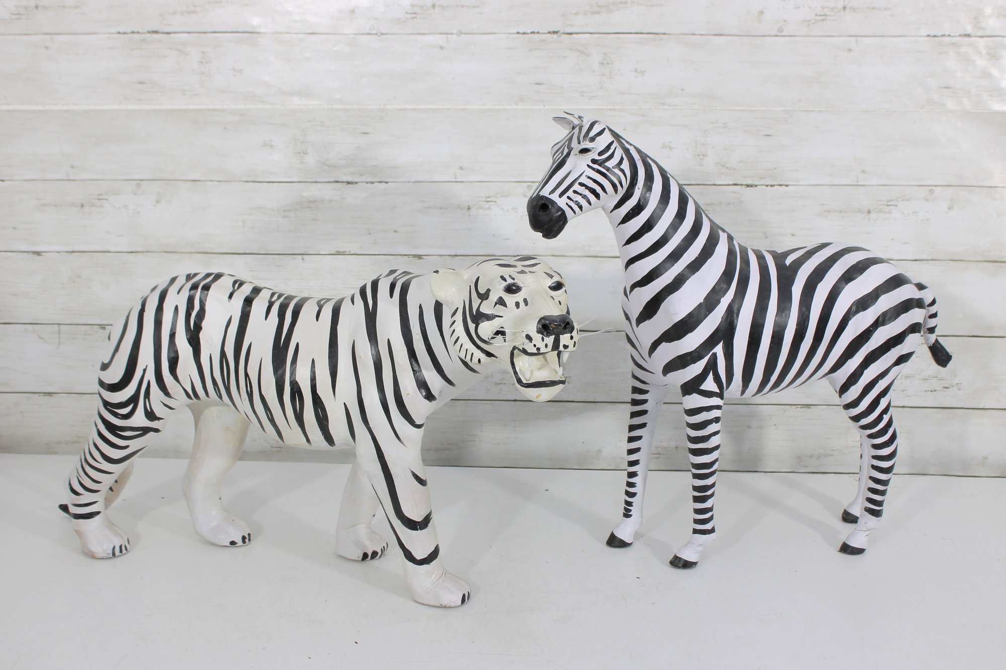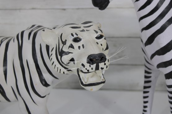 set of two black and white safari animal sculptures featuring a zebra and a tiger, both finished in bold hand-painted striping. These graphic, high-contrast pieces make eye-catching decorative accents with a fun, modern-meets-global feel.