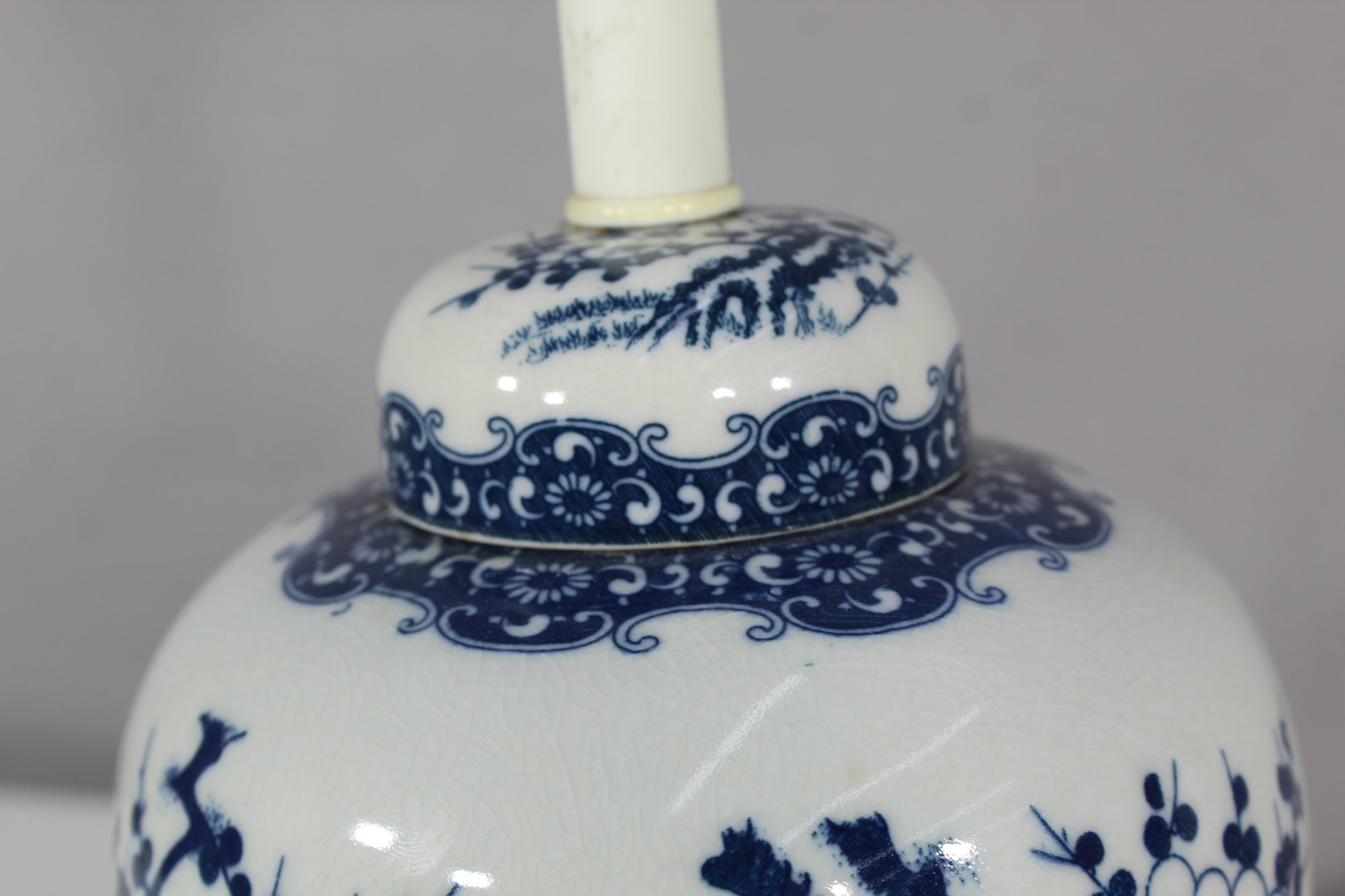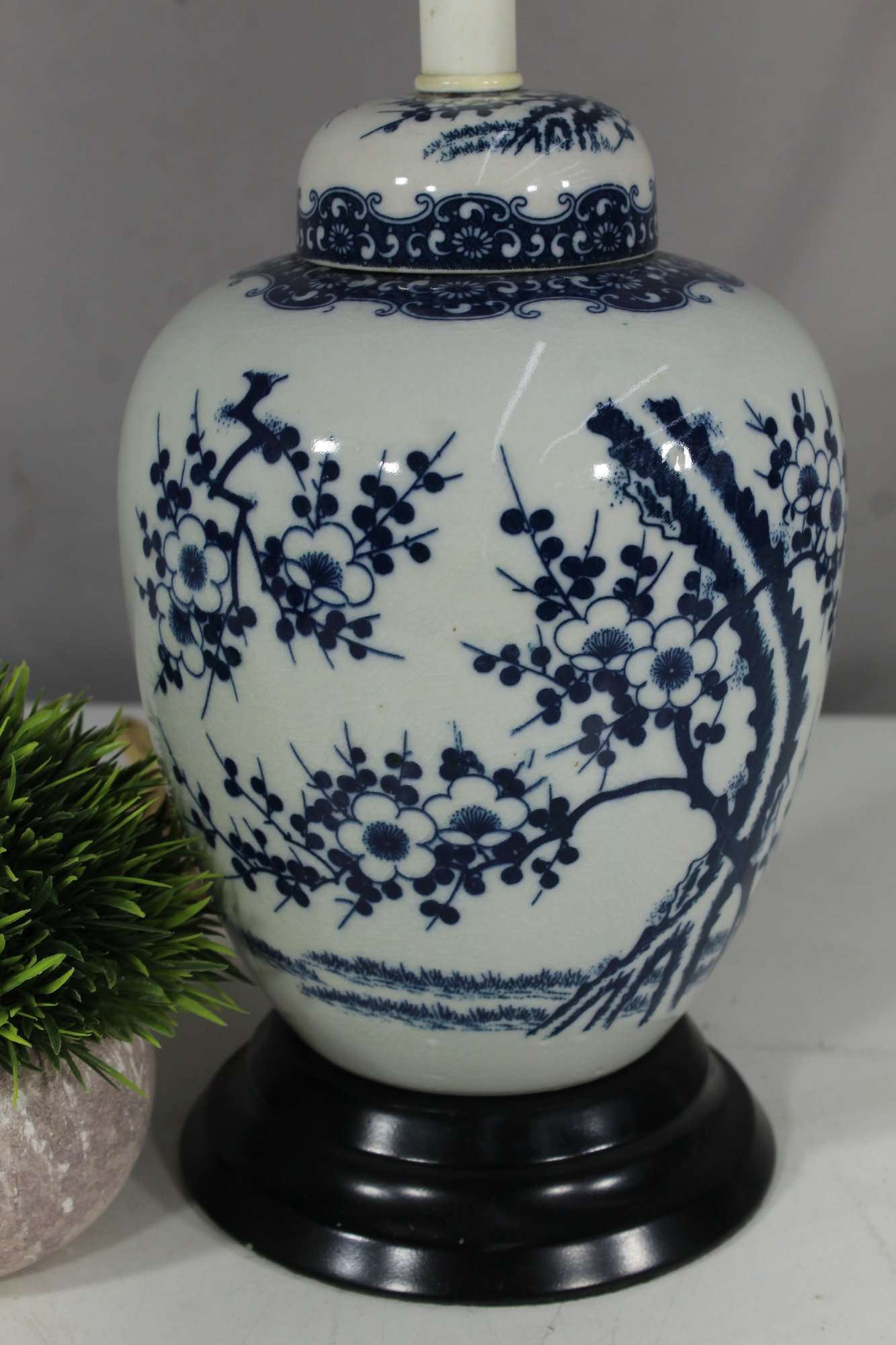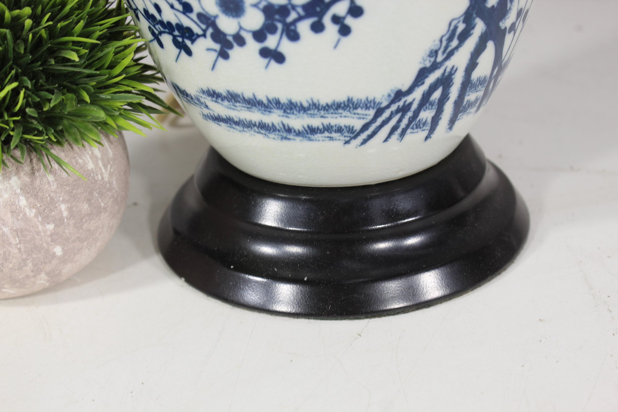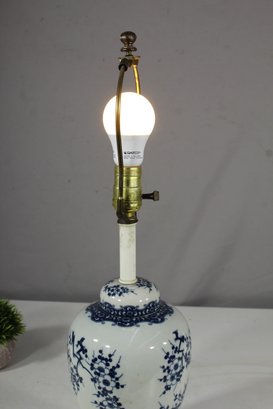 table lamp features a classic blue and white porcelain base adorned with intricate floral and branch motifs, inspired by traditional Chinese artistry. Mounted on a black pedestal base, this lamp seamlessly combines timeless design with modern functionality, making it a perfect addition to any room.
