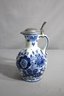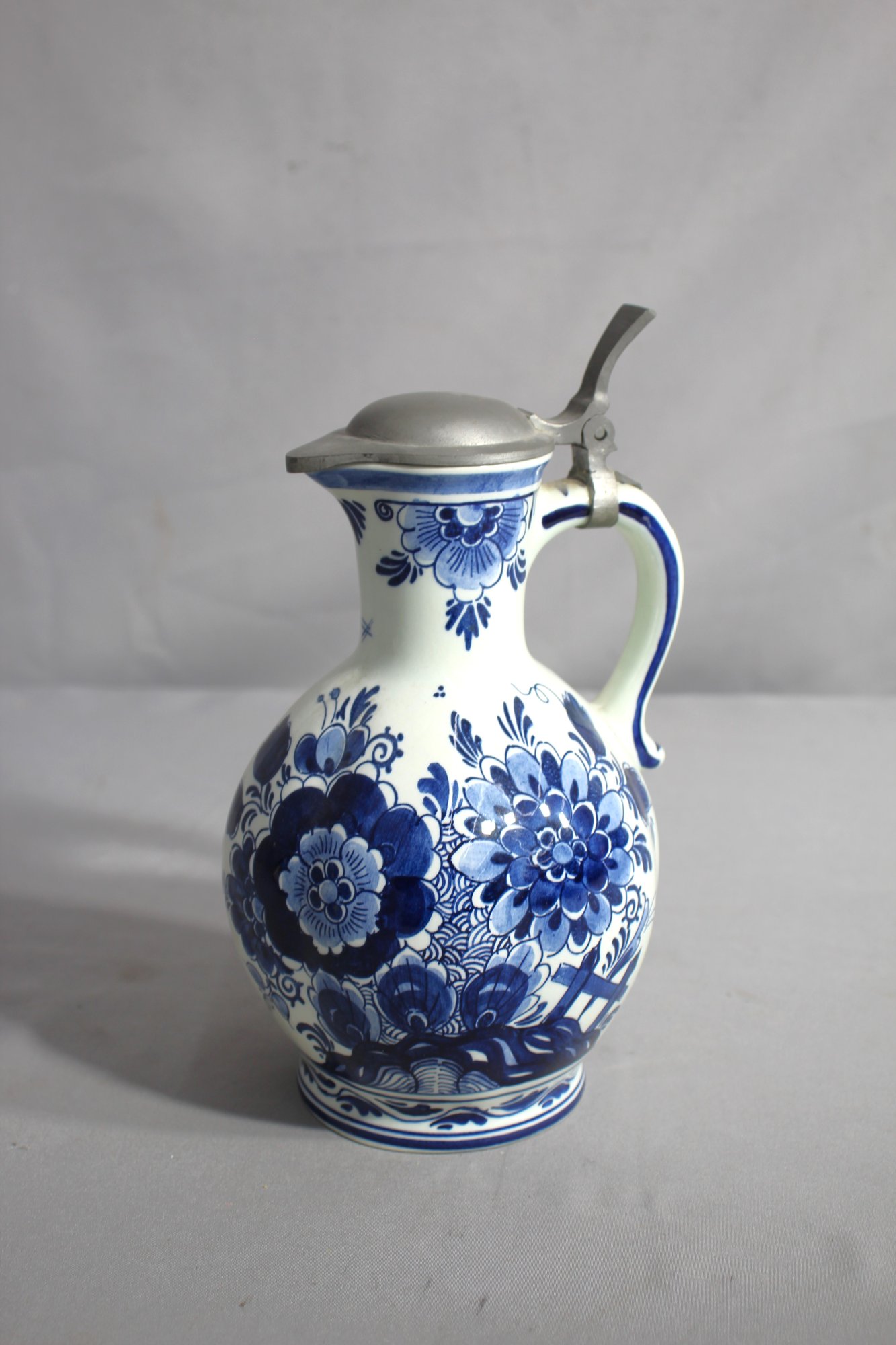 The vase stands out with its vivid blue floral patterns that are hand-painted with meticulous detail, embracing the classic Delft blue style. Each bloom and leaf adorning the pitcher's curvaceous body is a testament to the artisan's skill
