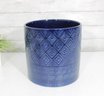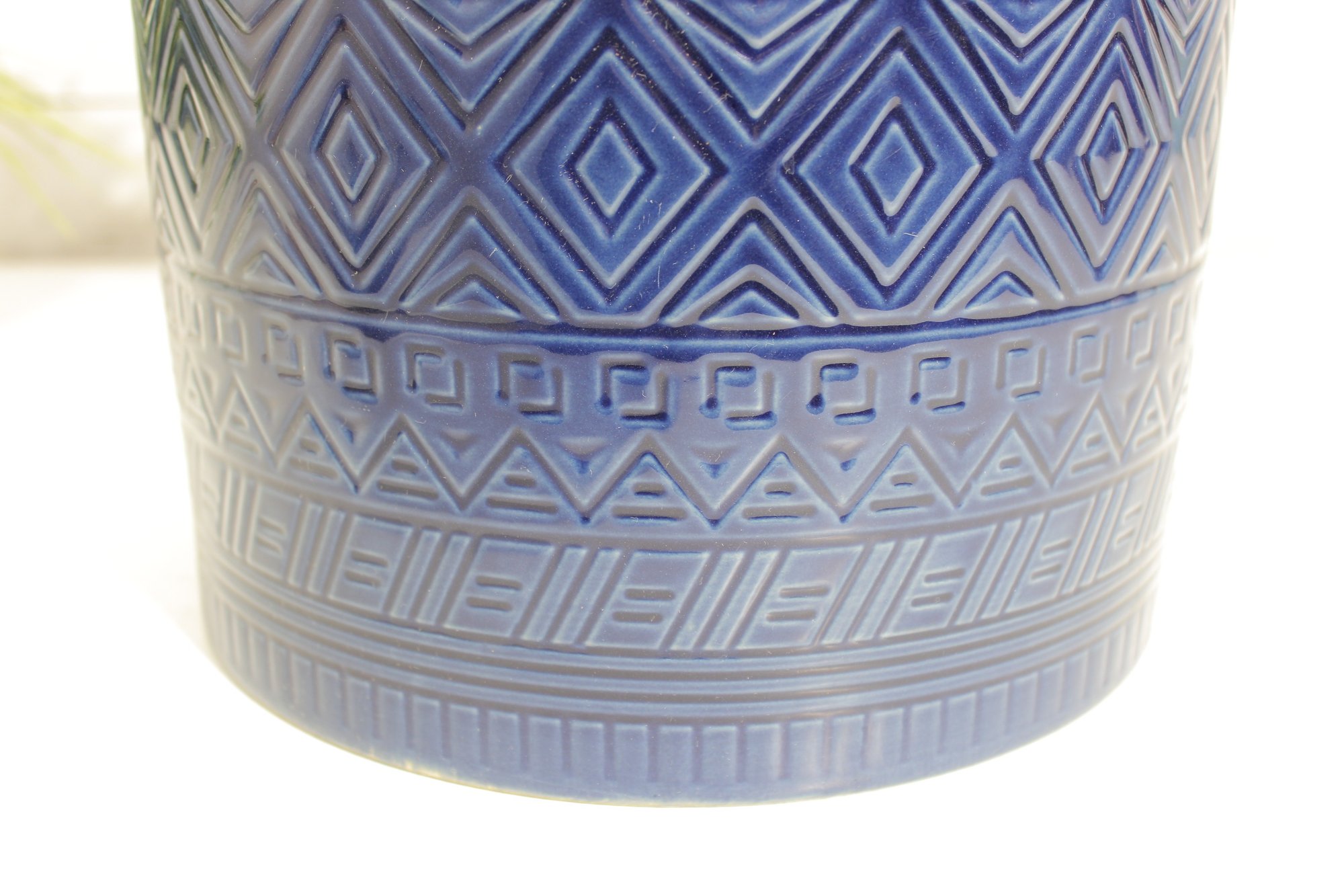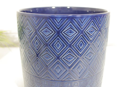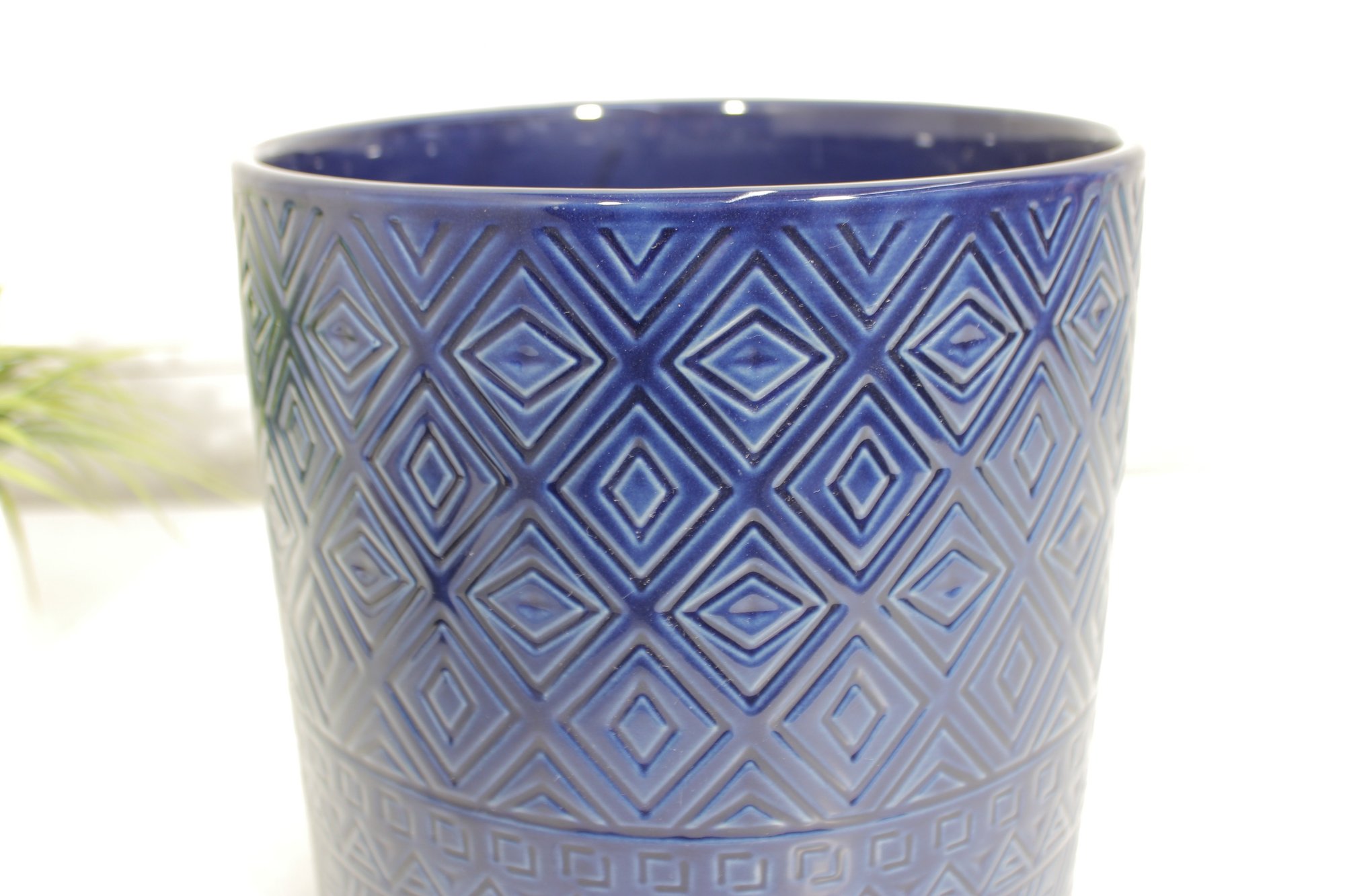 Add a bold, modern touch to your space with this striking blue ceramic planter featuring an all-over embossed geometric pattern. Measuring approximately 10 inches tall and 9.5 inches in diameter, this round planter showcases layered diamond and linear motifs that create depth and visual interest.