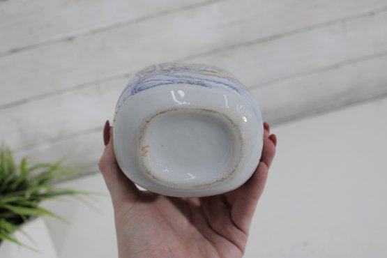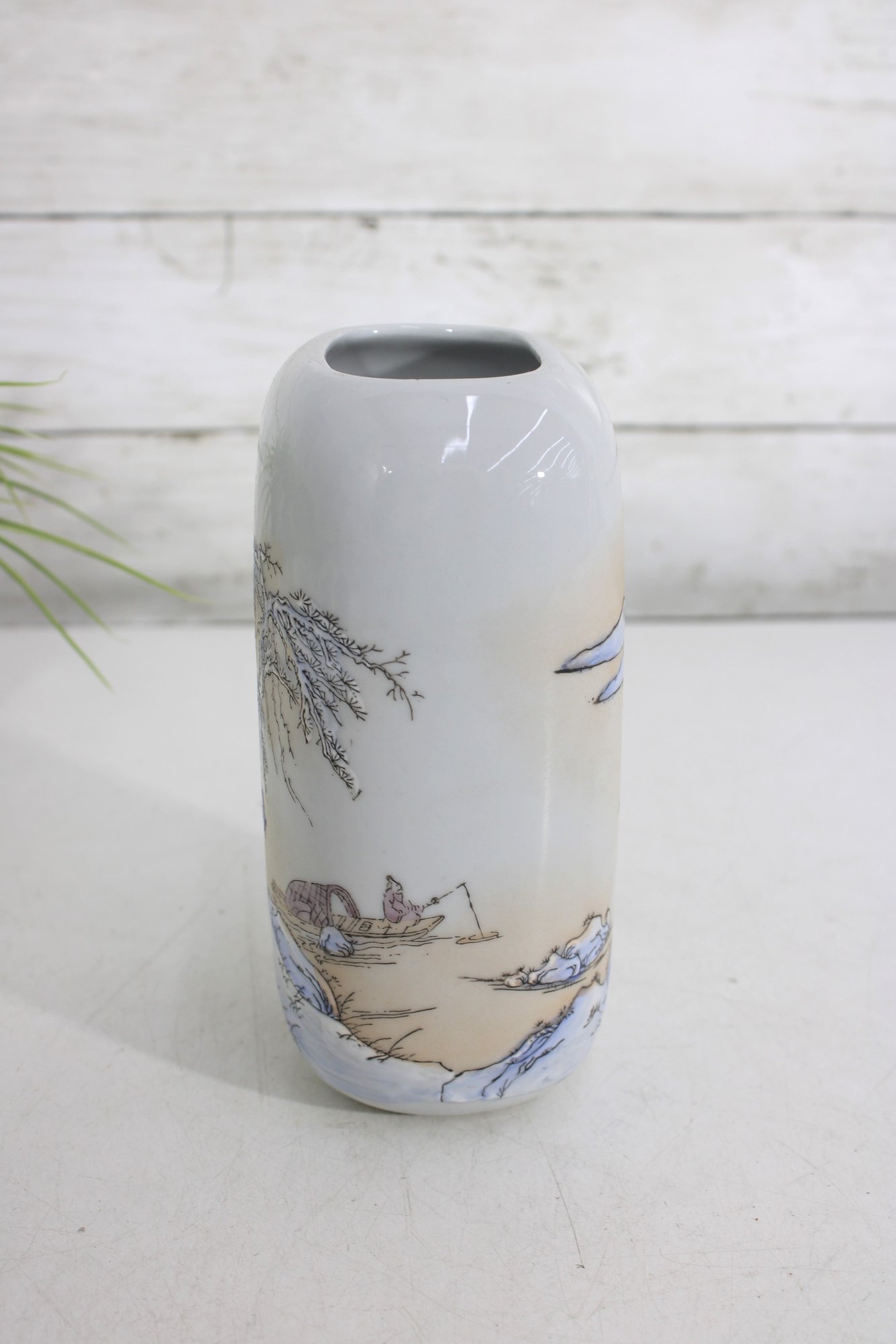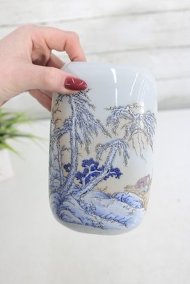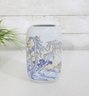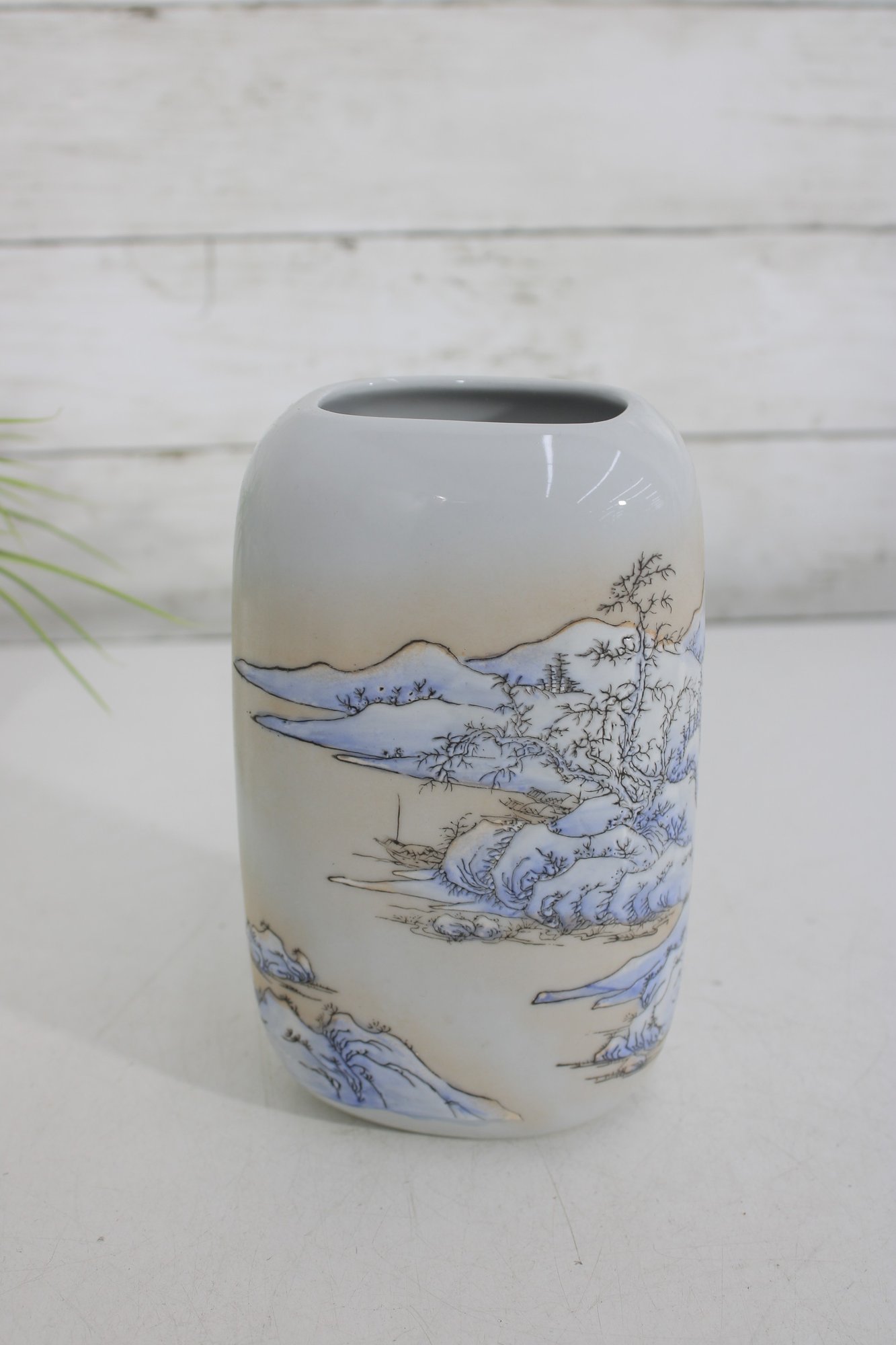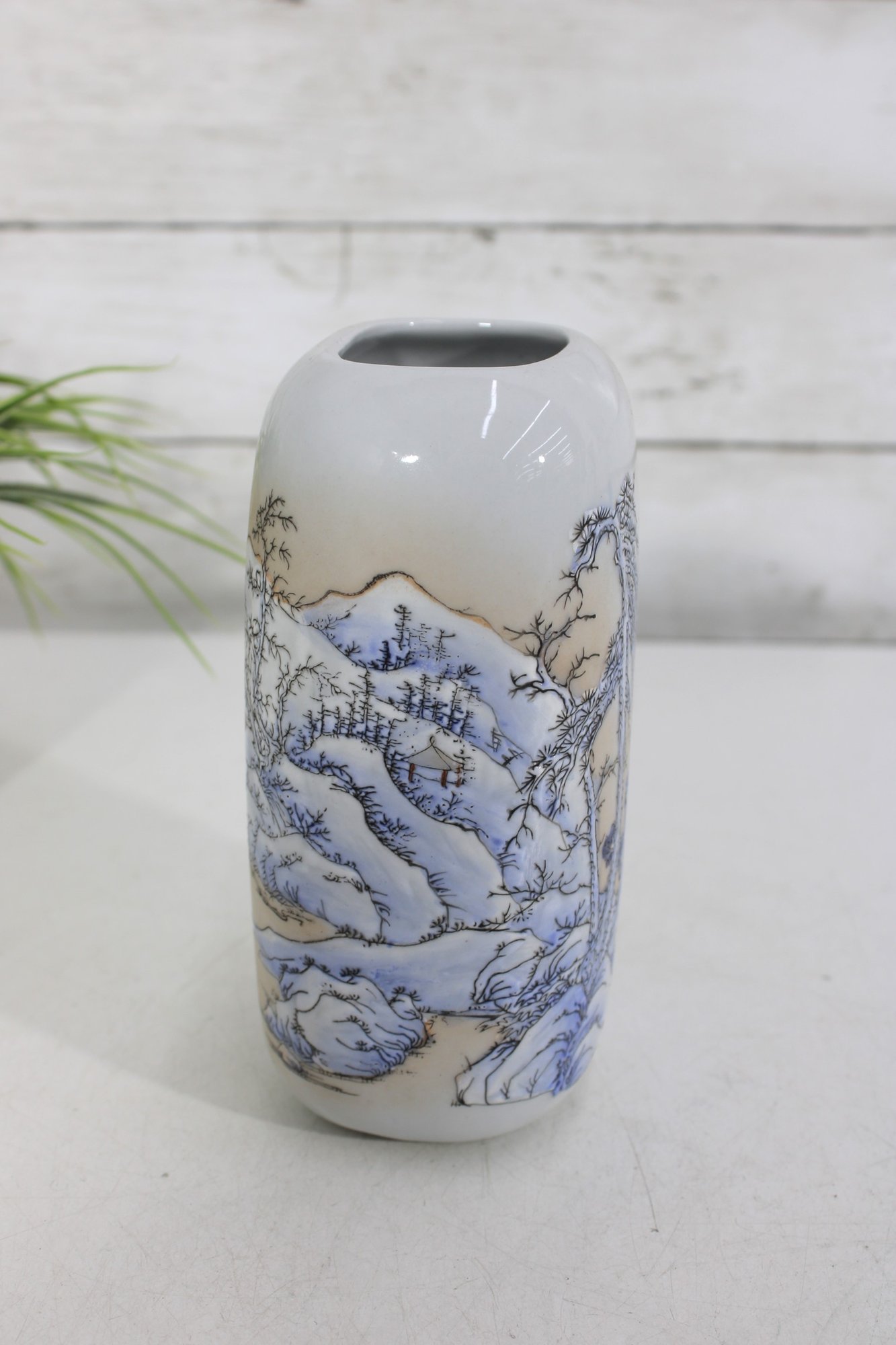 blue and white porcelain vessel featuring a traditional Asian-inspired landscape design with flowing trees and scenic detailing. The soft glazed finish and minimalist rectangular form give this piece a timeless, refined look that complements both modern and classic décor.