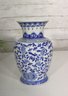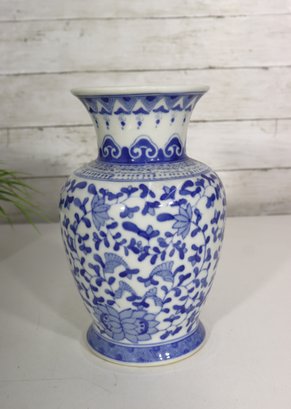 Beautiful blue & white porcelain vase featuring traditional floral vine patterning with decorative band designs around rim and base. Marked on bottom (blue character mark). Classic Chinese style form with flared top opening.