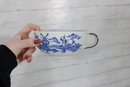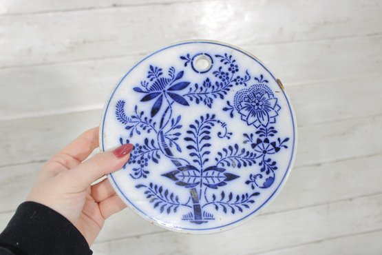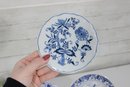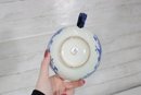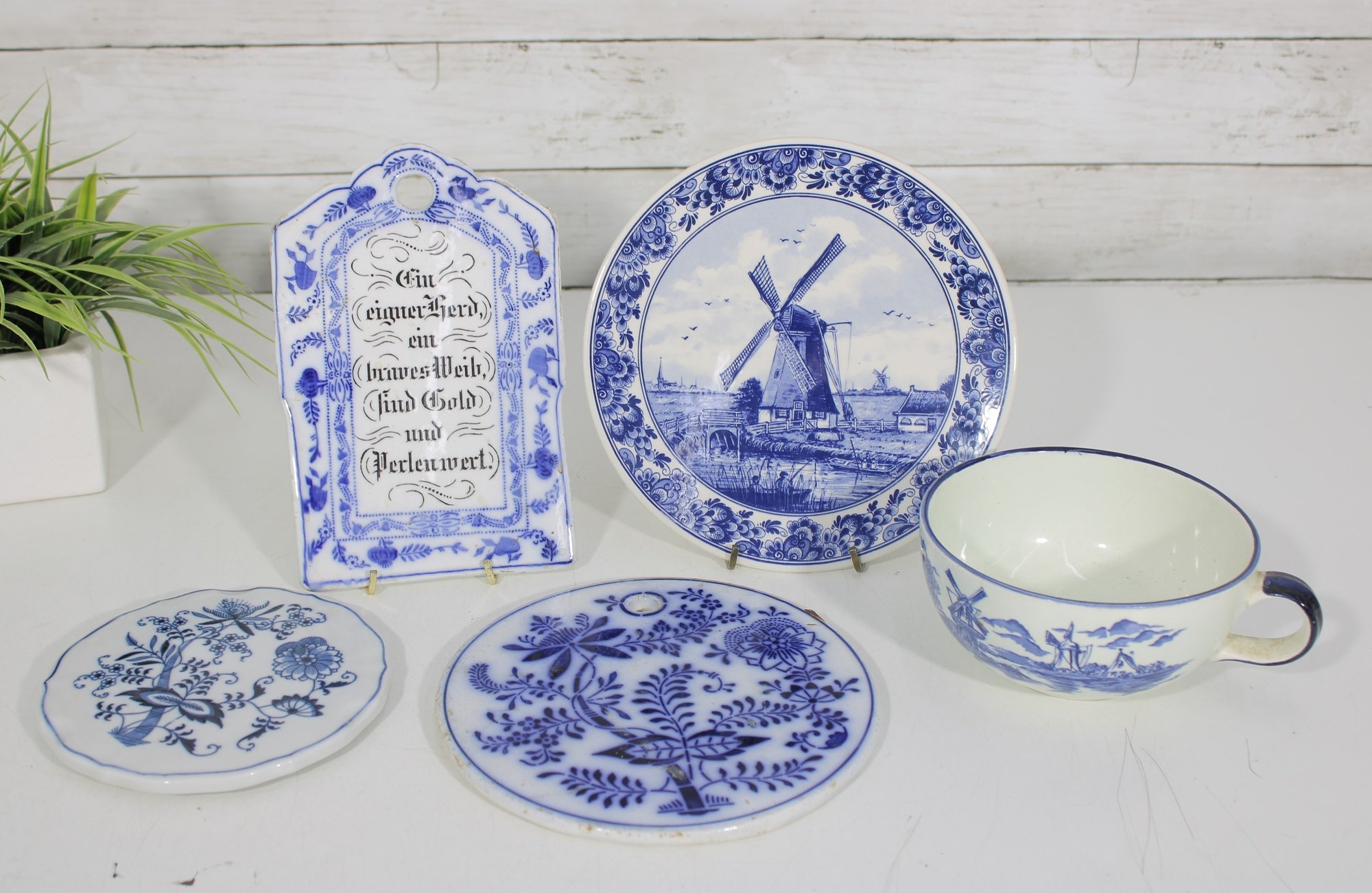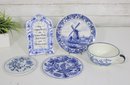 collection of blue and white Delft-style porcelain pieces showcasing classic European decorative motifs. The lot includes five pieces with traditional cobalt blue designs on white porcelain, including floral patterns and a scenic windmill landscape.