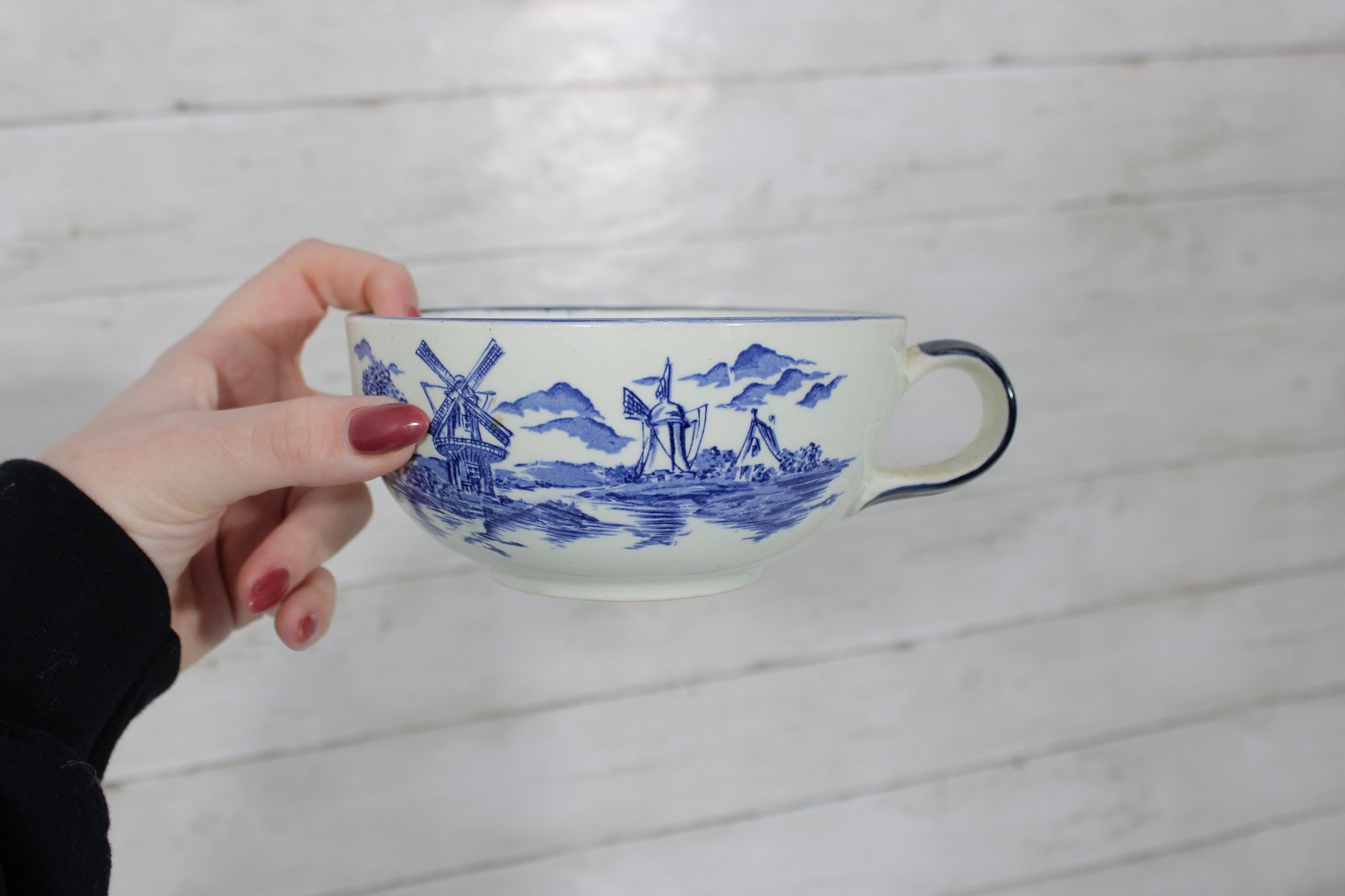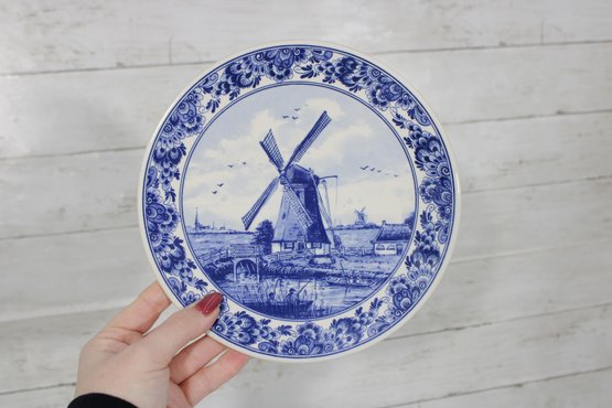 Included in this lot are decorative plates, a wall hanging plaque with German script, and a handled cup featuring a windmill scene. These pieces reflect the timeless Delft-inspired style that is popular with collectors and decorators alike.