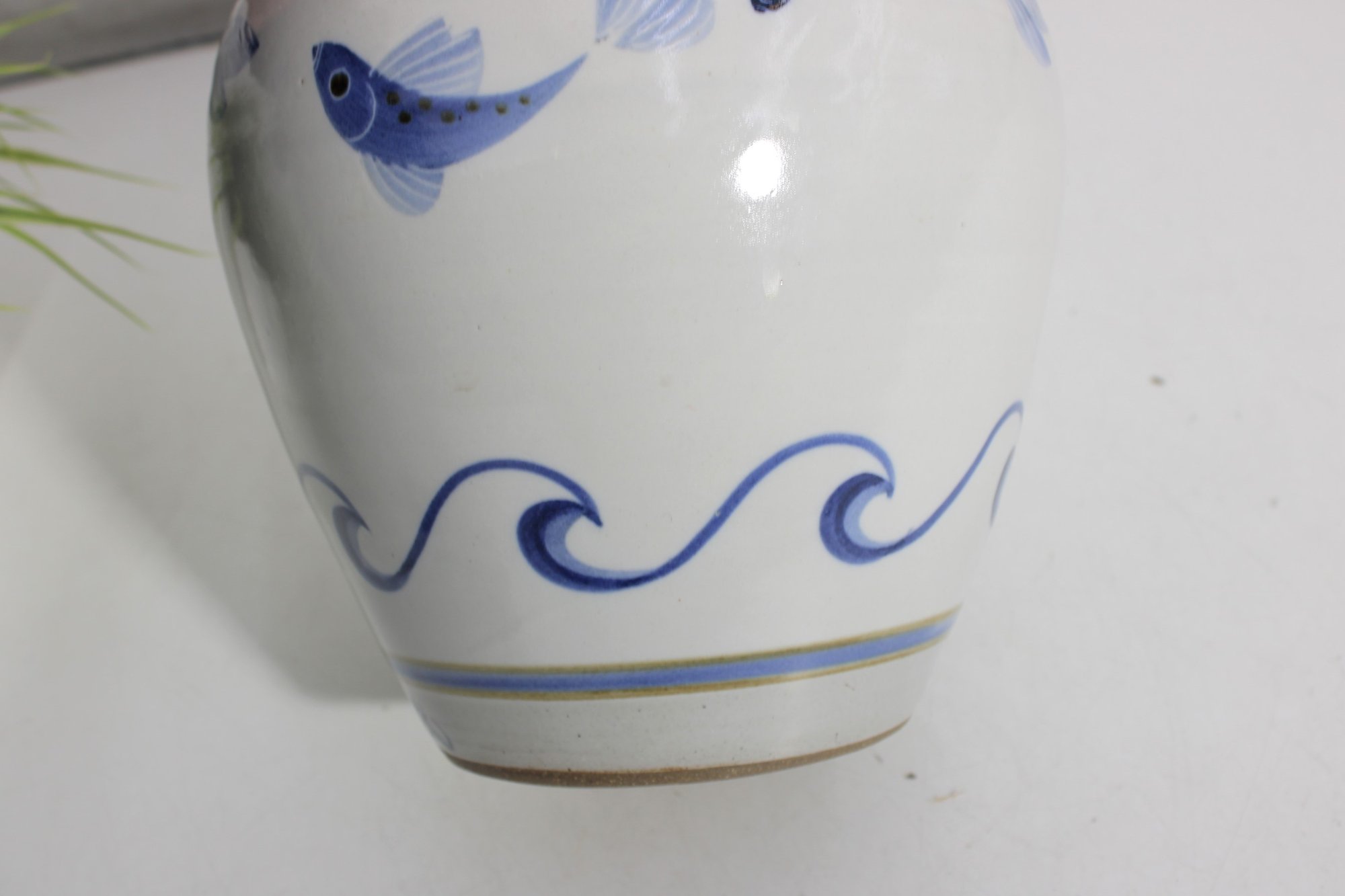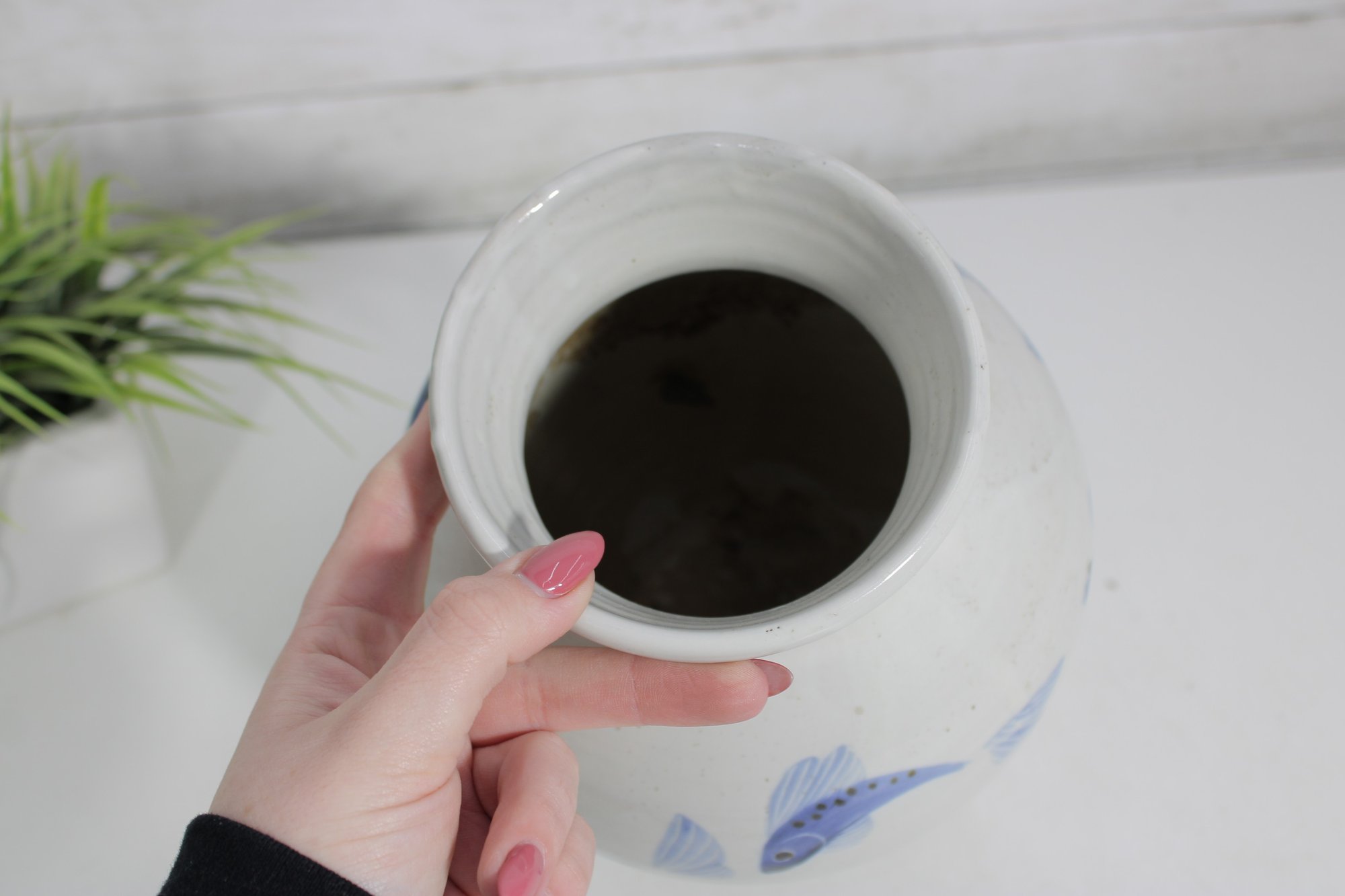 this decorative blue and white ceramic vase. Standing approximately 10 inches tall, this piece features a playful fish motif in soft blue tones, accented with subtle gold trim along the rim and body.
