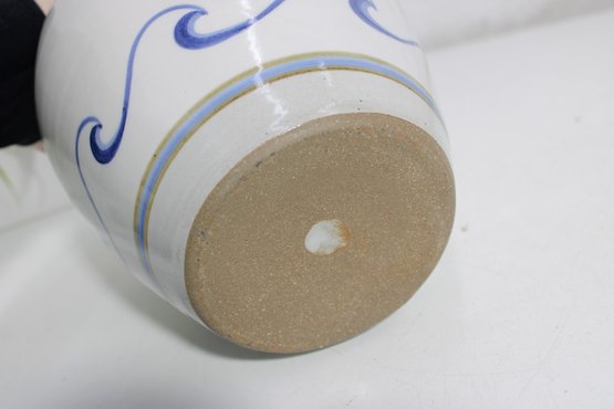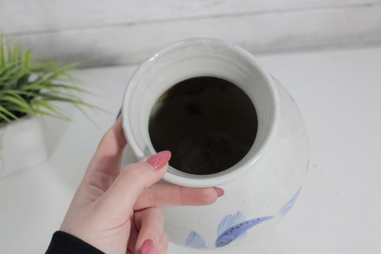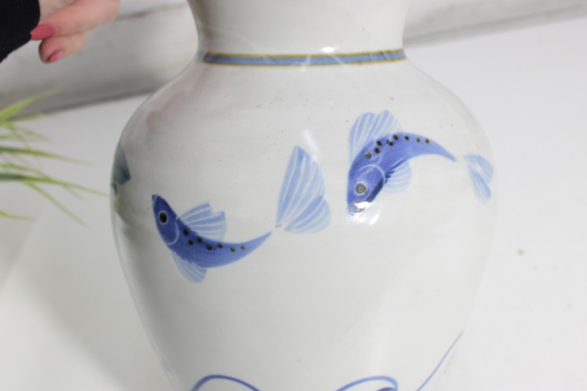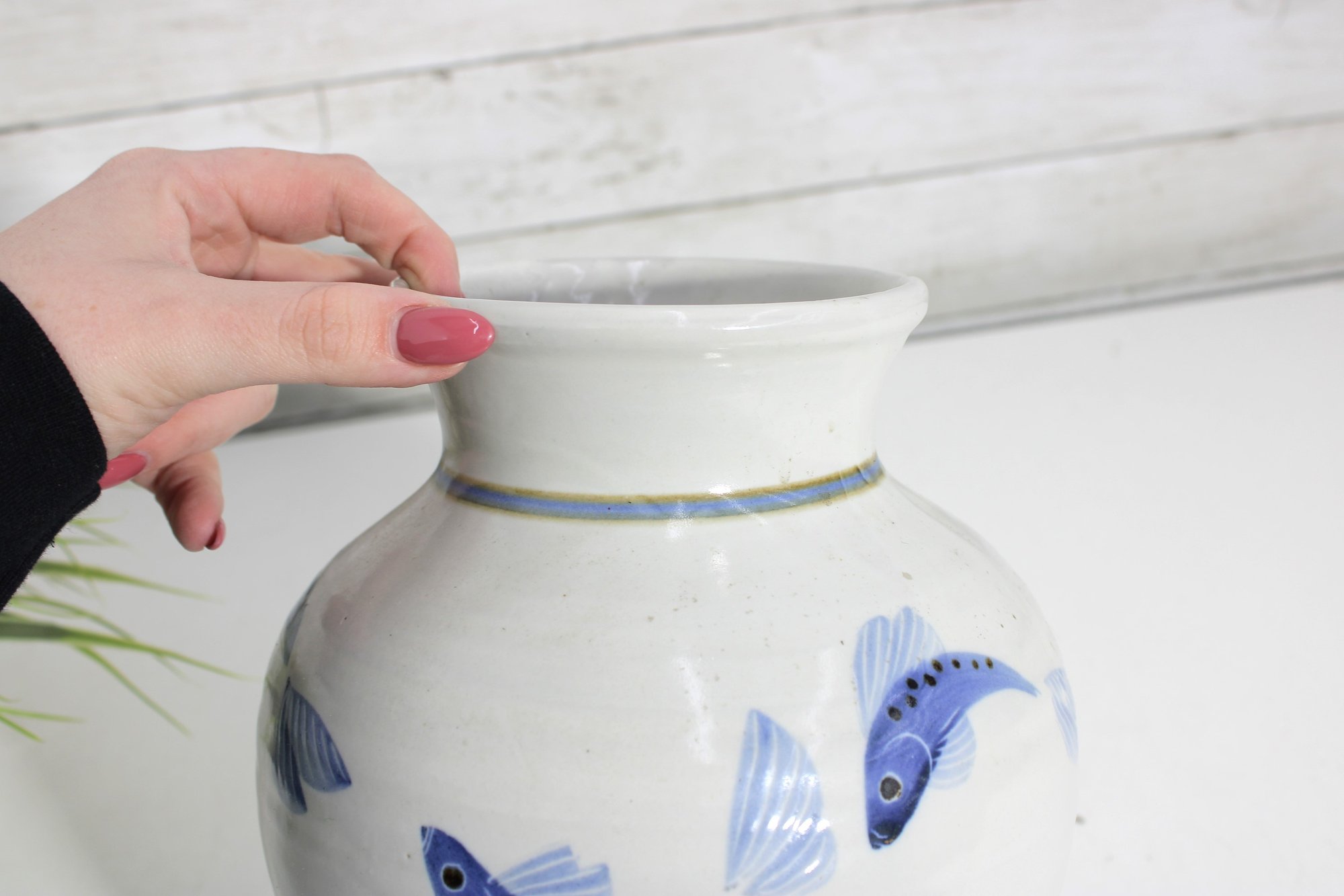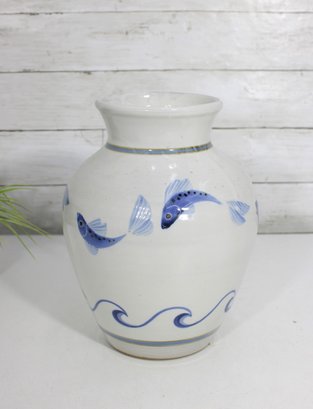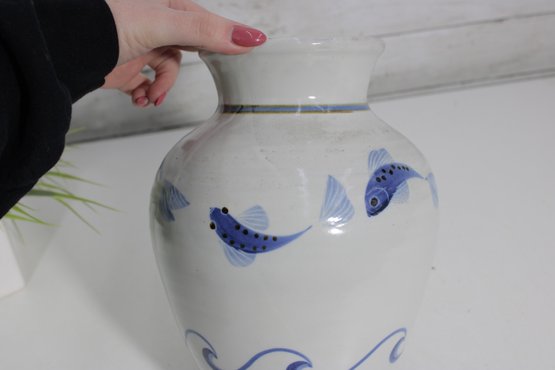 The rounded form and clean white background give it a fresh, nautical-inspired look, perfect for beach house décor, coastal themes, or adding a light, airy feel to any room. The hand-painted style fish and wave designs wrap around the vase, creating visual interest from every angle.