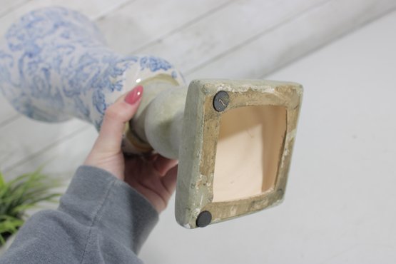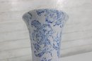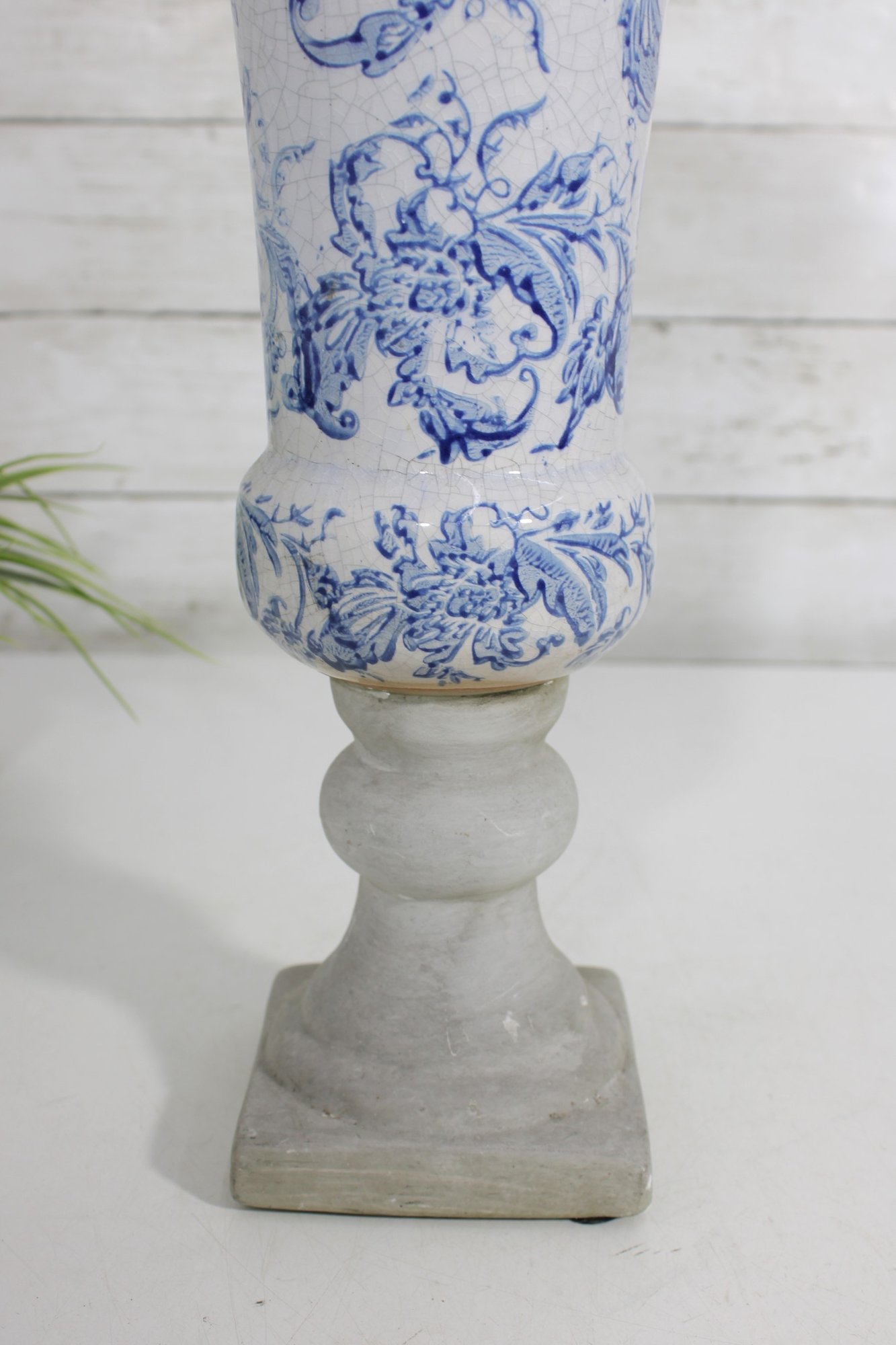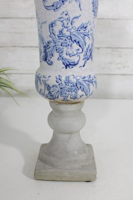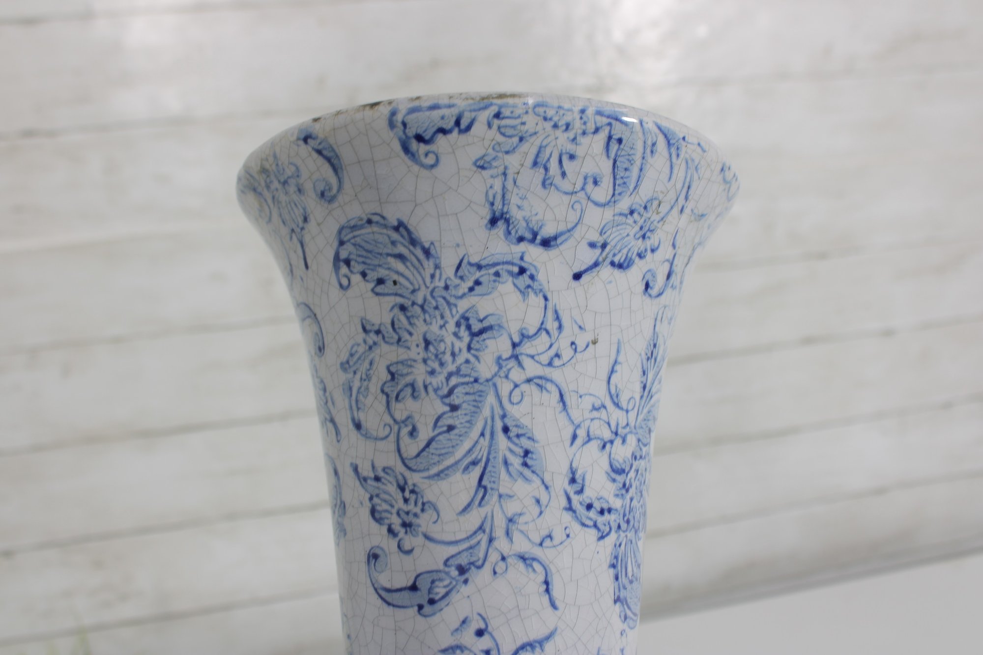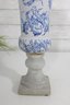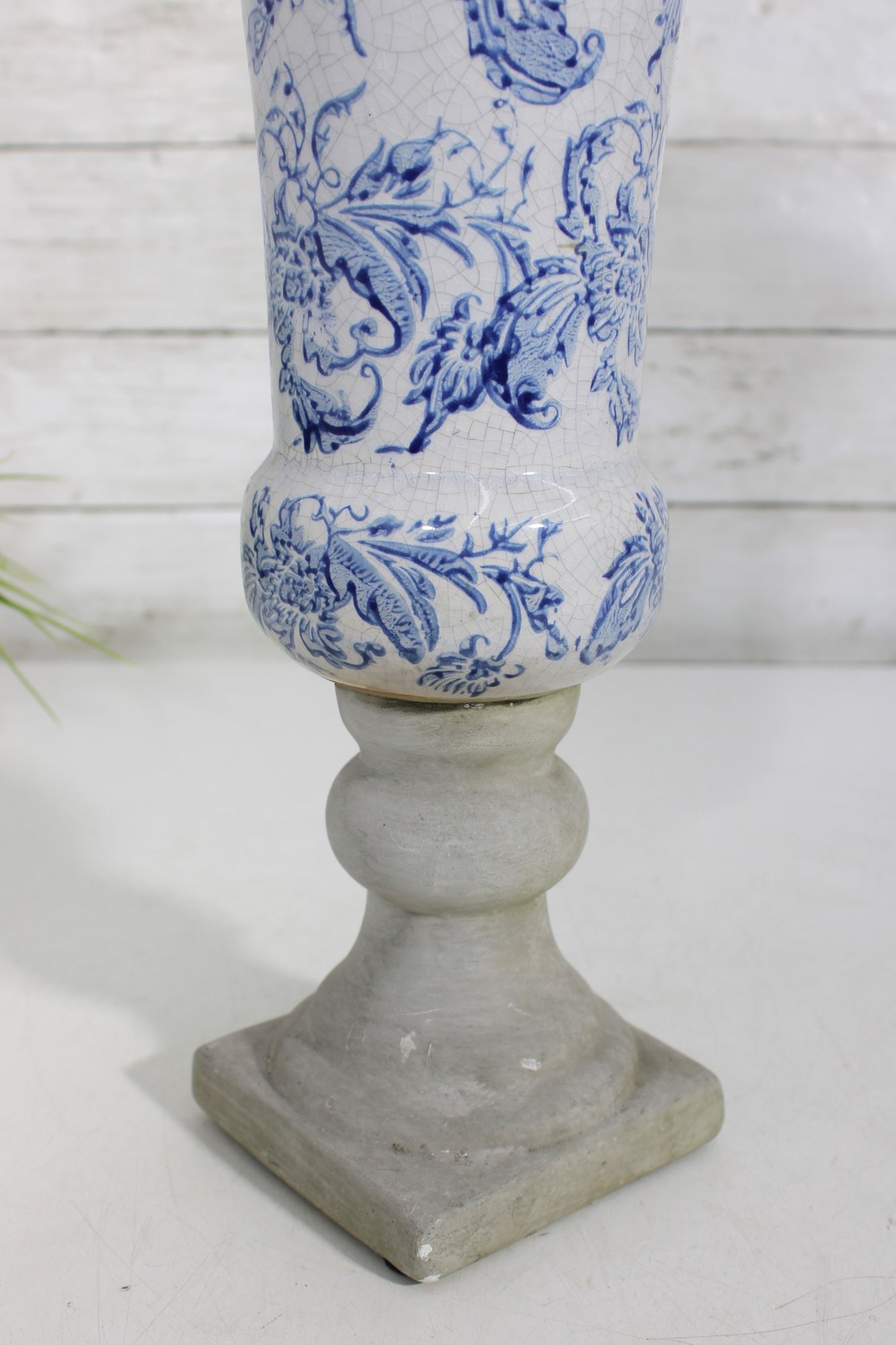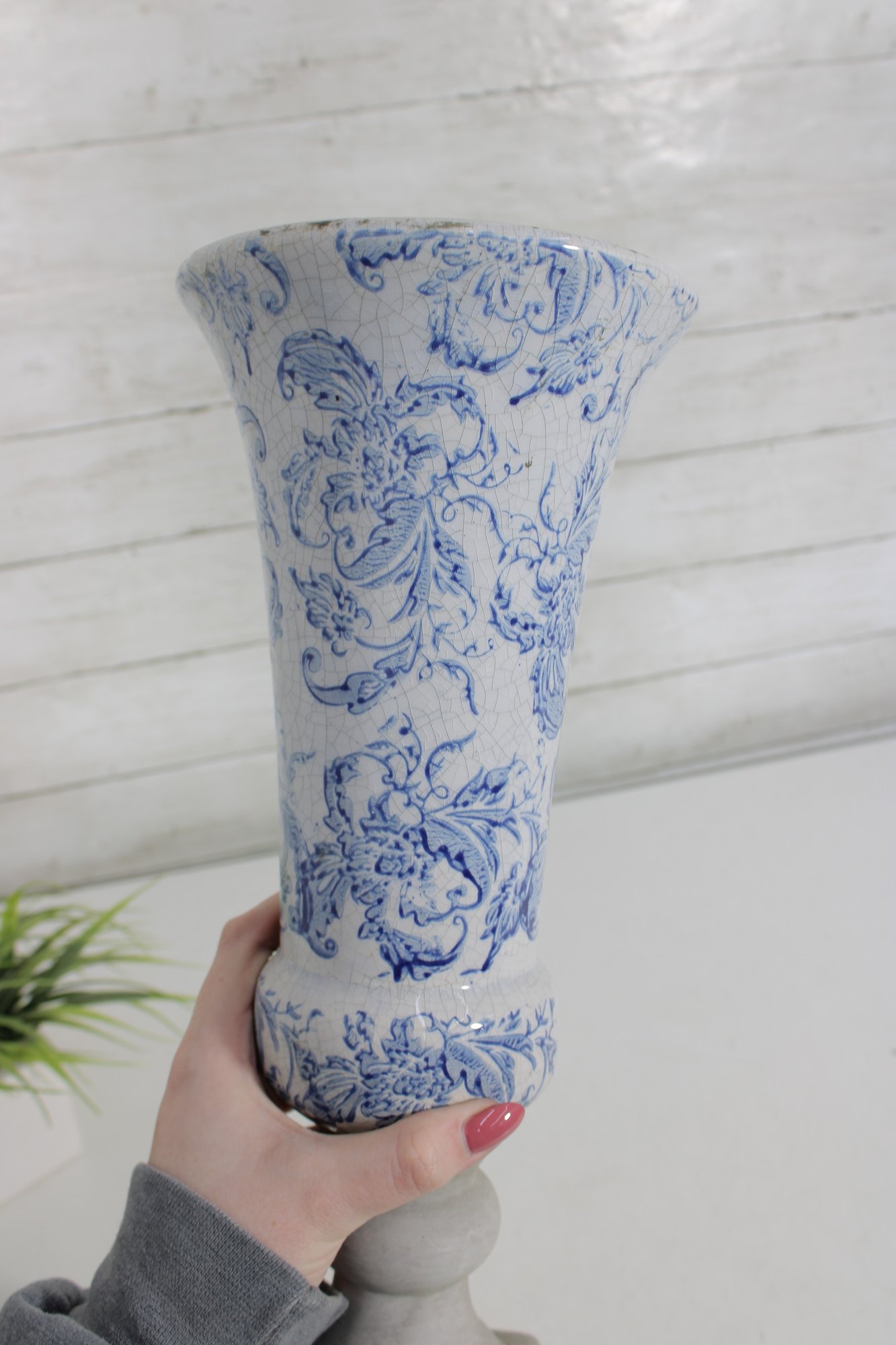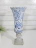 Elegant blue and white ceramic trumpet vase featuring a classic scrolling floral motif, reminiscent of traditional European or Delft-style designs. The flared form rises gracefully from a turned pedestal stem and square base, giving the piece a refined, architectural presence.