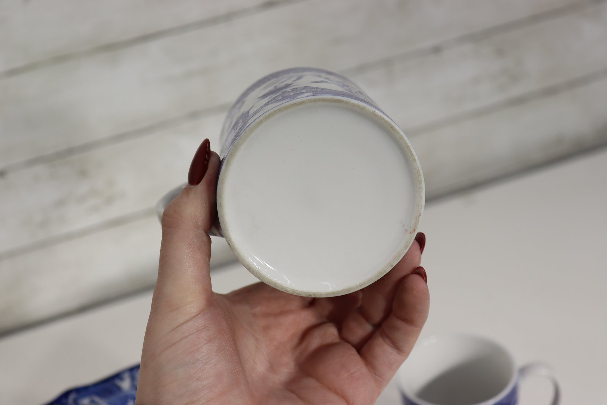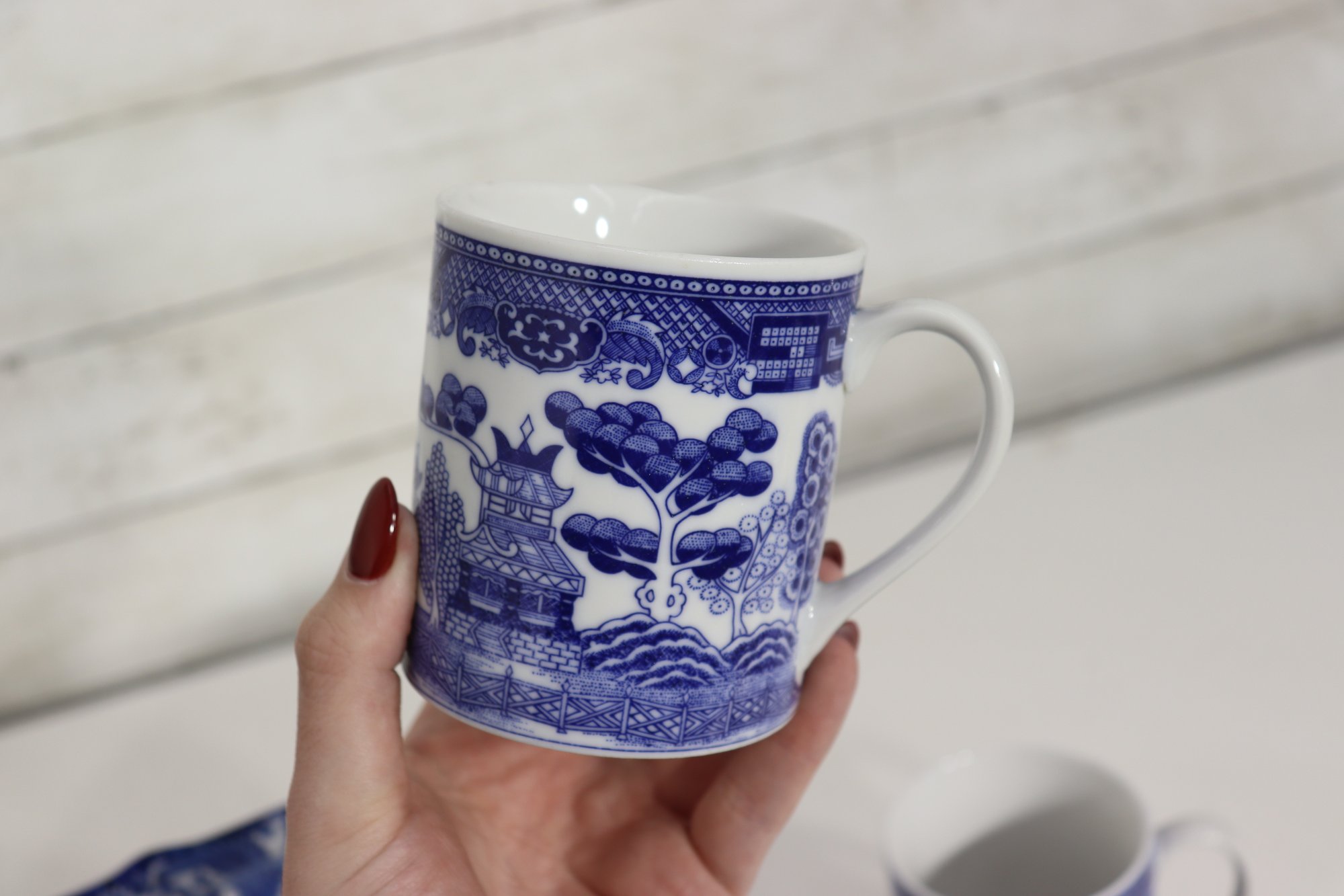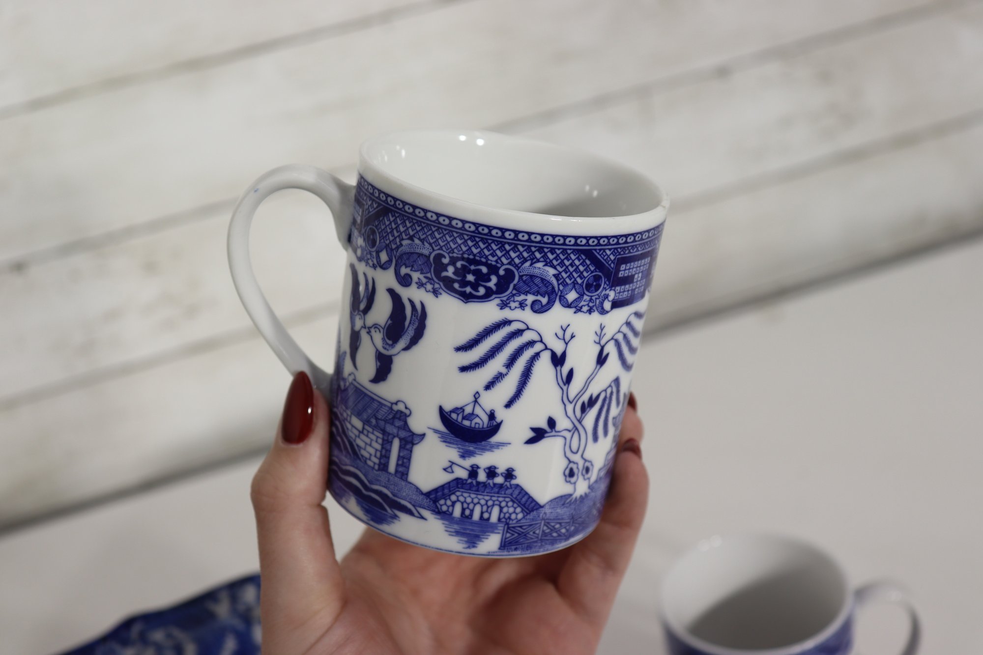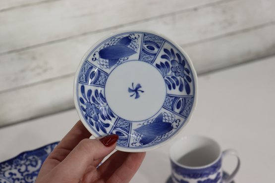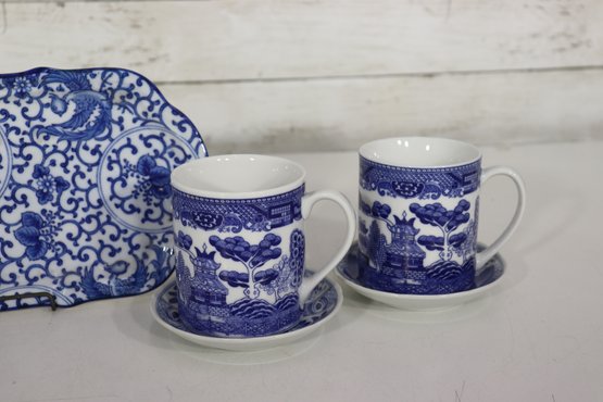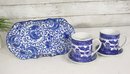 The mugs feature traditional pagoda, tree, and bridge scenes, while the serving tray displays a floral and bird pattern bordered with scrolling accents — making this set a striking display of artistry and craftsmanship.