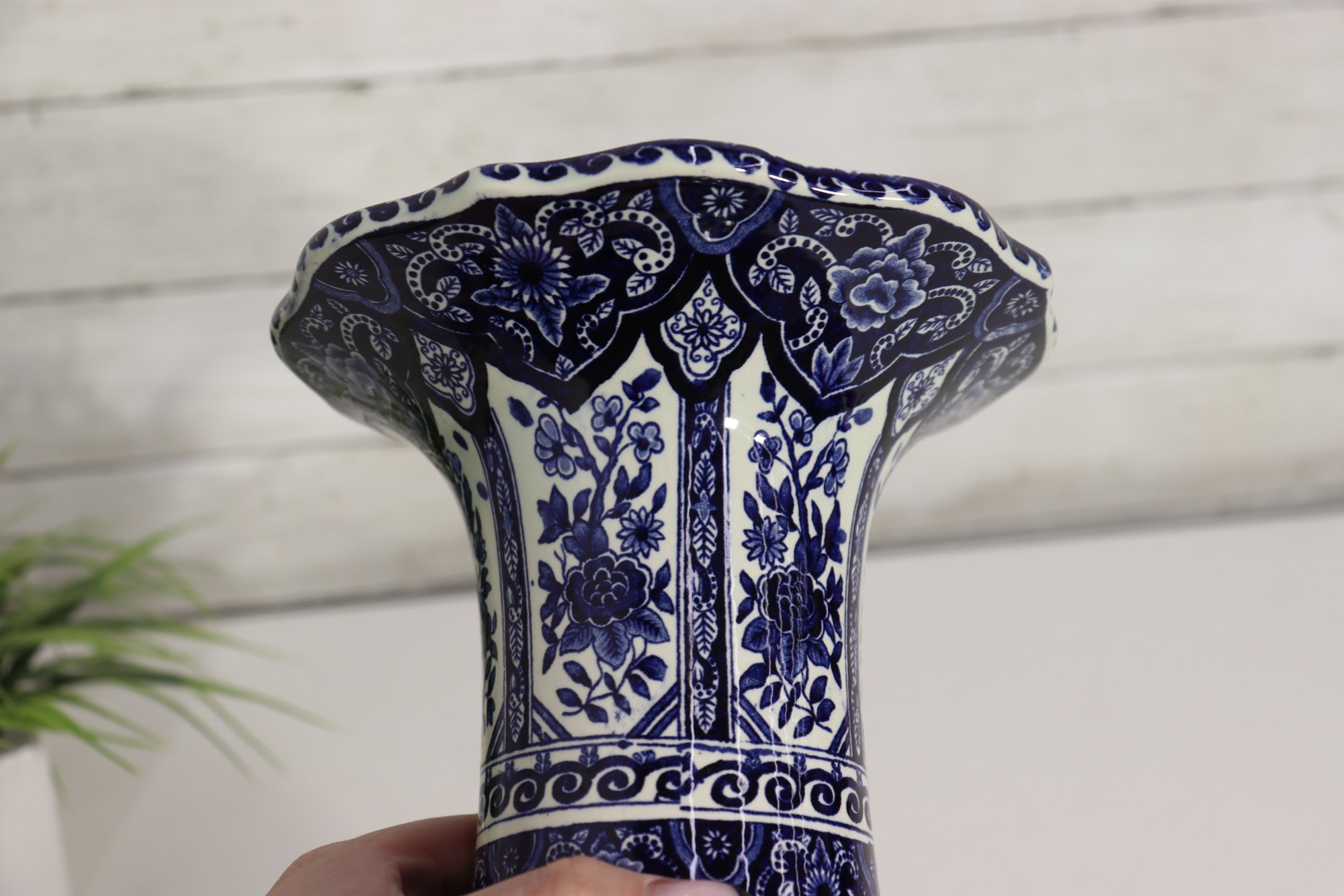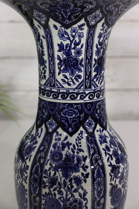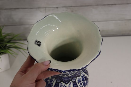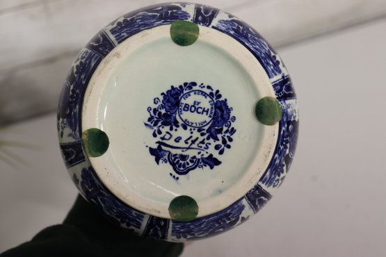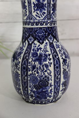 Beautiful Boch Frères Keramis Delft-style vase, standing approximately 12 inches tall, featuring a classic blue and white floral design with intricate scrolling and geometric borders. This elegant piece displays the timeless beauty of Belgian faience pottery, inspired by traditional Dutch Delftware craftsmanship.