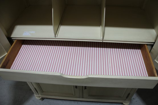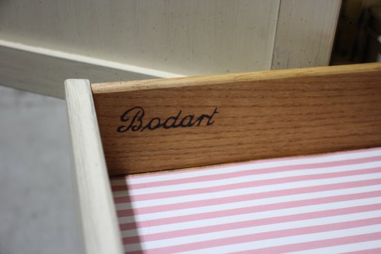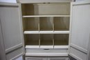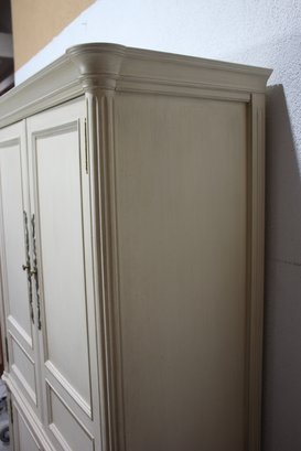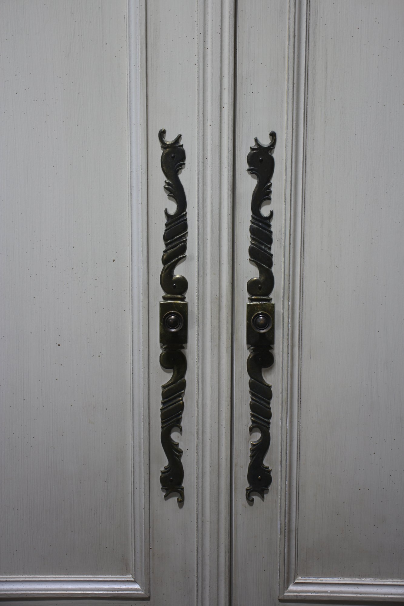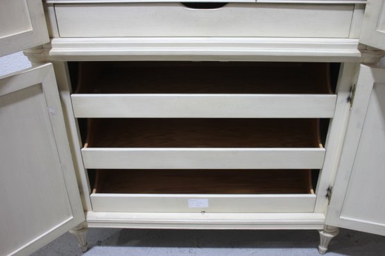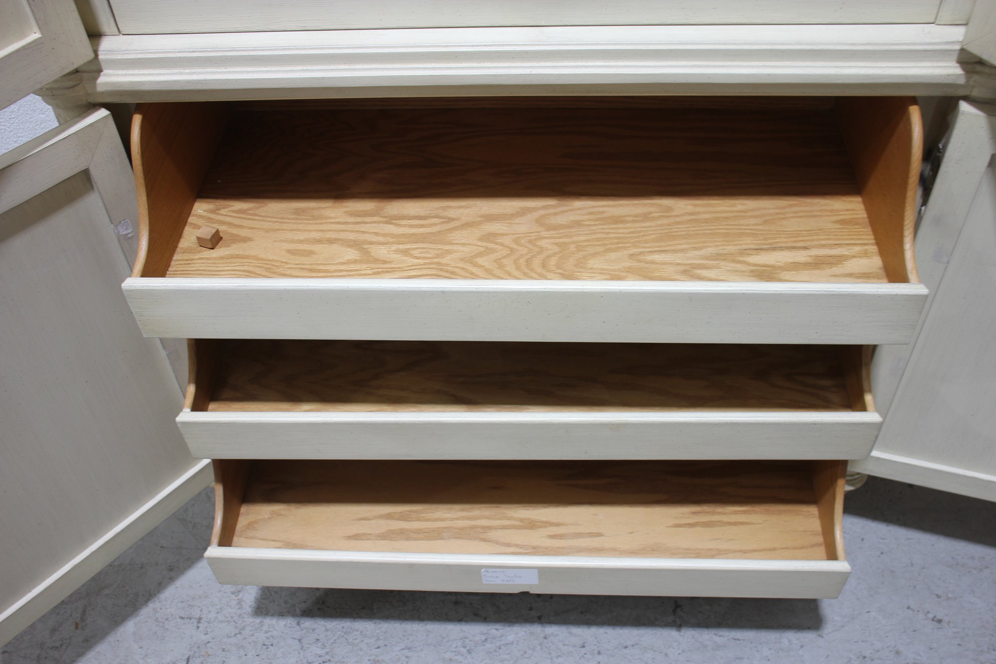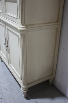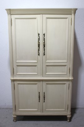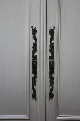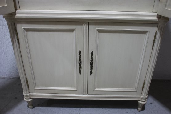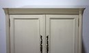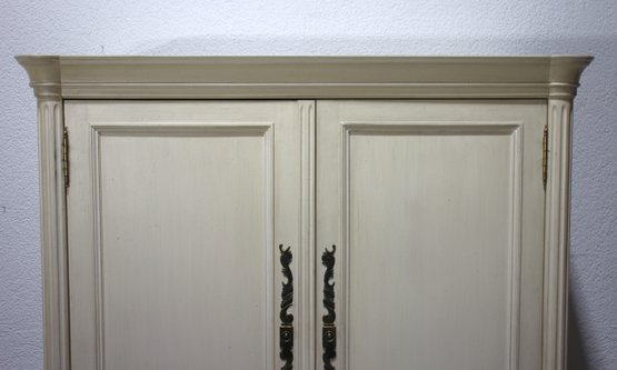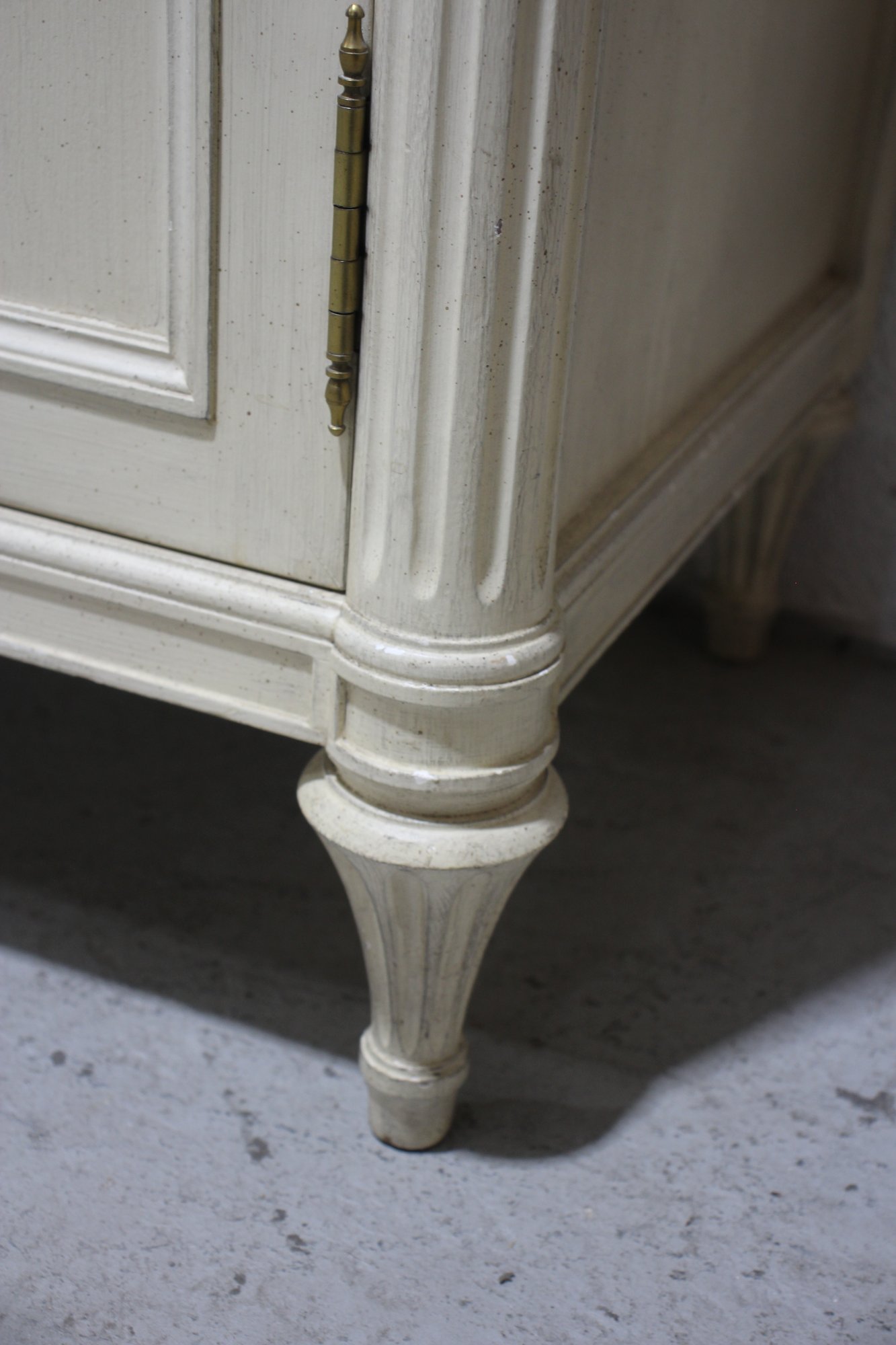 This exquisite Bodart French Provincial armoire exudes timeless elegance with its distressed cream finish, fluted columns, and ornate brass handles. Crafted with classic French styling, this piece is both a beautiful storage solution and a statement piece for any home.