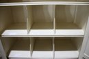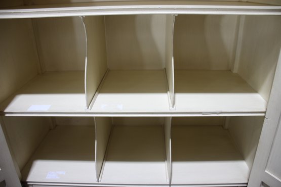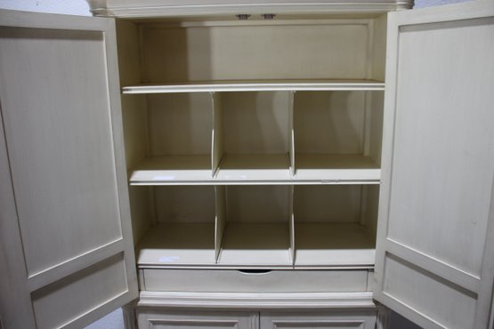 Measuring 73 inches high, 41 inches wide, and 19 inches deep, the armoire features upper and lower double doors that open to reveal ample storage compartments. The upper section includes multiple cubbies and a lined drawer, ideal for organizing linens, accessories, or small household items. The lower section has three deep pull-out drawers, providing additional concealed storage.