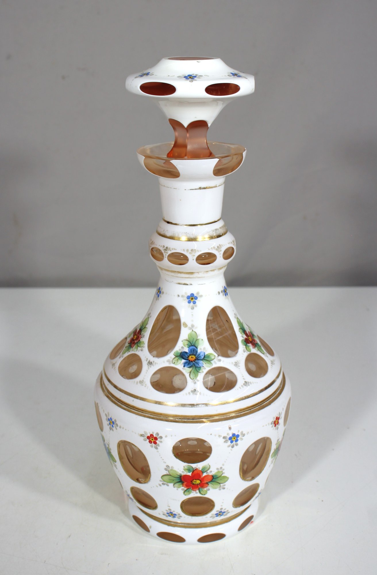 A stunning 12.5" tall hand-painted glass decanter featuring a classic Bohemian design. This exquisite piece is adorned with intricate cut-to-amber oval patterns, accented by vibrant floral motifs in blue, red, and green, along with delicate gold detailing throughout. The matching stopper enhances its elegance, completing the decanter's sophisticated look.