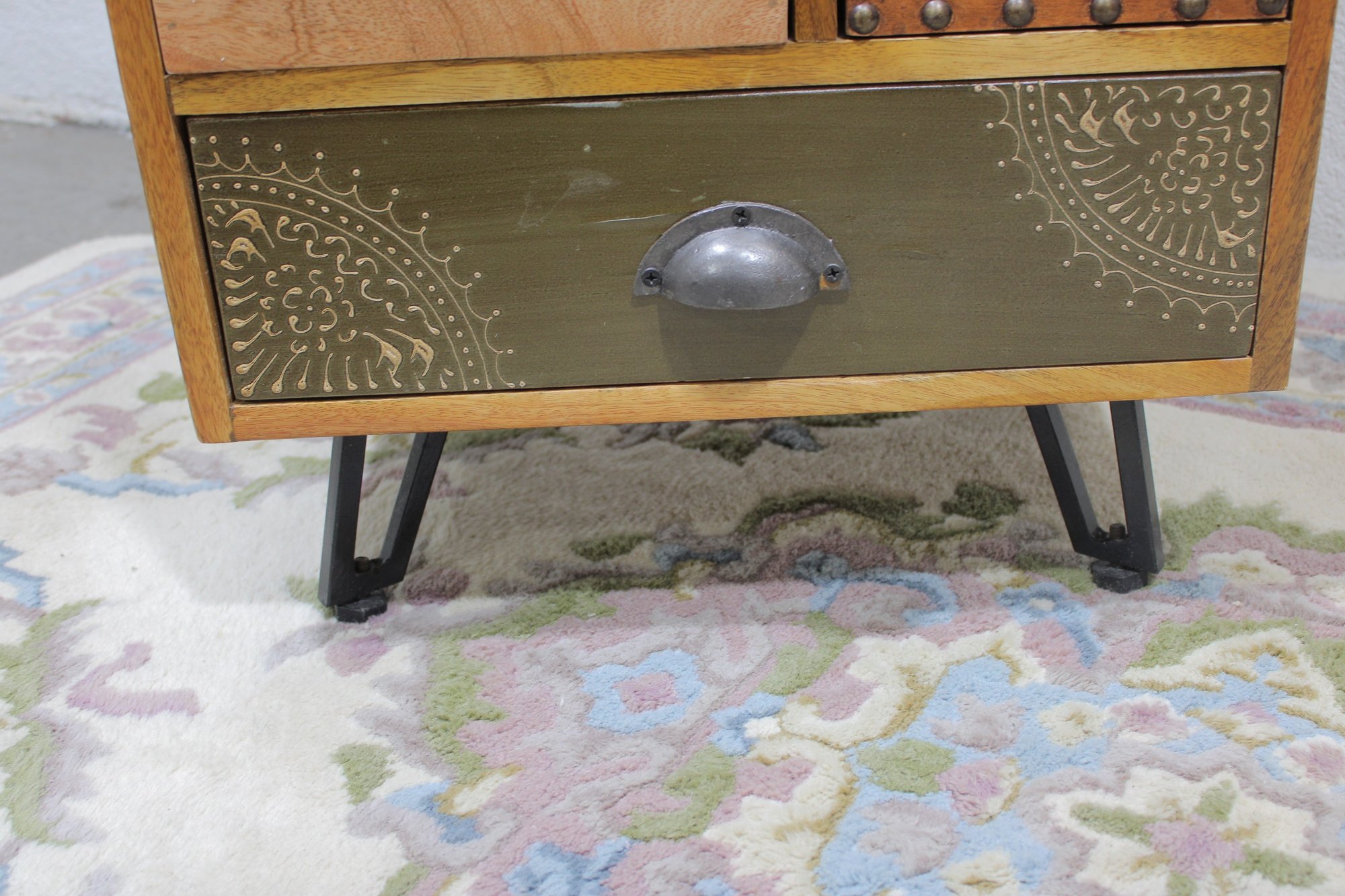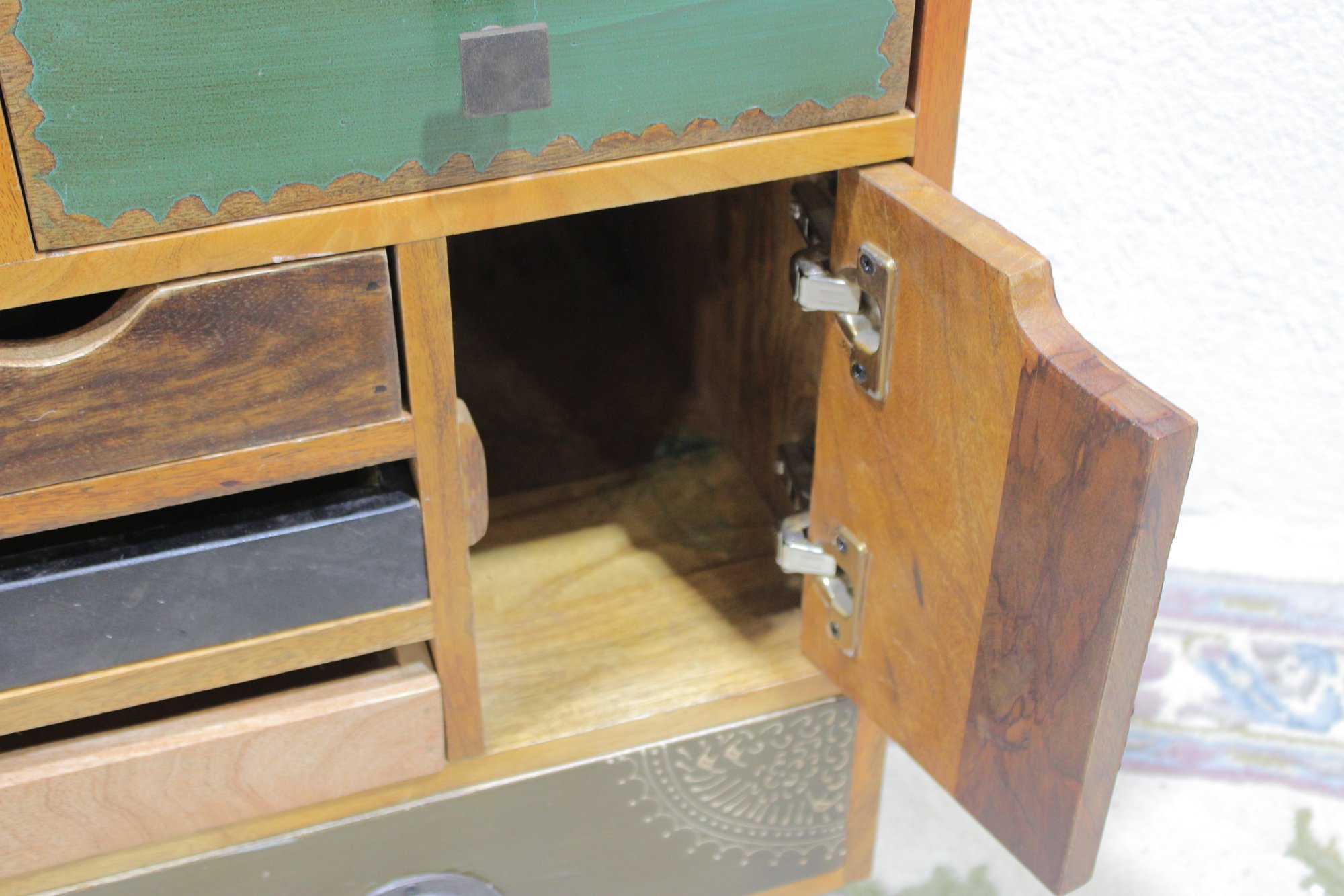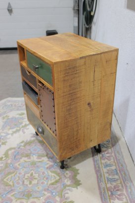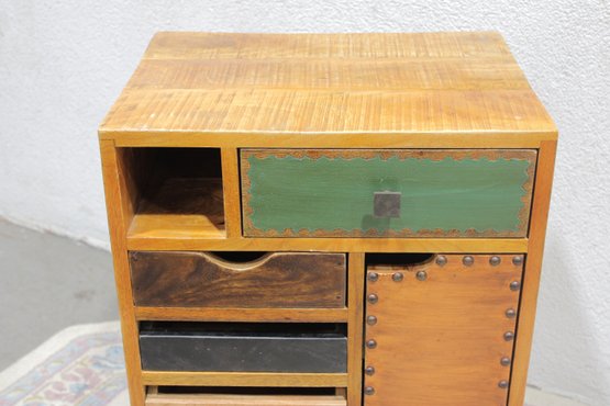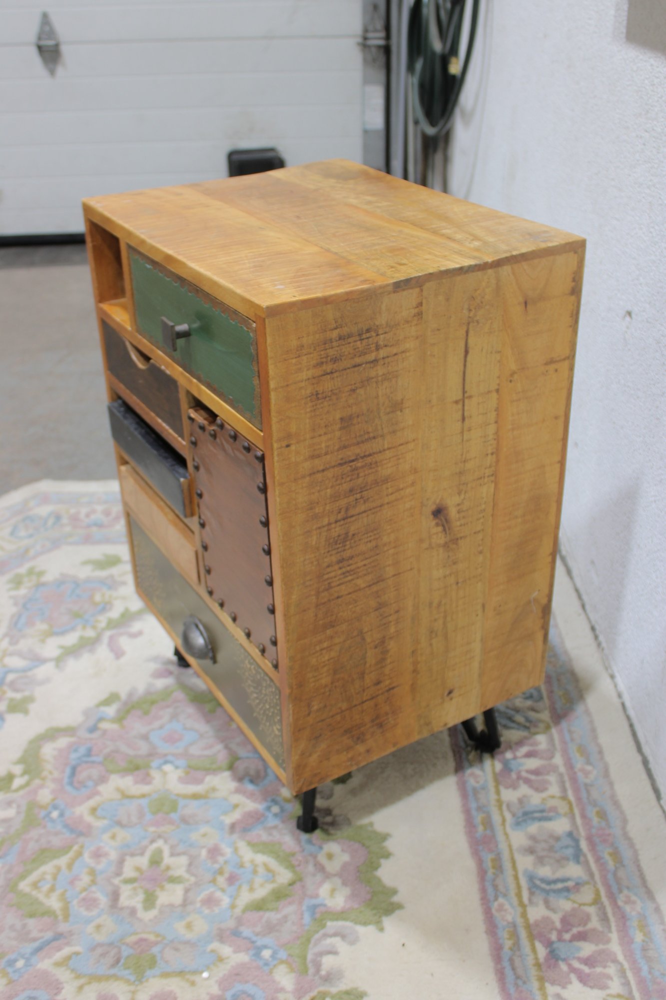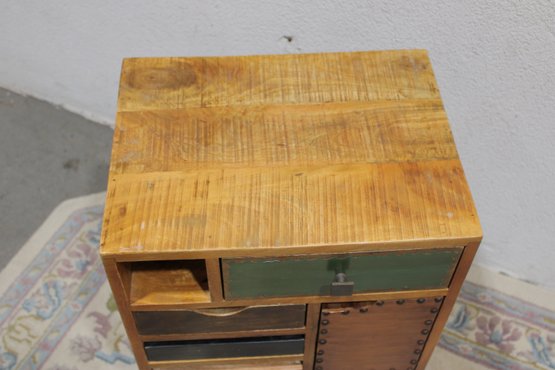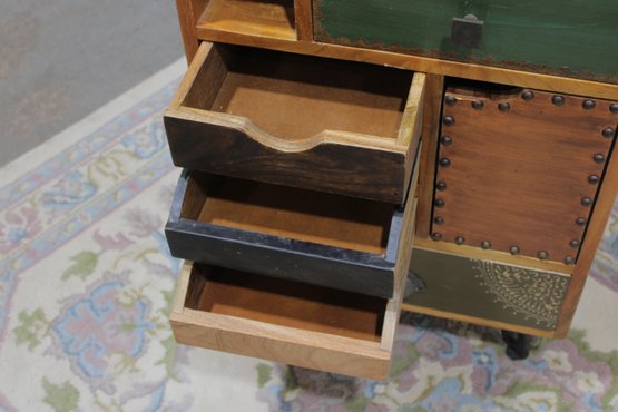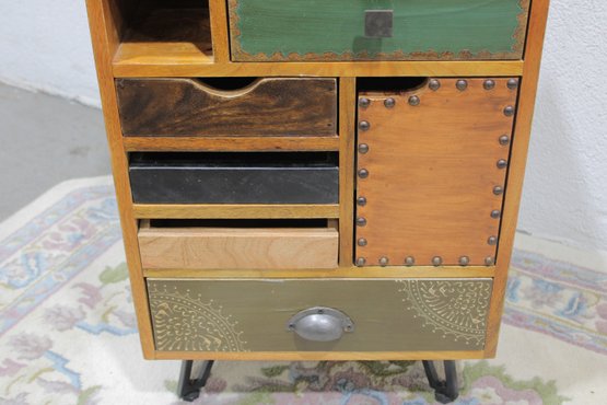 Eclectic accent cabinet featuring a mixed wood construction with assorted drawer fronts, a small cabinet door, open cubby storage, and decorative metal accents. The varied finishes and hardware give this piece a boho-industrial or rustic patchwork look, making it a distinctive storage option for a bedroom, living room, entryway, or office. Set on angled black metal legs for added character.