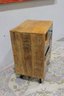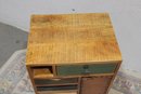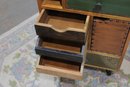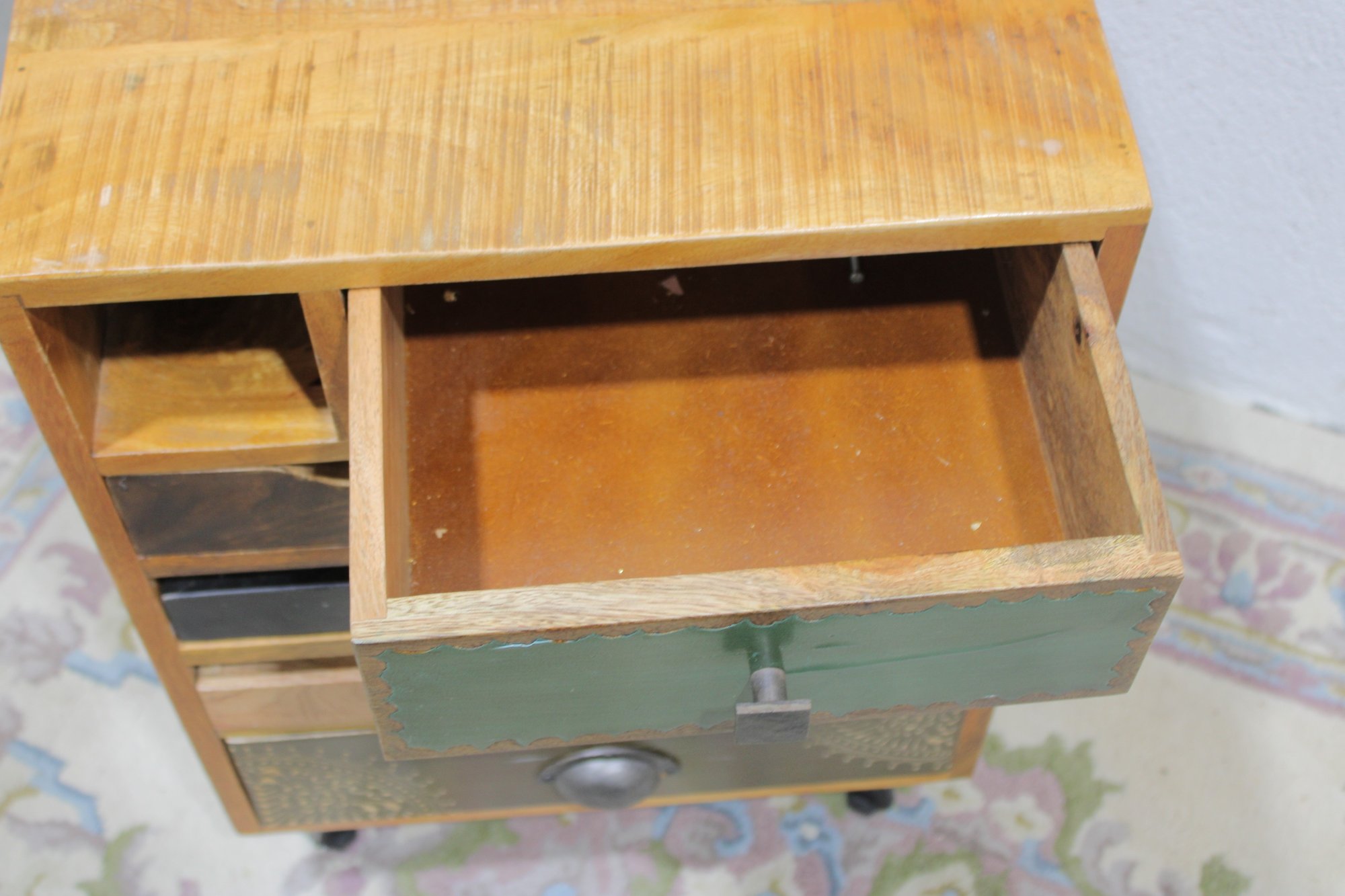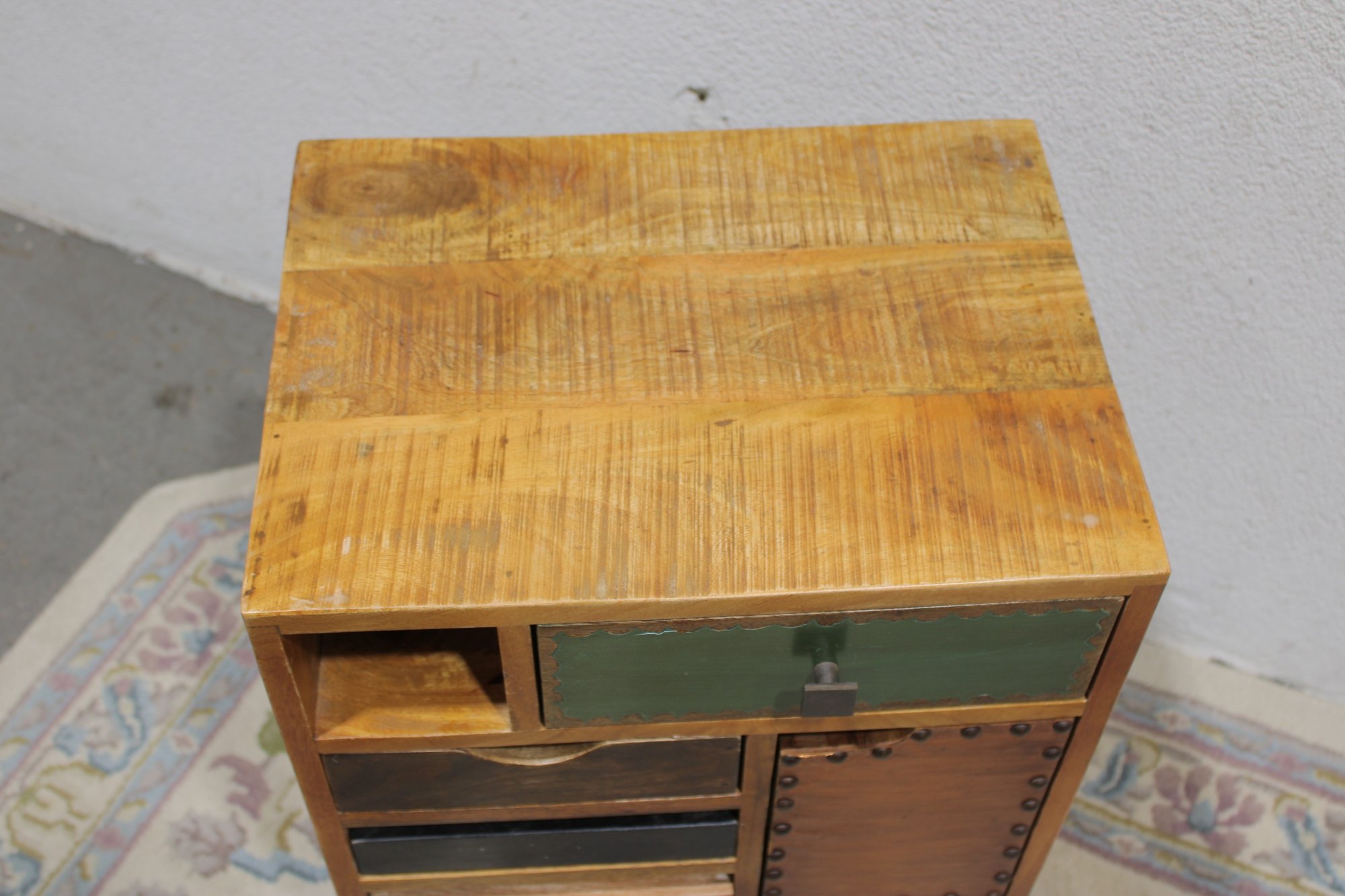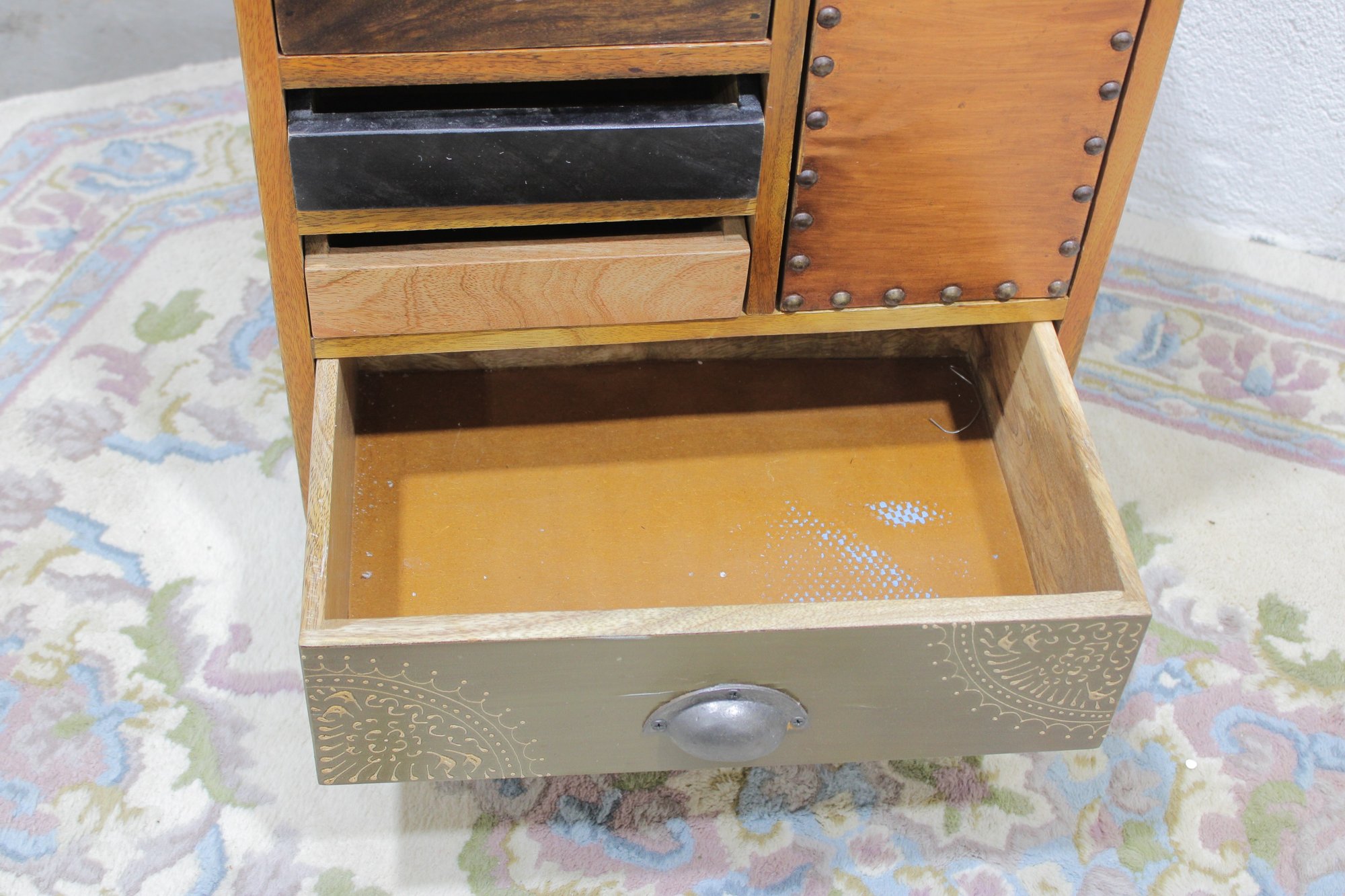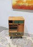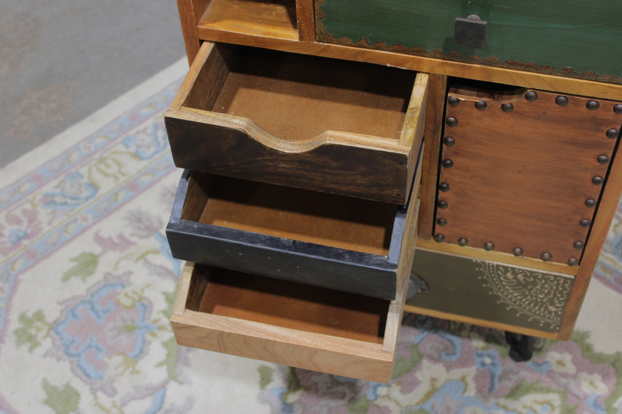 Eclectic accent cabinet featuring a mixed wood construction with assorted drawer fronts, a small cabinet door, open cubby storage, and decorative metal accents. The varied finishes and hardware give this piece a boho-industrial or rustic patchwork look, making it a distinctive storage option for a bedroom, living room, entryway, or office. Set on angled black metal legs for added character.