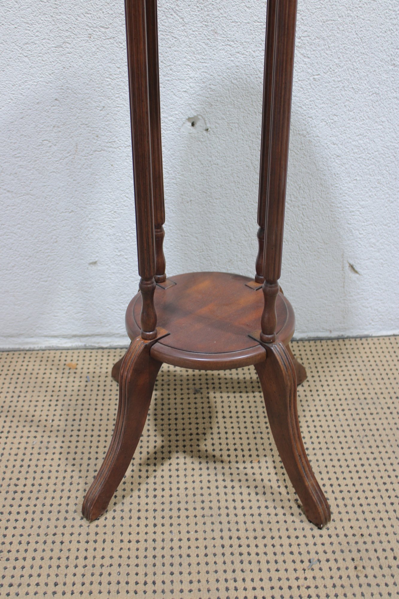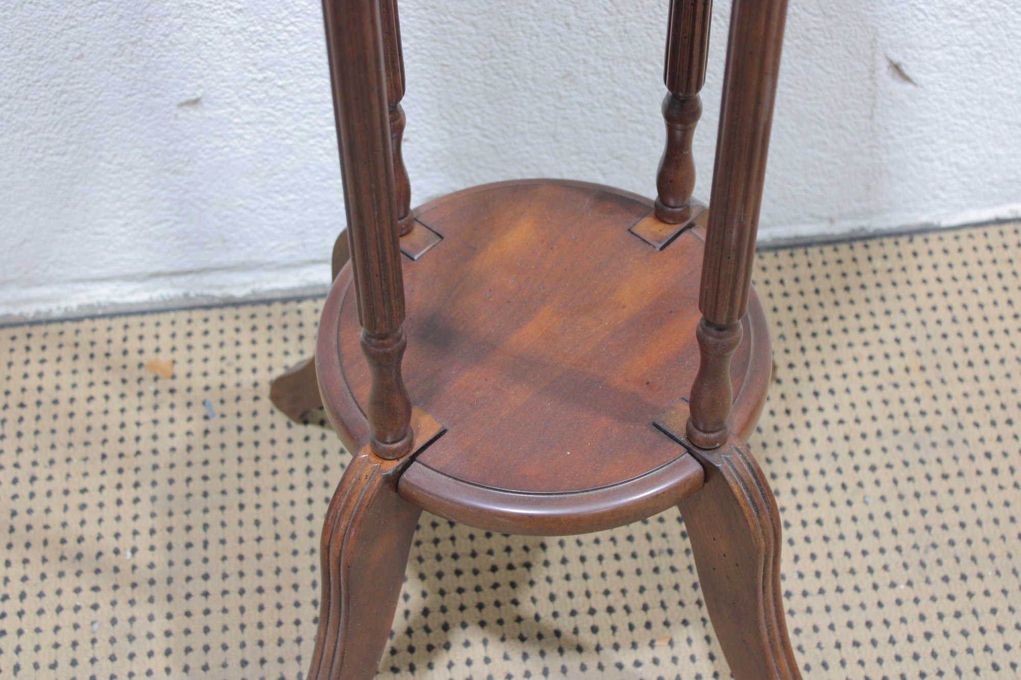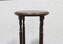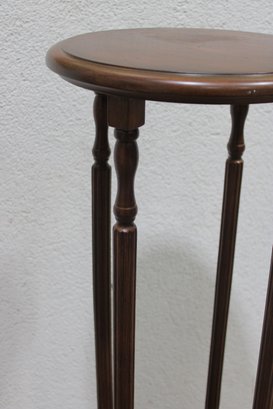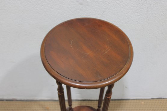 Crafted in a rich, warm wood tone, this stand features a round top, gracefully turned vertical supports, and a lower display shelf. The curved legs and classic proportions give it a traditional, refined look that blends beautifully with vintage, traditional, or transitional décor.