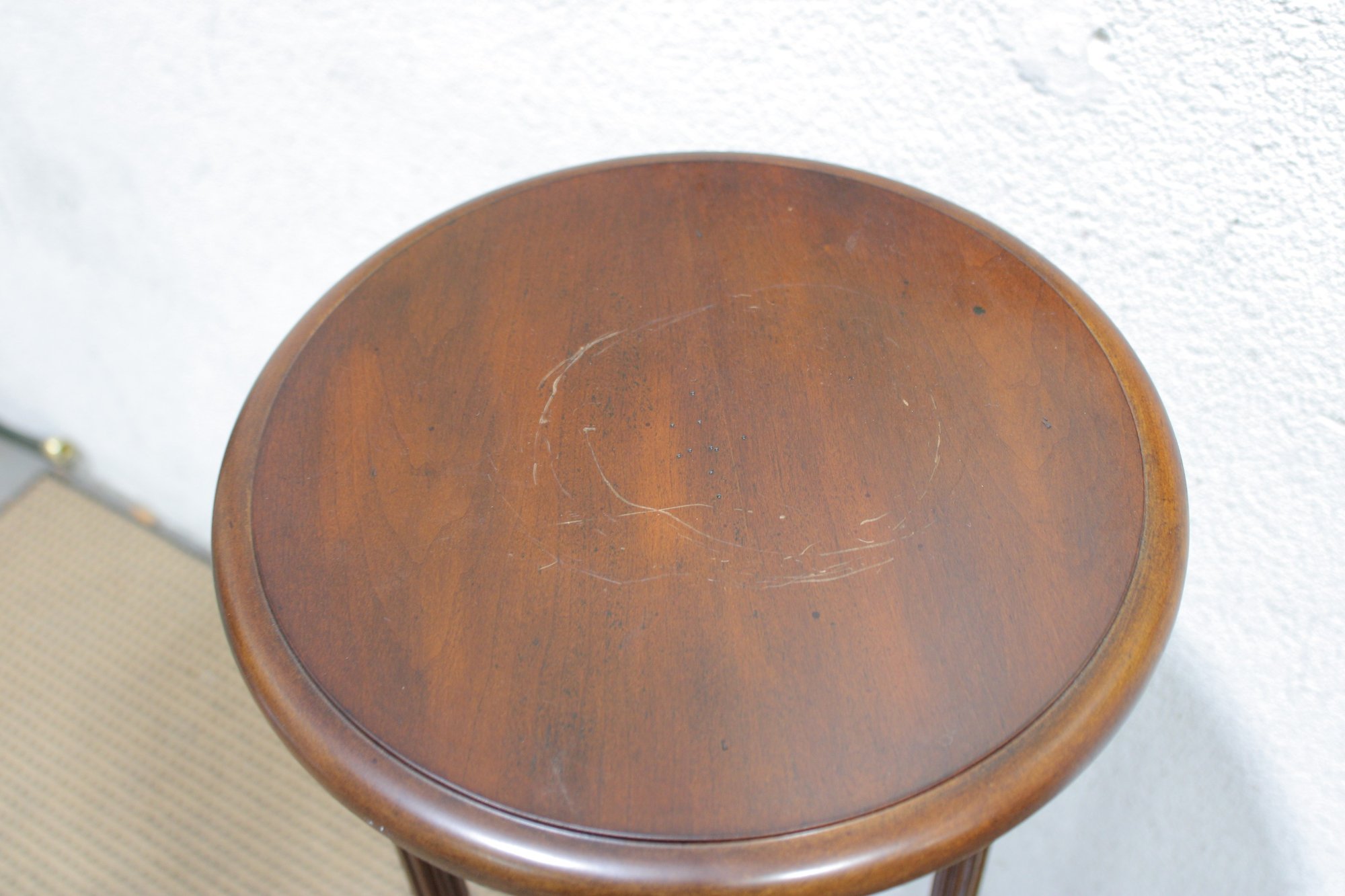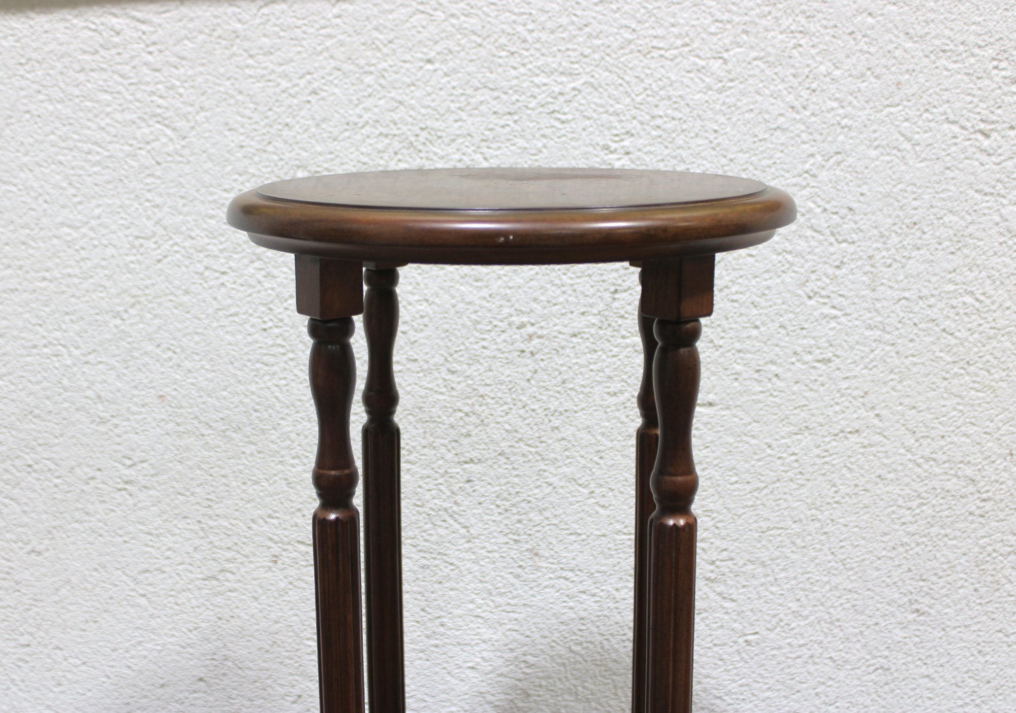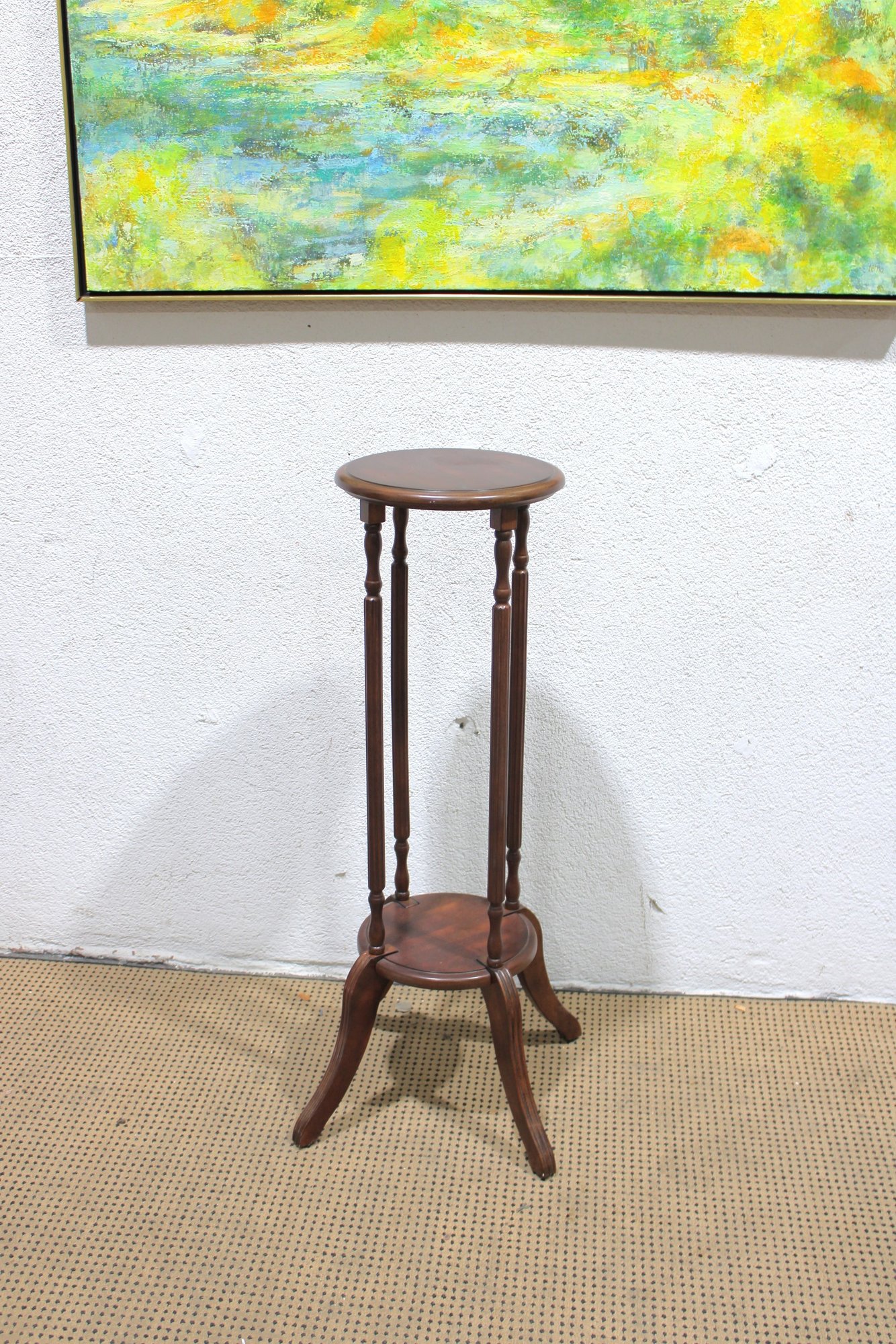Crafted in a rich, warm wood tone, this stand features a round top, gracefully turned vertical supports, and a lower display shelf. The curved legs and classic proportions give it a traditional, refined look that blends beautifully with vintage, traditional, or transitional décor.