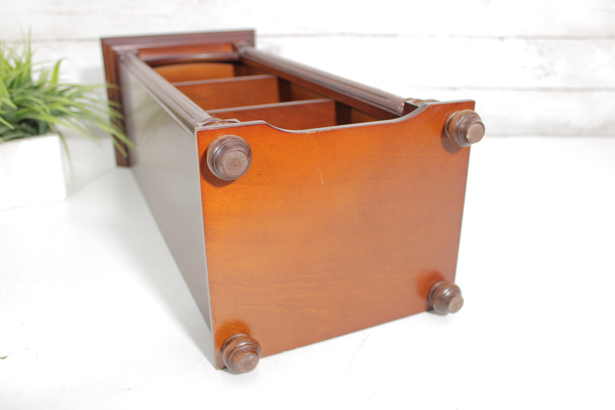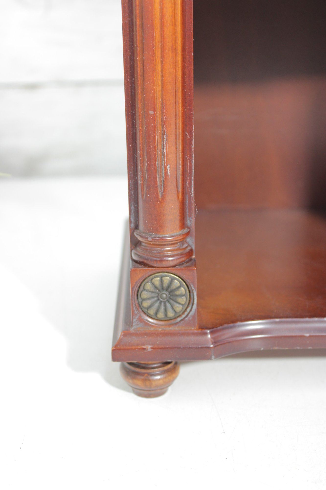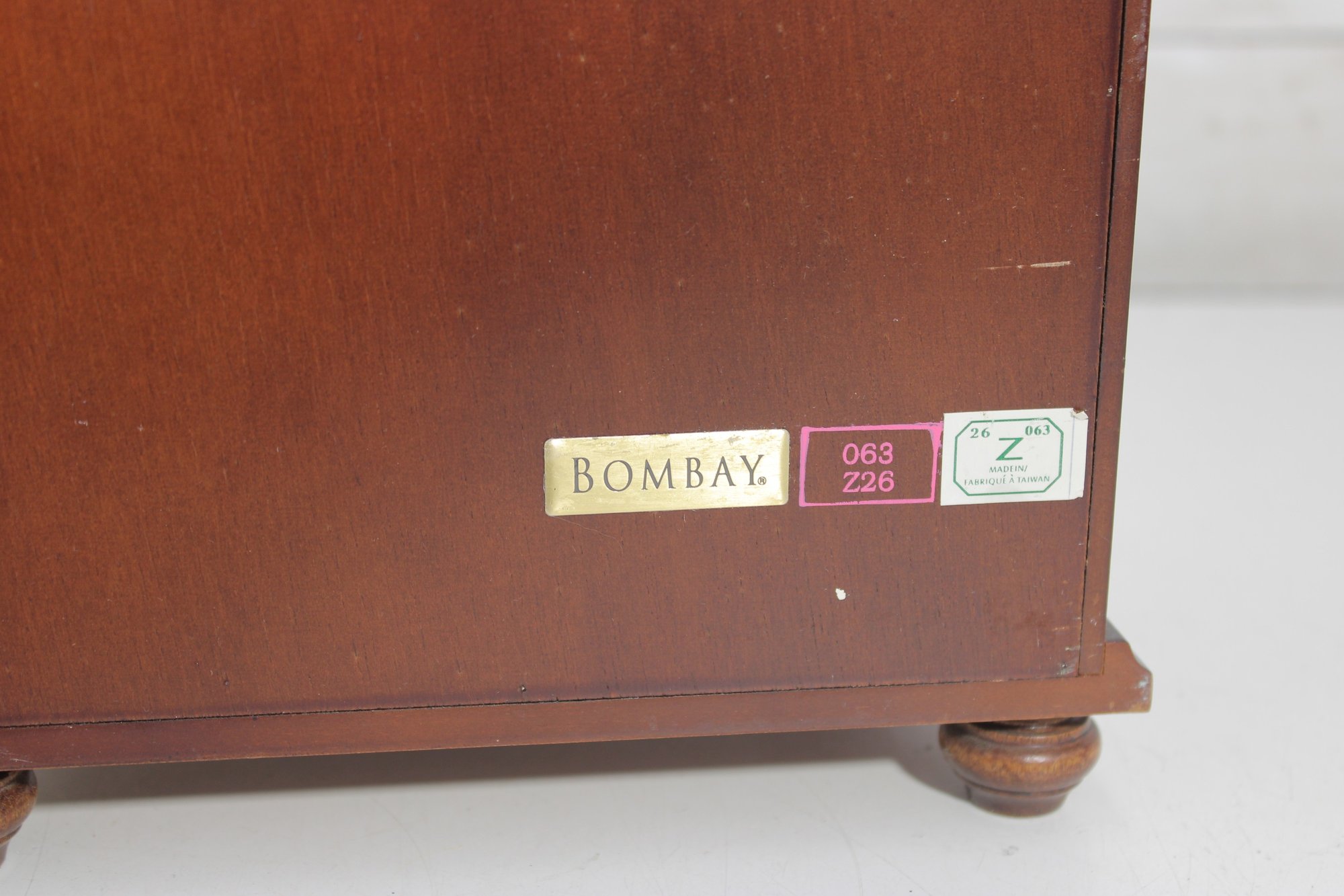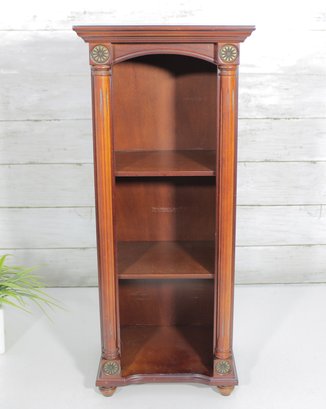 Add classic elegance to your space with this Bombay Company wooden display shelf cabinet. Standing approximately 21 inches tall, this beautifully crafted piece features a traditional design with decorative columns, carved accents, and a rich wood finish.