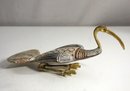 This striking vintage brass and stone bird figurine stands 4 inches high and measures 9 inches in length. With intricate detailing on the wings, feathers, and tail, the bird showcases a beautiful blend of brass with enamel accents, giving it a unique, textured look. Its long, gracefully curved beak and delicate legs add elegance, while the ornate patterns on the wings and tail make it a true collector’s piece. Perfect as a decorative accent for a shelf or display case, this bird figurine brings a touch of vintage charm to any setting. Minor wear adds character, highlighting its age and authenticity.