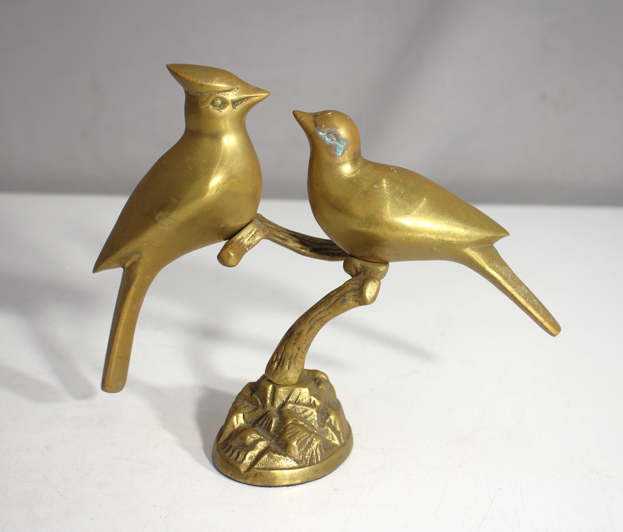 A charming brass sculpture featuring two intricately detailed birds perched on a branch. Standing 6.5 inches tall, this figurine captures a lifelike pose with smooth craftsmanship and a gleaming finish. The sturdy base adds stability and highlights the elegant design, making it a perfect addition to any décor or collection.