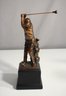 This finely crafted bronze sculpture depicts a golfer in mid-swing, showcasing detailed posture and realistic attire, down to the creases in his pants and his cap. The golfer is mounted on a black base, making it a perfect display piece for any golf enthusiast. This statue exudes a sense of motion and focus, ideal for adding a touch of sophistication to your decor or as a collector's item.