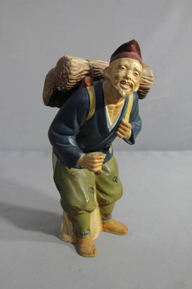 A cheerful glimpse into traditional Japanese culture, this Hakata Urasaki figurine, named "Burden of Joy," showcases an elderly man with a spirited smile, laboriously carrying a hefty bundle on his back. The figure is captured mid-stride, his expression one of contentment and determination, representing the value of hard work and the satisfaction that comes from a day's labor.