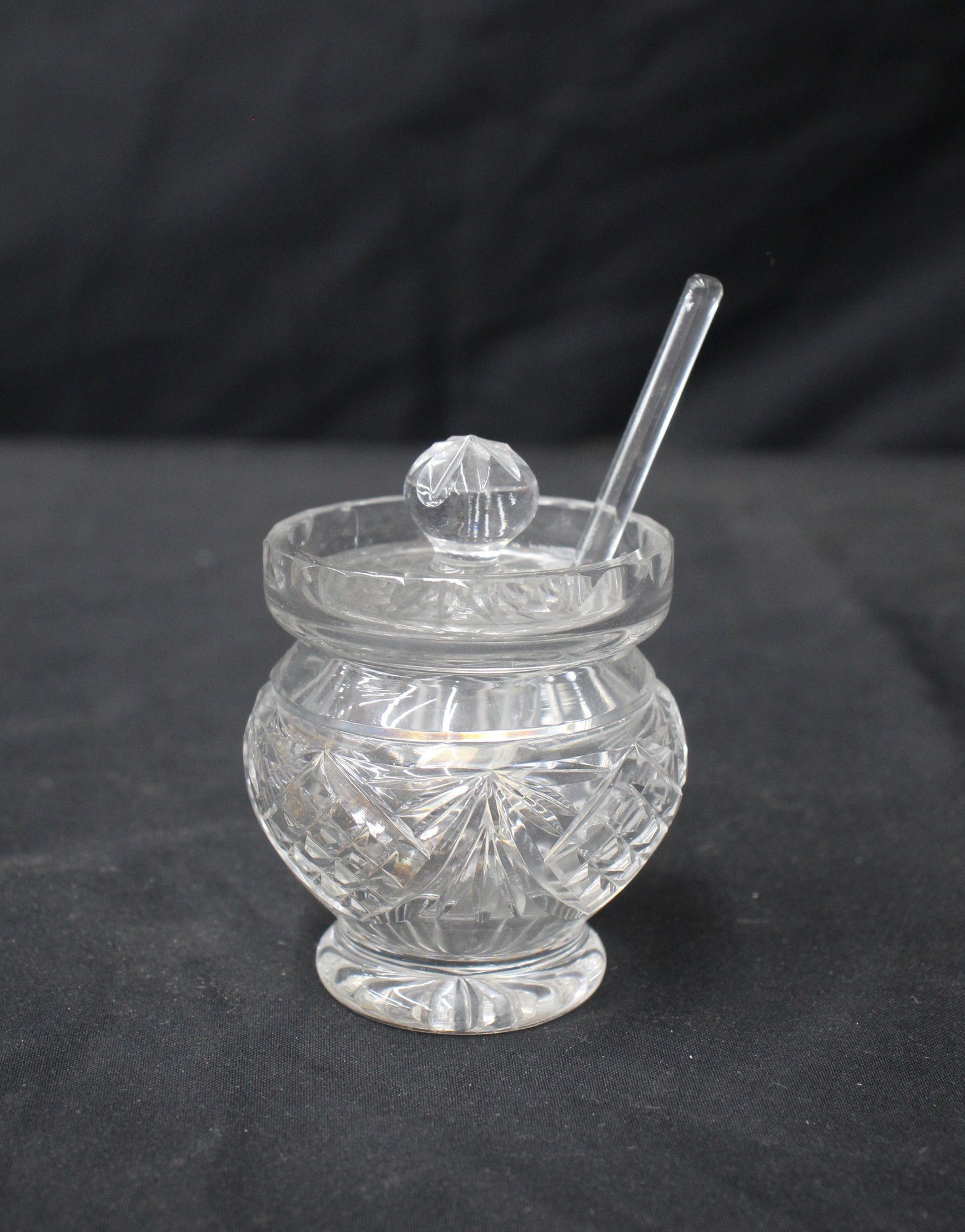 GC crystal honey pot, complete with a serving spoon, is a gleaming addition to any table setting or kitchen. The intricate design etched into the crystal radiates with each turn, reflecting light beautifully. The pot features a traditional form with a faceted spherical lid handle and matching clear crystal serving spoon, making for a seamless and sophisticated honey serving experience.