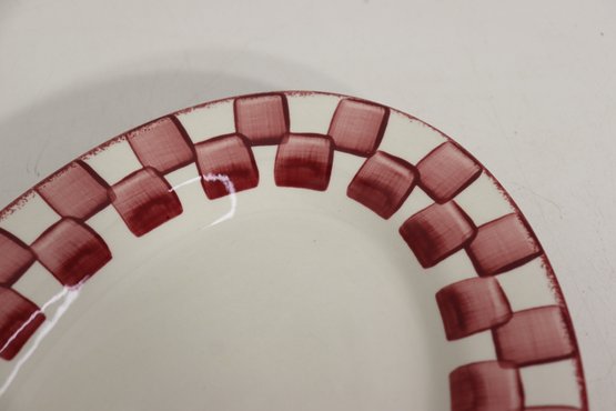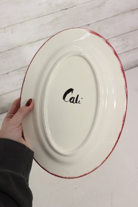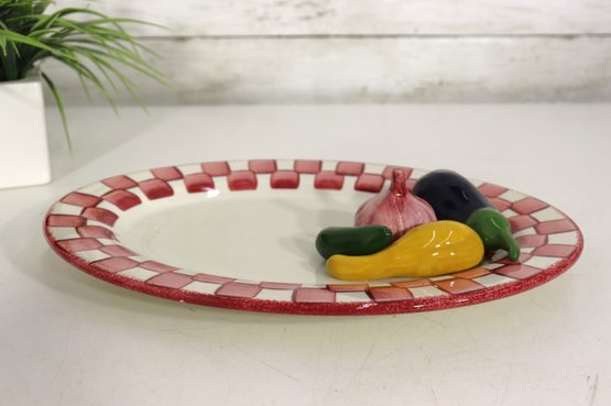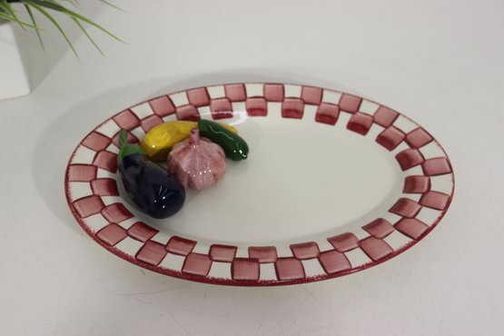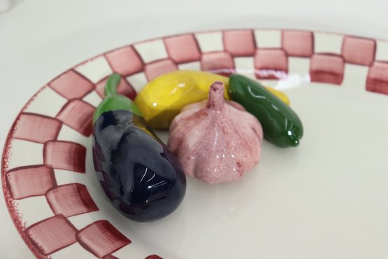 Charming hand-painted ceramic platter by Cali, featuring a classic red checkered border and a cluster of colorful vegetables — eggplant, garlic, pepper, and squash — sculpted in relief. The piece combines playful design with rustic farmhouse charm, making it perfect for kitchen décor or serving.