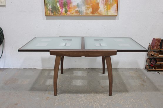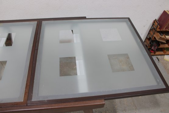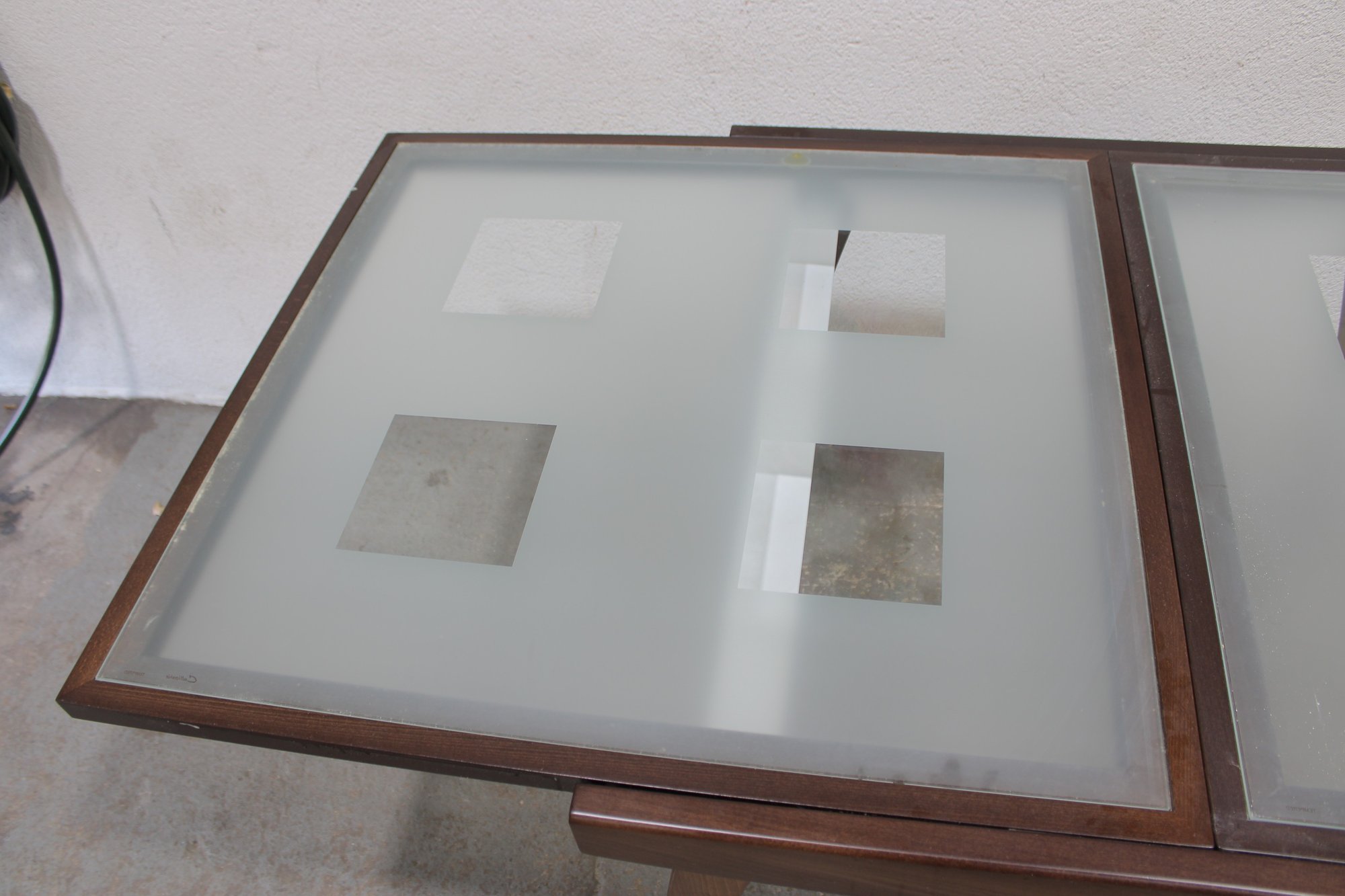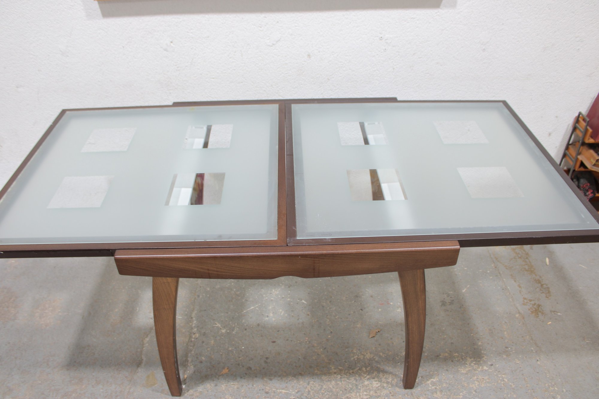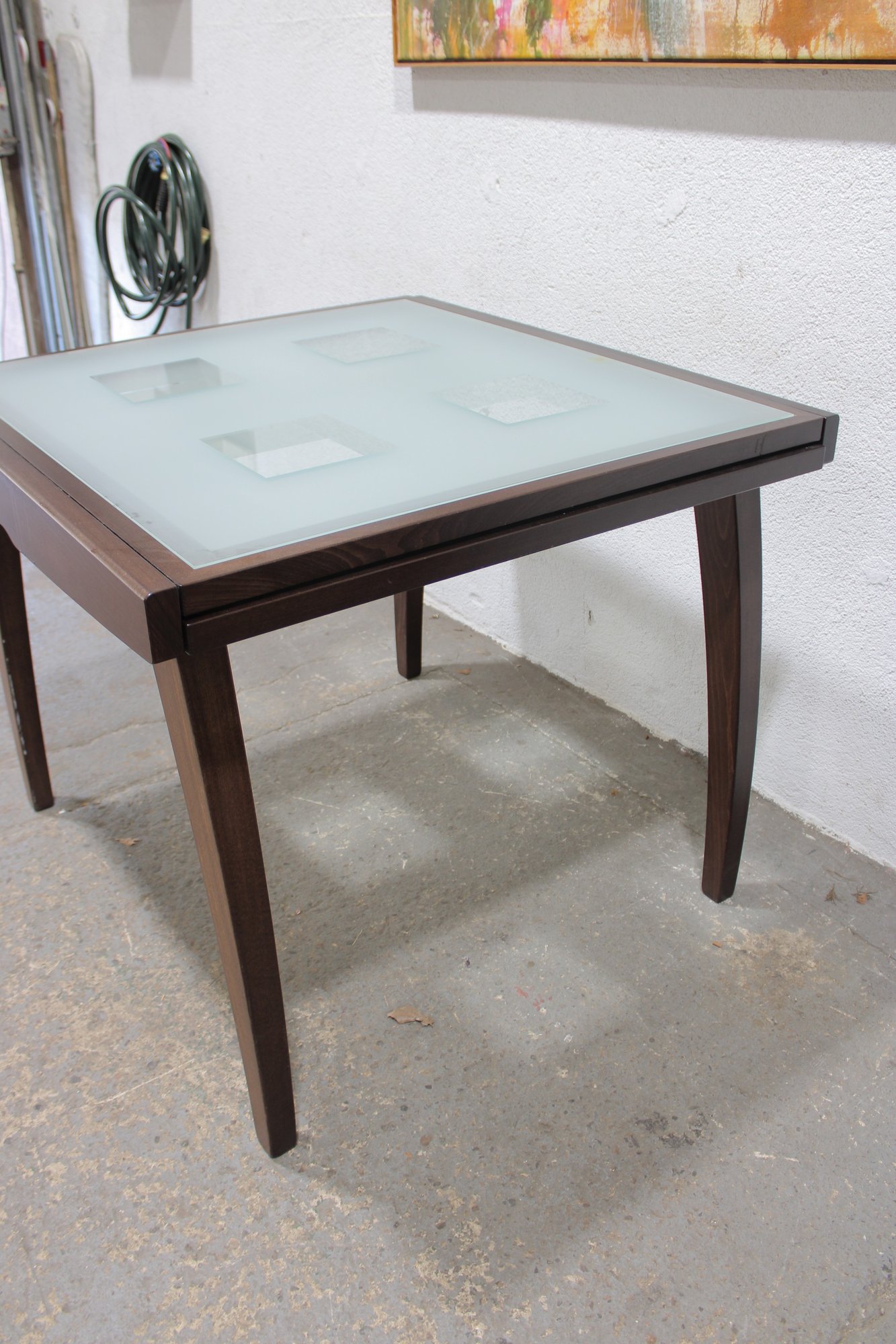 This table features a frosted glass top with subtle geometric detailing, set within a warm wood frame and supported by elegantly curved legs. The integrated extension system allows the table to expand smoothly, transforming from a compact square footprint into a spacious rectangular dining surface—perfect for entertaining.