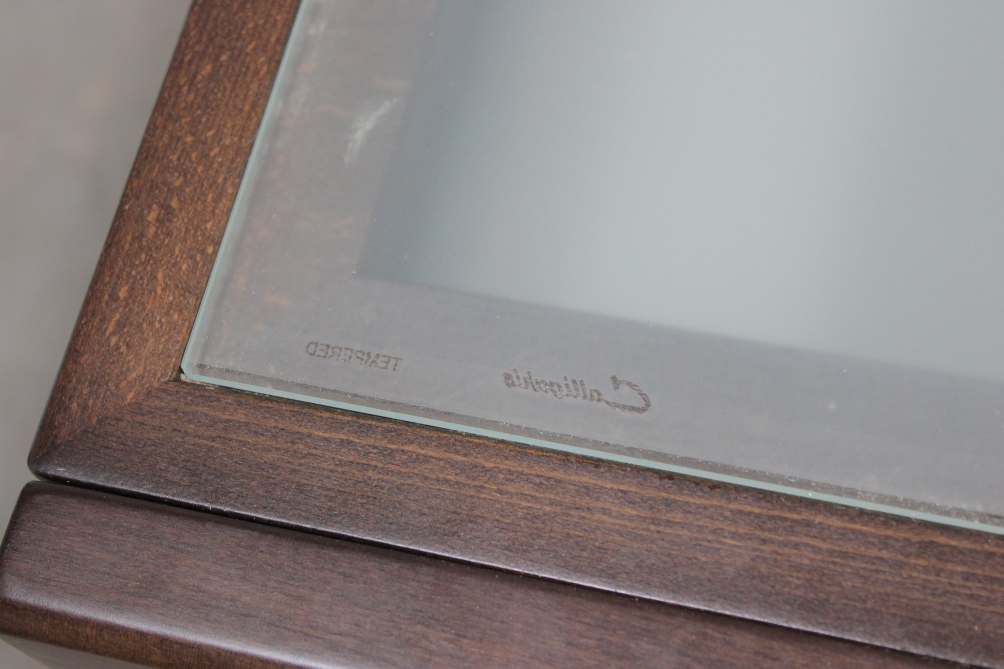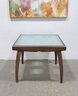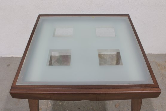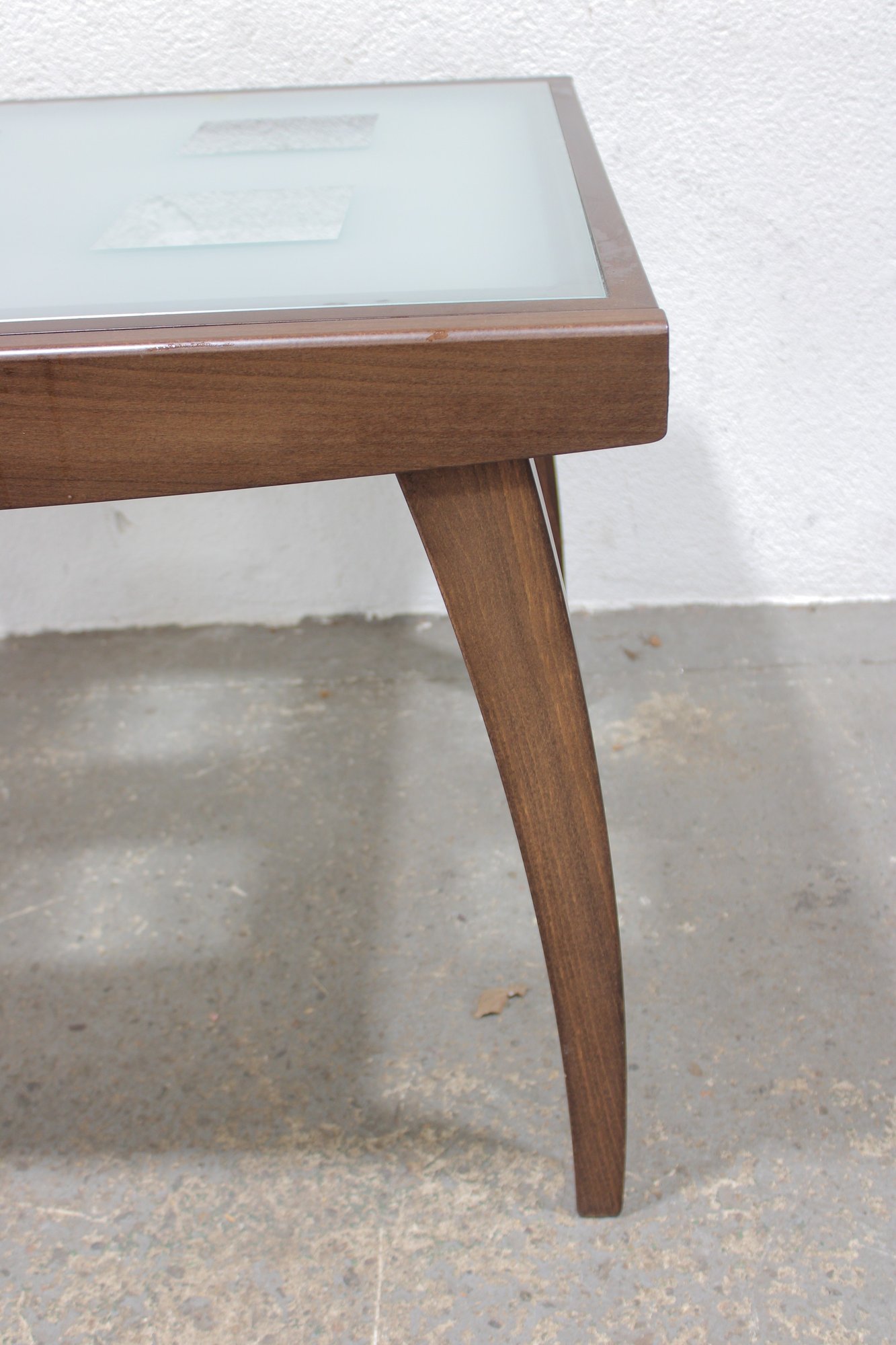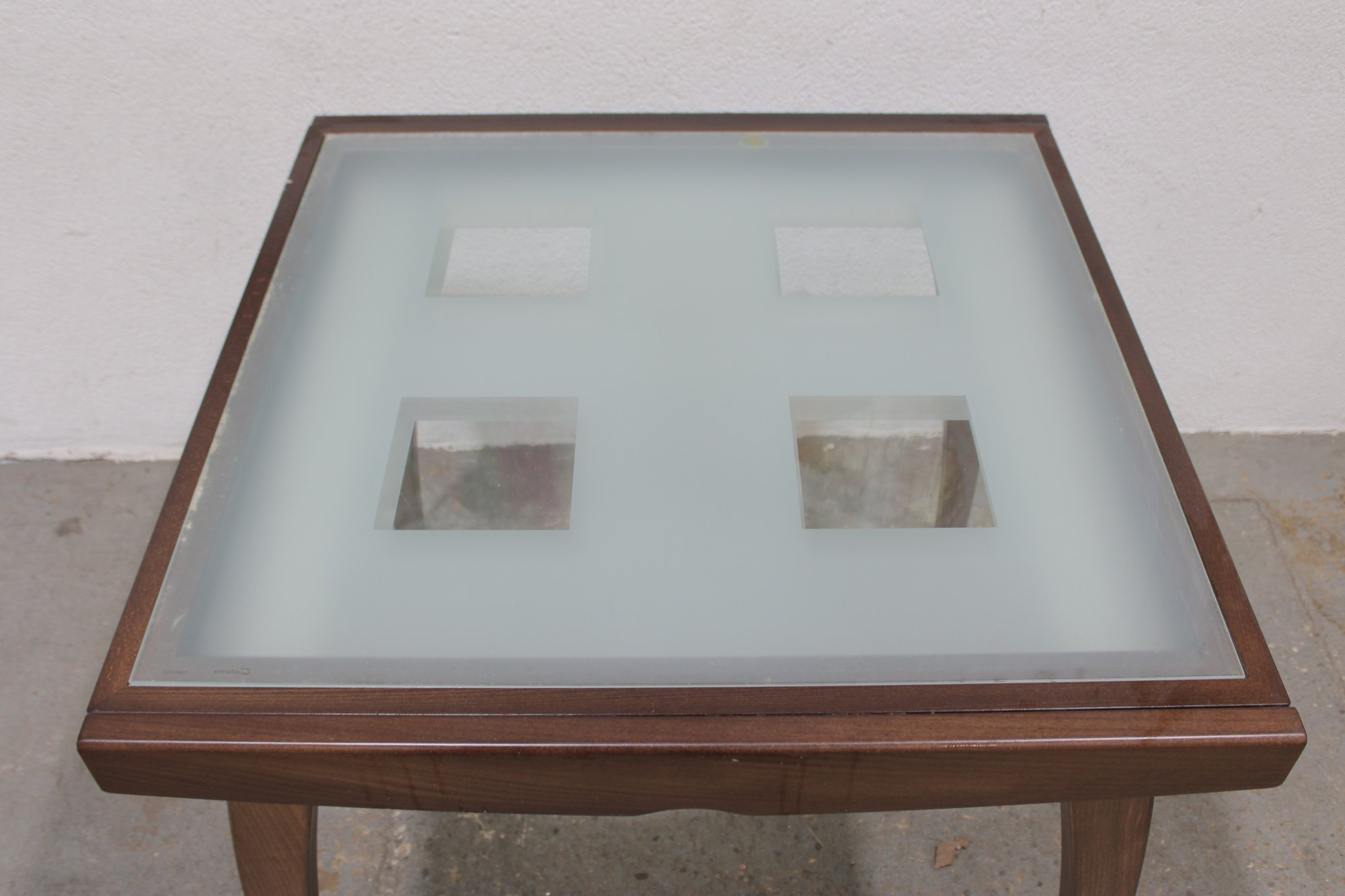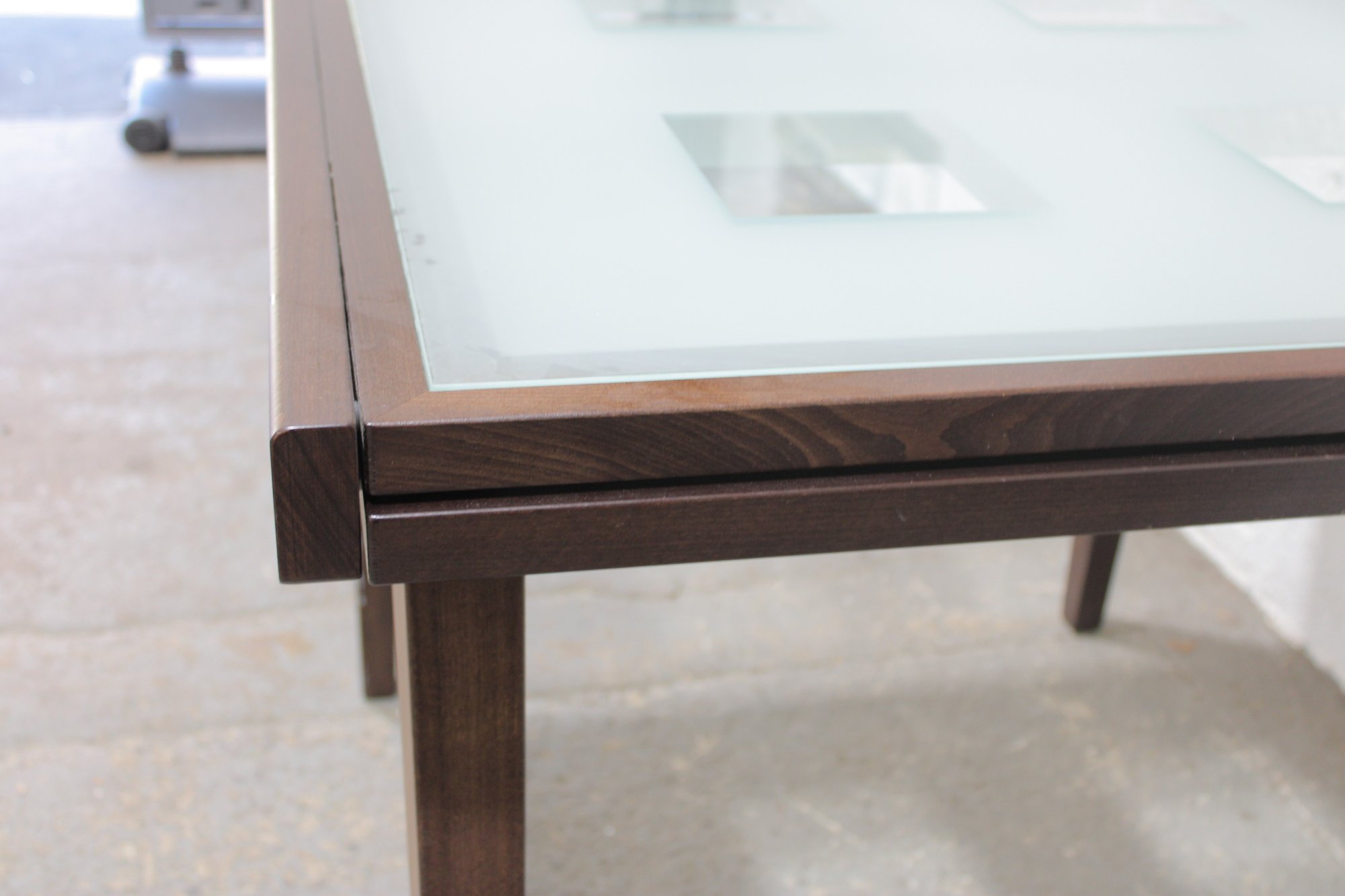 This table features a frosted glass top with subtle geometric detailing, set within a warm wood frame and supported by elegantly curved legs. The integrated extension system allows the table to expand smoothly, transforming from a compact square footprint into a spacious rectangular dining surface—perfect for entertaining.