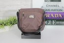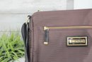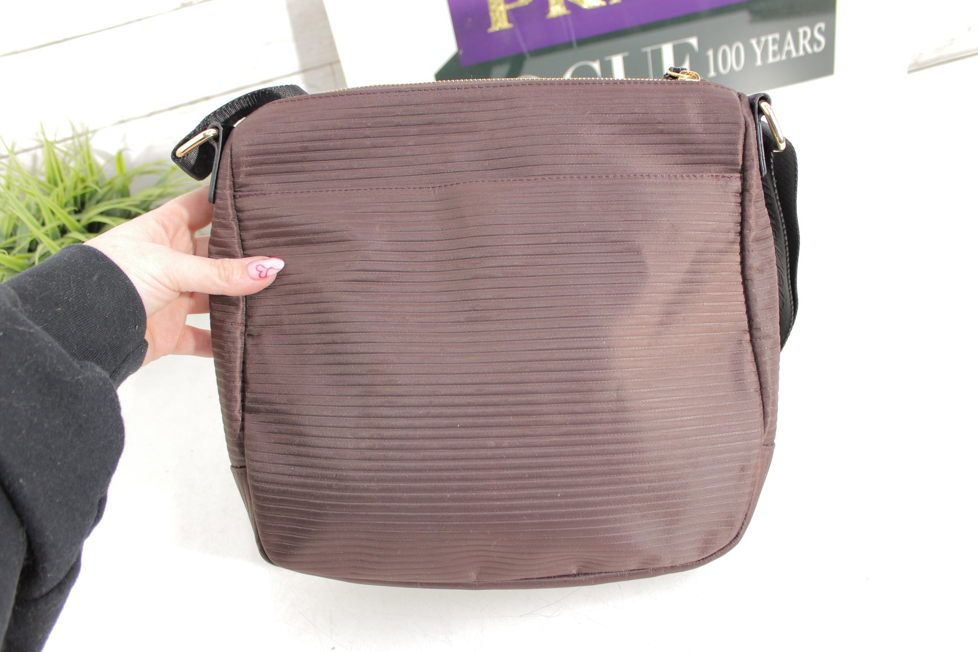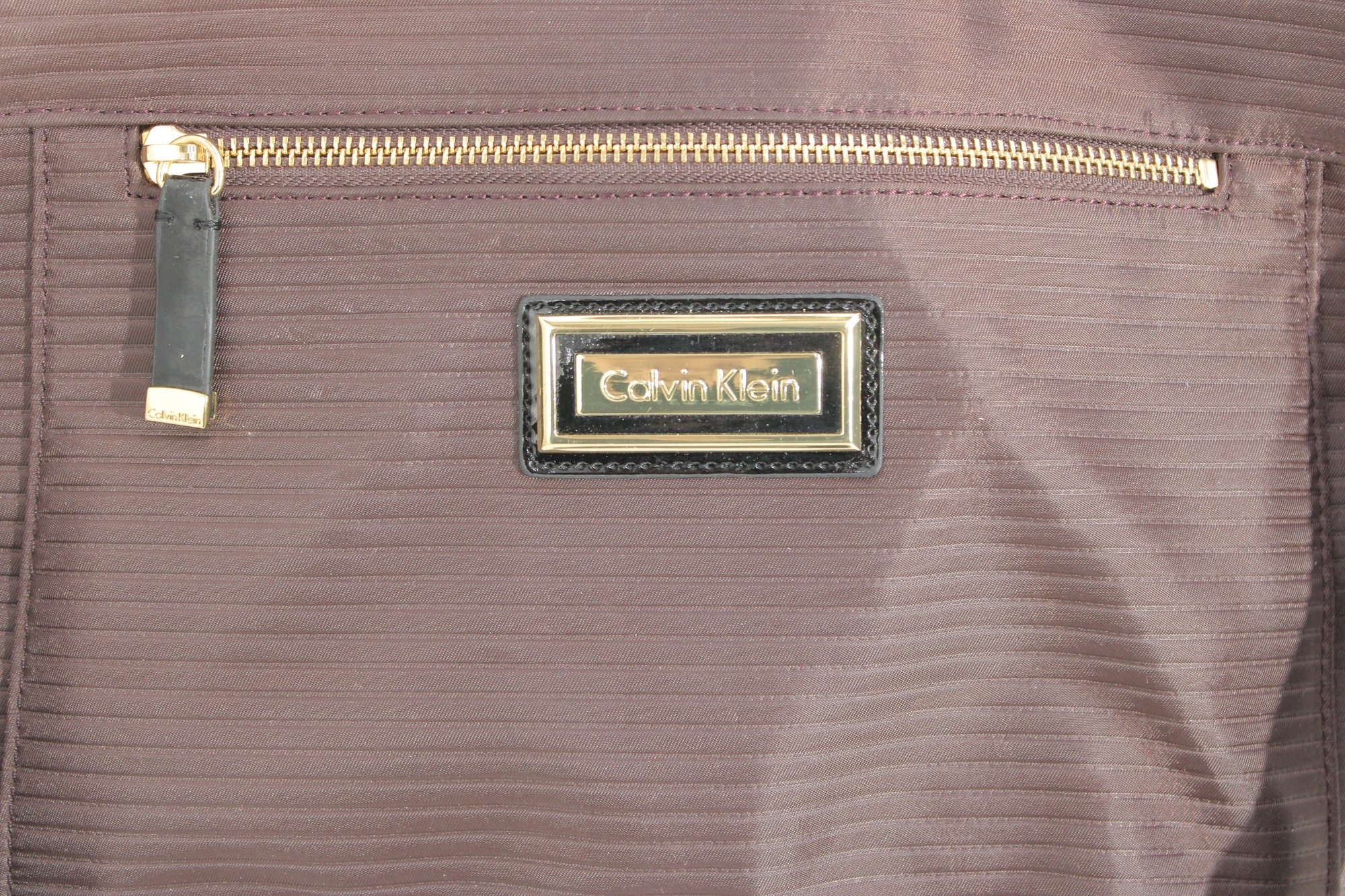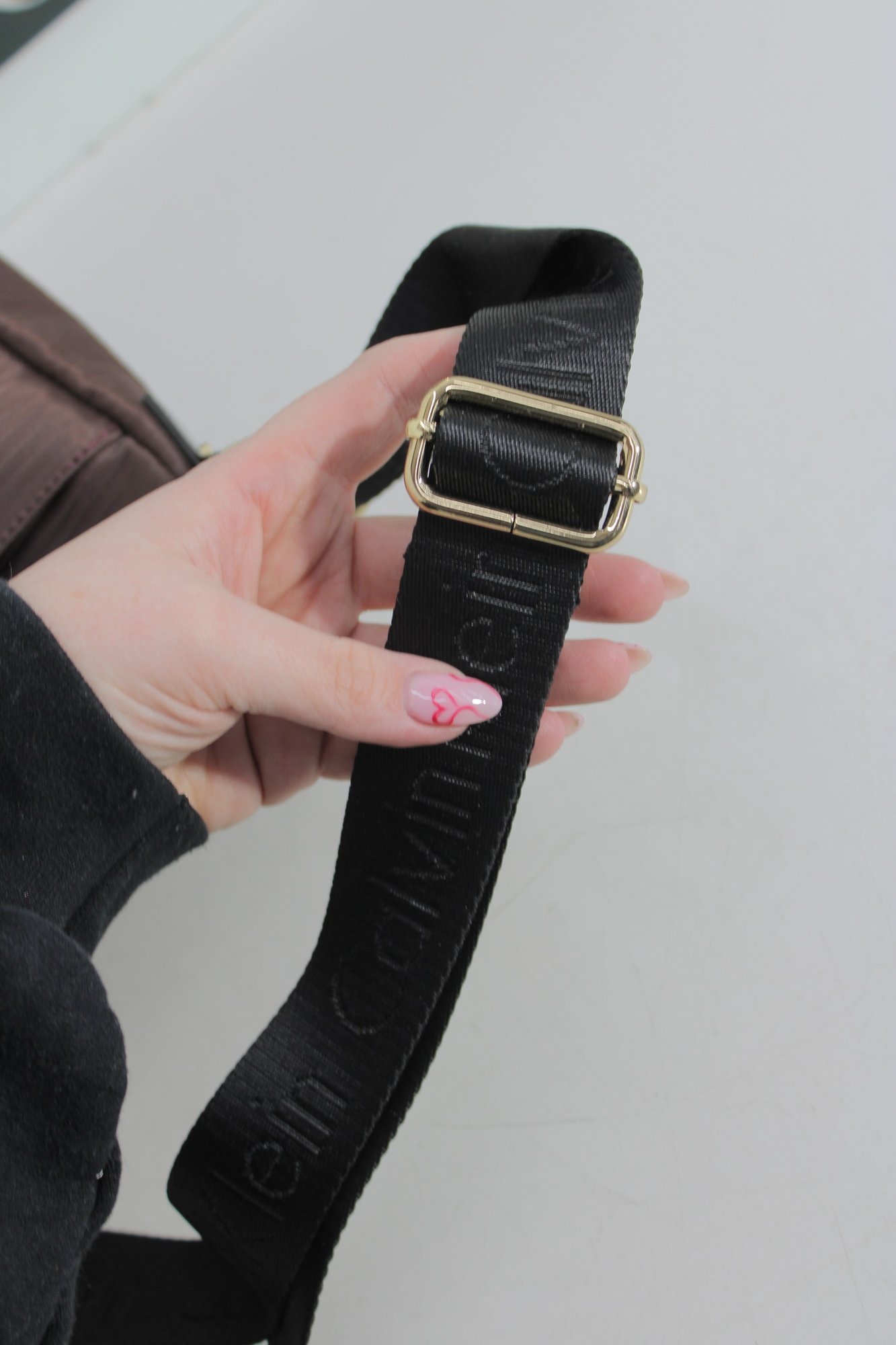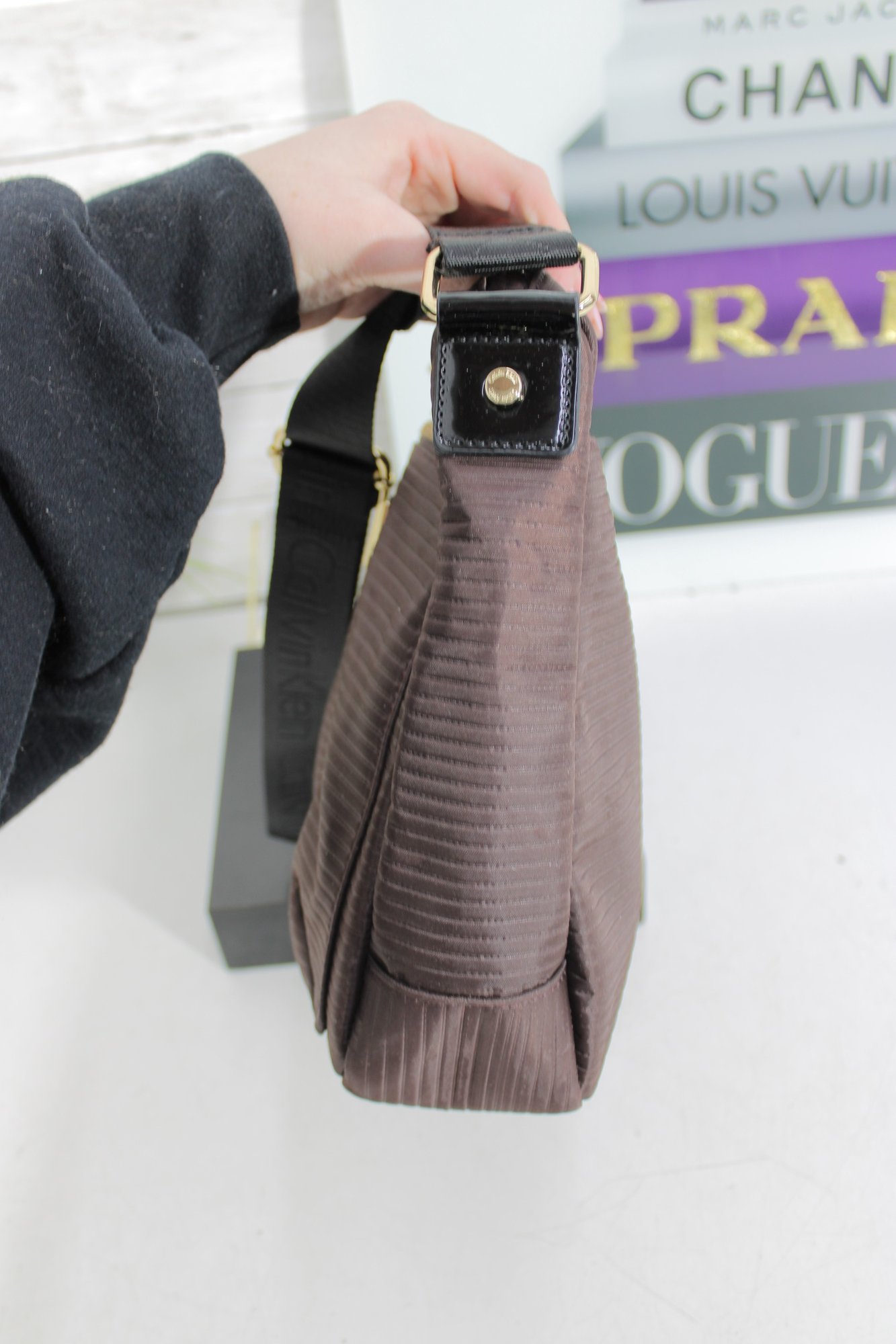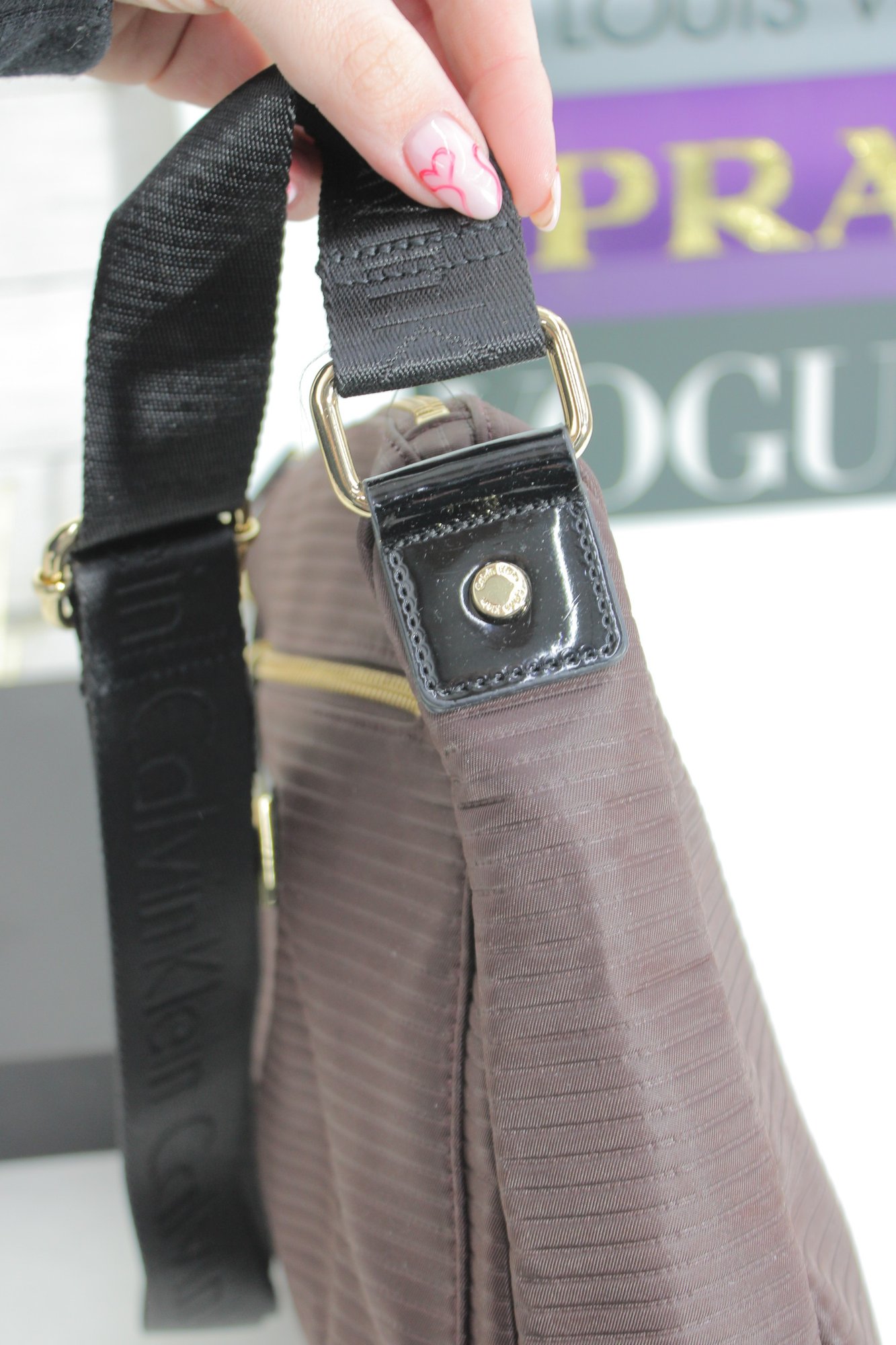 a sleek and practical Calvin Klein brown nylon crossbody bag featuring subtle horizontal texture detailing and gold-tone hardware. This lightweight and versatile handbag is perfect for everyday use, travel, or errands.