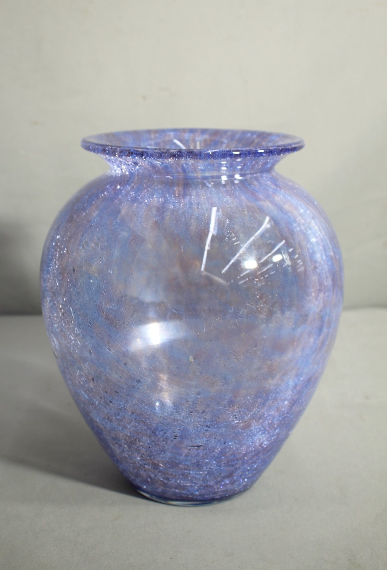 large blue glass vase features a mesmerizing iridescent finish that sparkles with hints of purple and white. Standing at a substantial height, this vase showcases a bulbous base tapering into a graceful narrow neck, perfect for holding a variety of floral arrangements. The iridescent sheen captures and reflects light beautifully