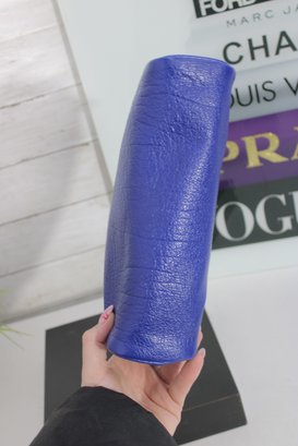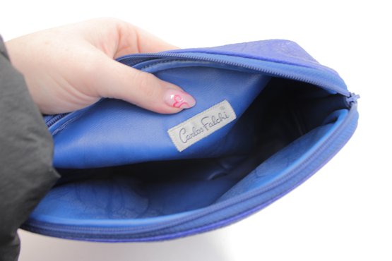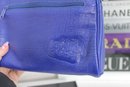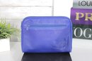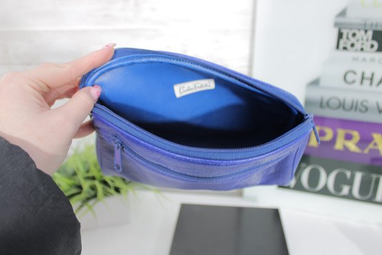 Add a bold pop of color to your collection with this Carlos Falchi blue leather cosmetic clutch pouch. Crafted from soft textured leather, this stylish pouch features a sleek minimalist design with a front embossed Carlos Falchi logo and secure zip-top closure.
