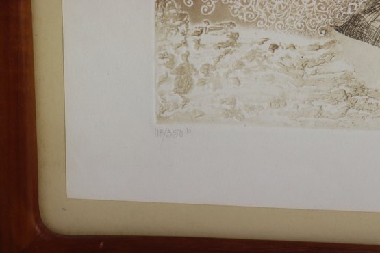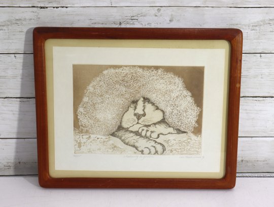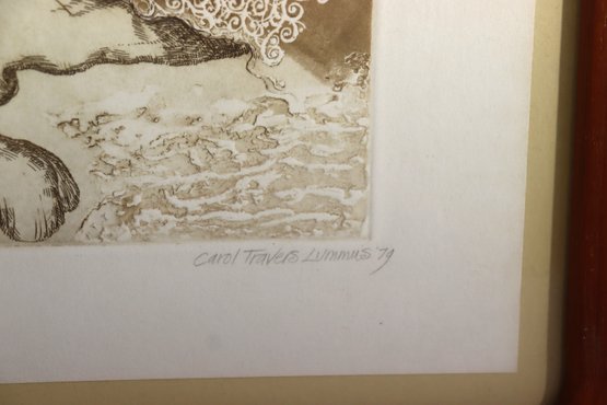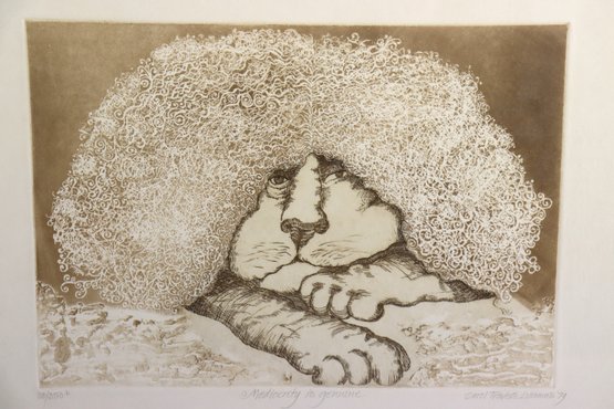 Offered is an original signed etching by noted Cape Cod artist Carol Travers Lummus, titled “Mediocrity is Genuine”. Artist signed and dated ’79 in pencil. This print features her signature whimsical illustrative style and unique line work, done using brass presses which she is known for. Carol Travers Lummus creates charming, humorous, and often socially reflective etchings – typically inspired by Victorian era visual themes and stylized character depiction.