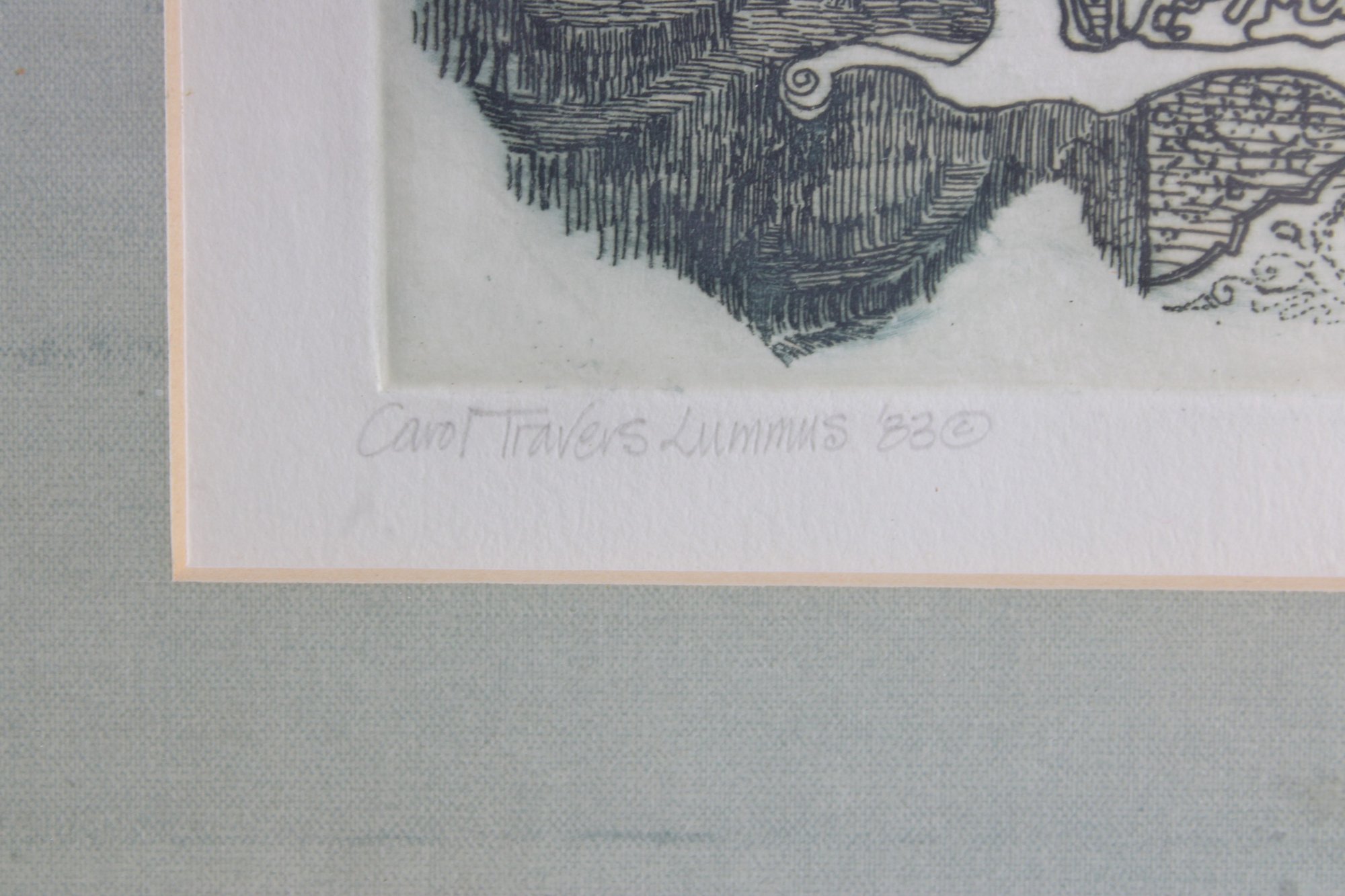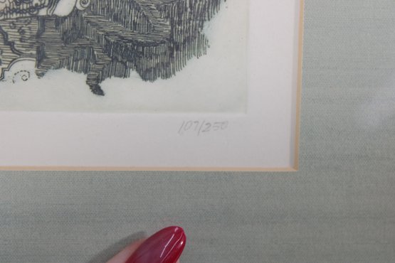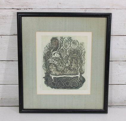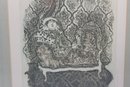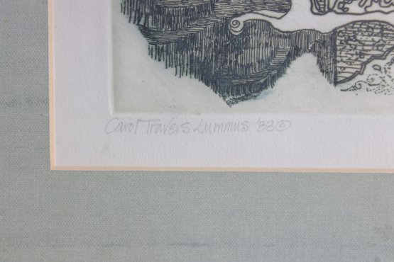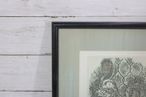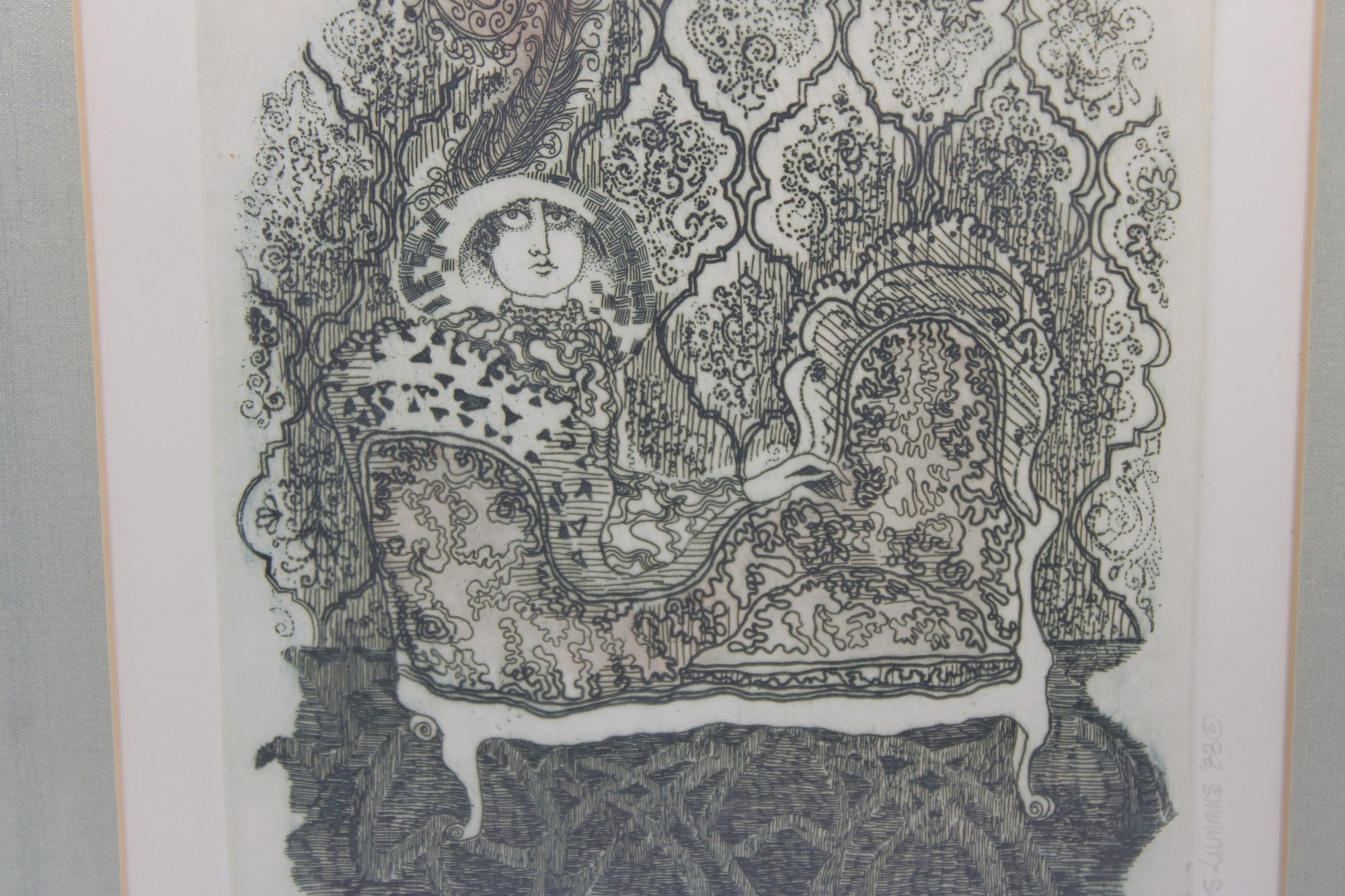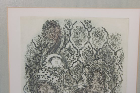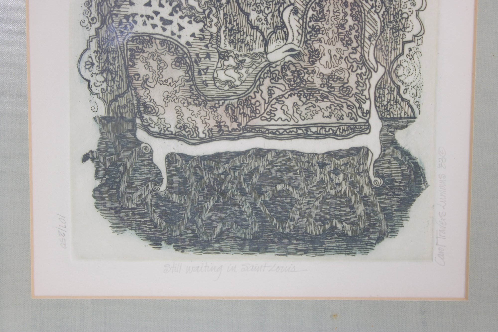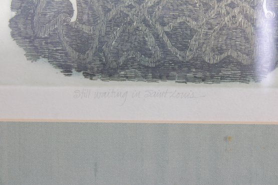 An intricate and visually captivating limited edition etching titled “Still Waiting in Saint Louis” by listed artist Carol Travers Lummus, dated 1983. This finely detailed black-and-white composition features a stylized seated figure set within an ornate, richly patterned interior, showcasing the artist’s meticulous linework and storytelling style.