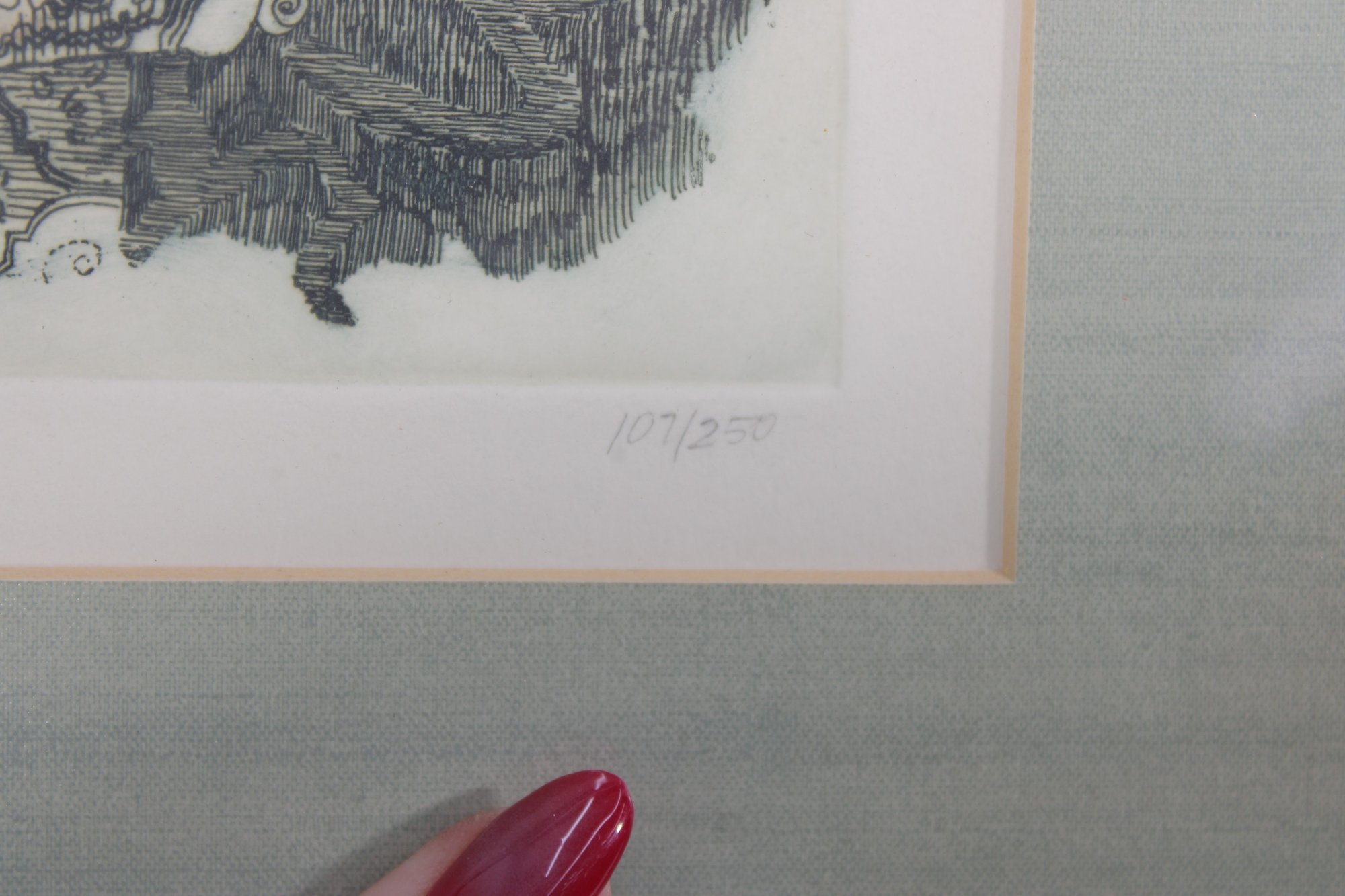 Hand-signed by the artist along the lower margin and numbered 107/250, this piece represents a collectible example of Lummus’ work. The composition is professionally matted and housed in a black frame with a soft green fabric liner, enhancing its presentation and depth.