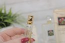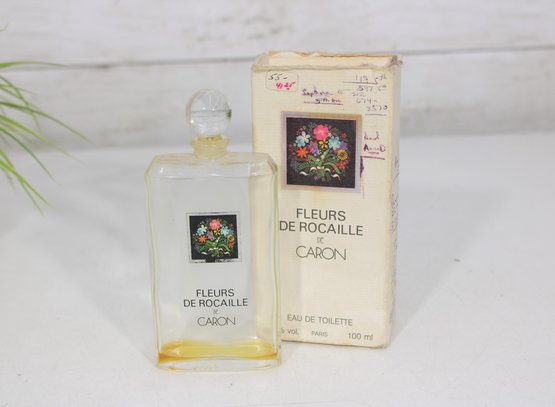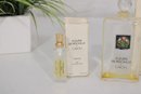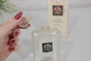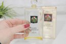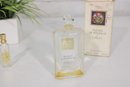 The larger bottle features the classic rectangular glass design with floral artwork label and rounded stopper. The mini parfum bottle includes a gold-tone spray top.