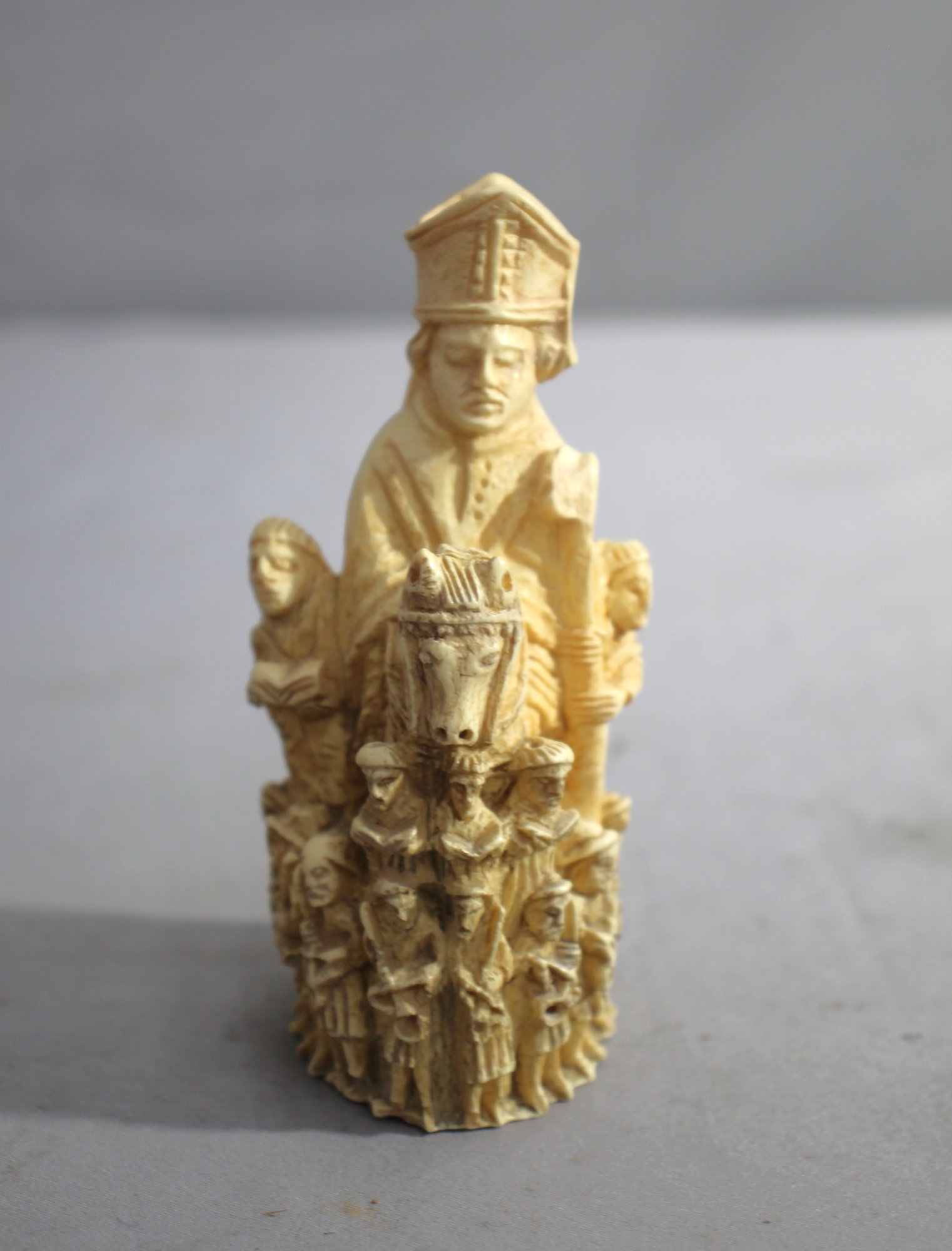 This intricately detailed piece showcases the Pope with two religious figures by his side, symbolizing guidance and reverence. At the base, the figurine features 16 meticulously crafted members of his entourage, adding depth and narrative to the piece. Is this made of resin