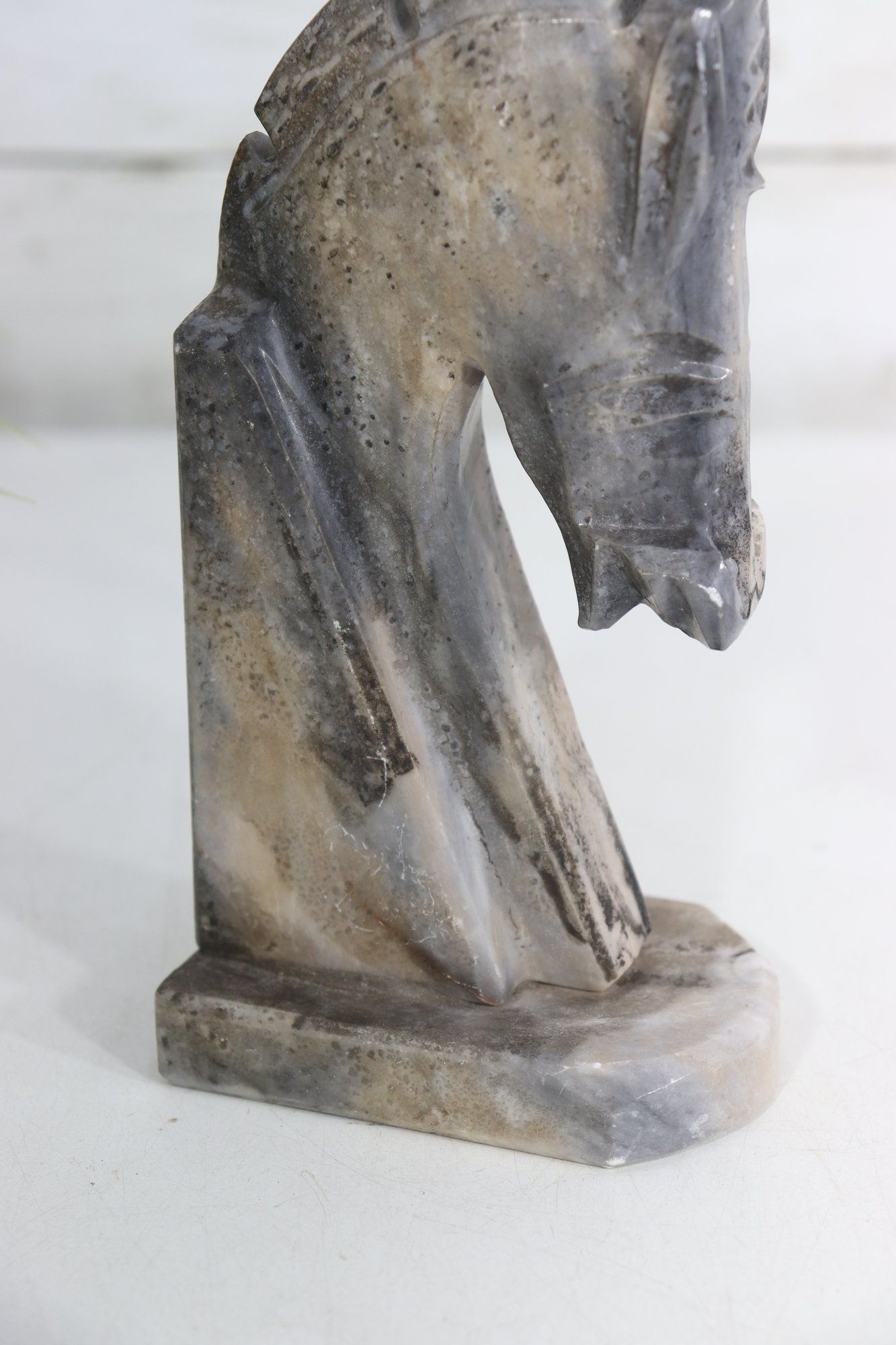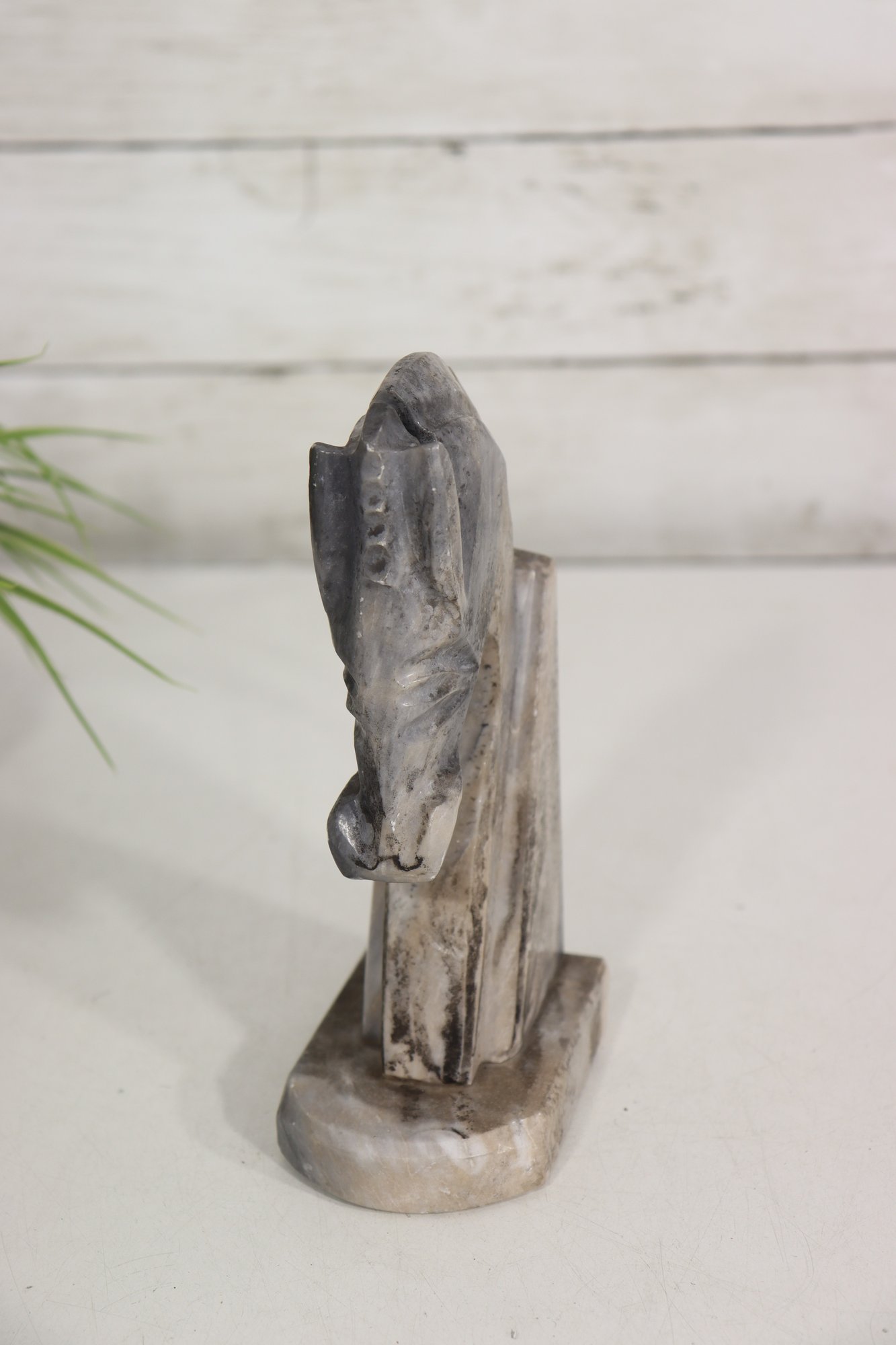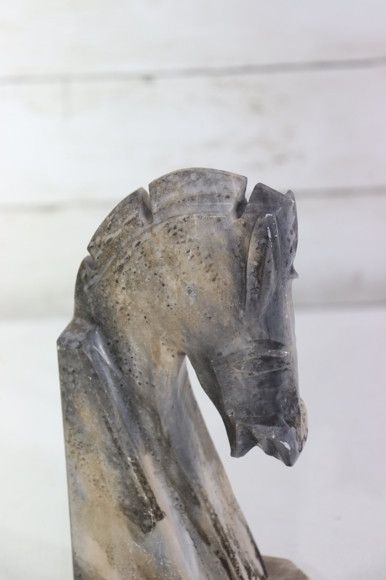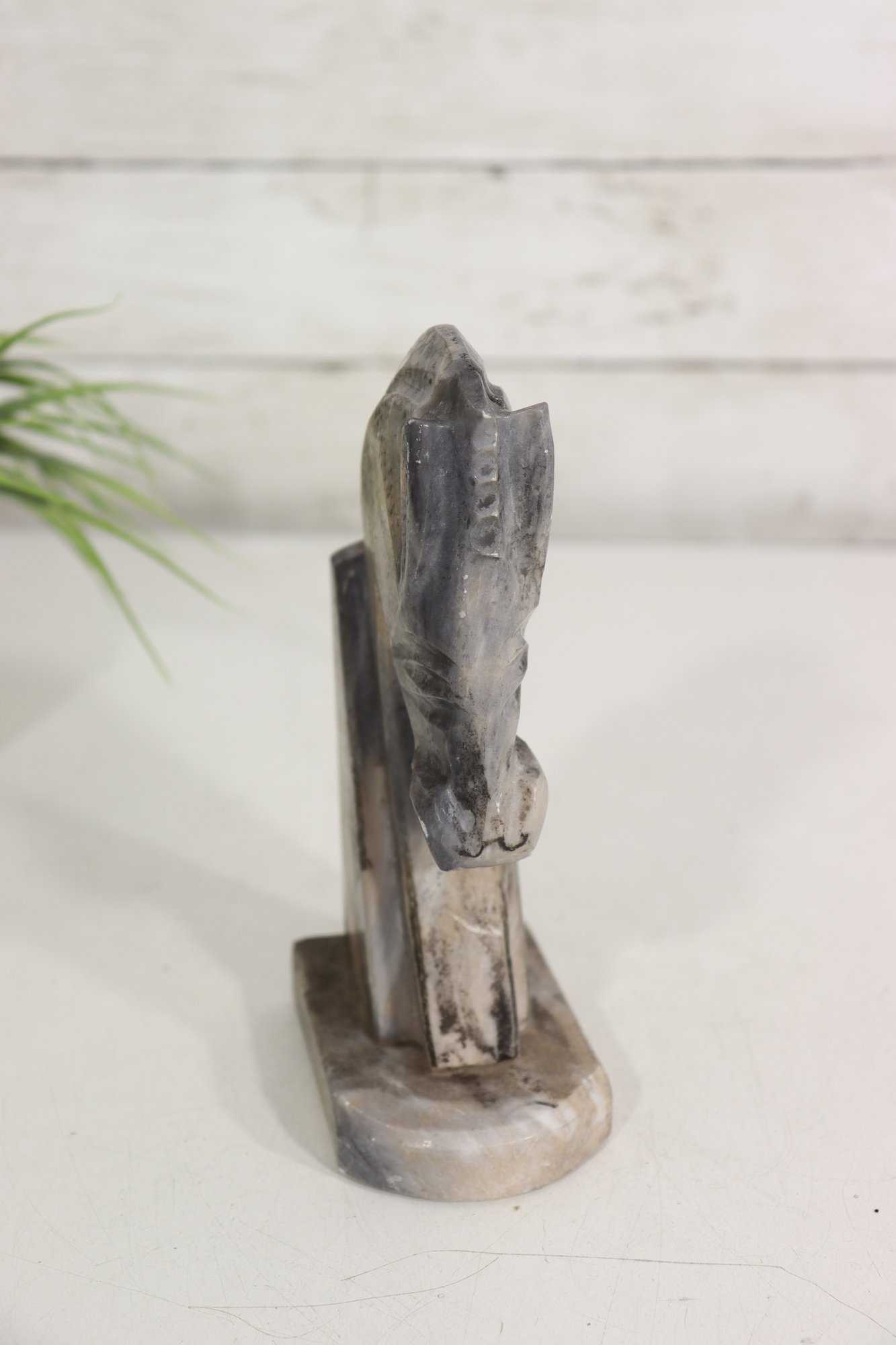 a carved stone horse head sculpture, rendered in a stylized, abstract modernist form. The piece captures the strength and elegance of the horse through simplified lines, angular planes, and a subtly textured surface.