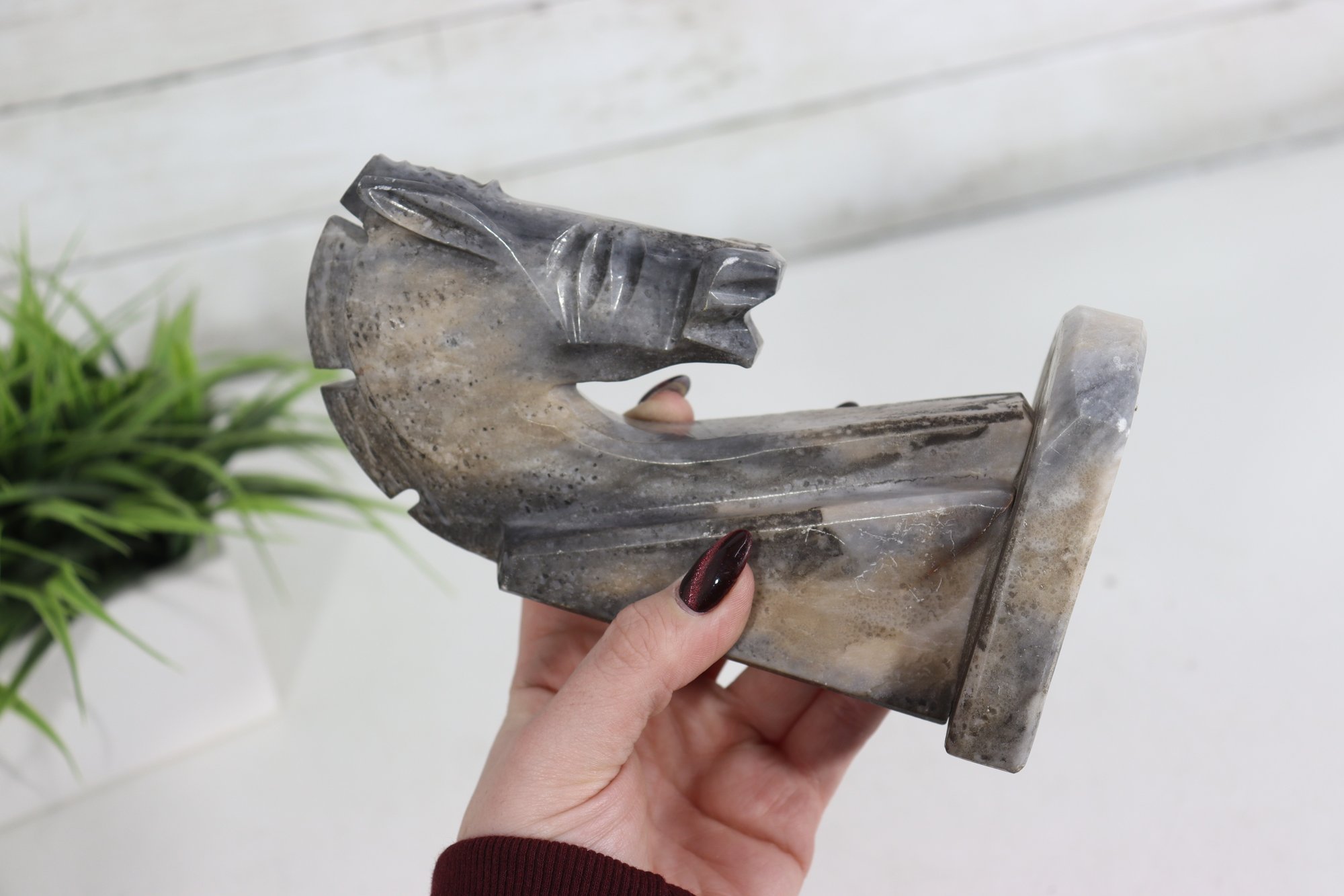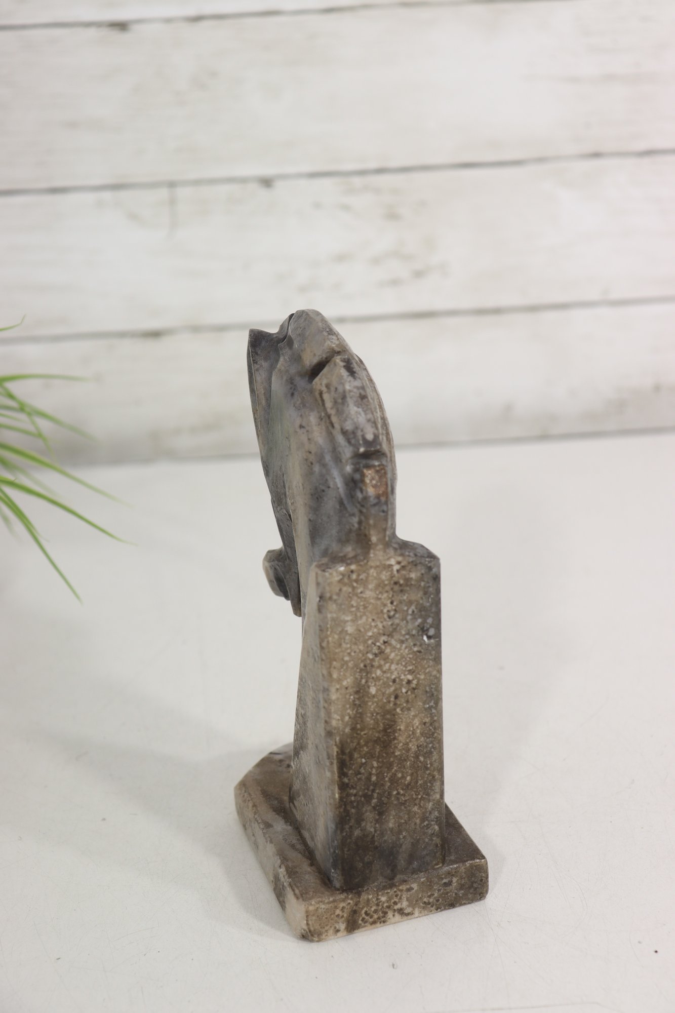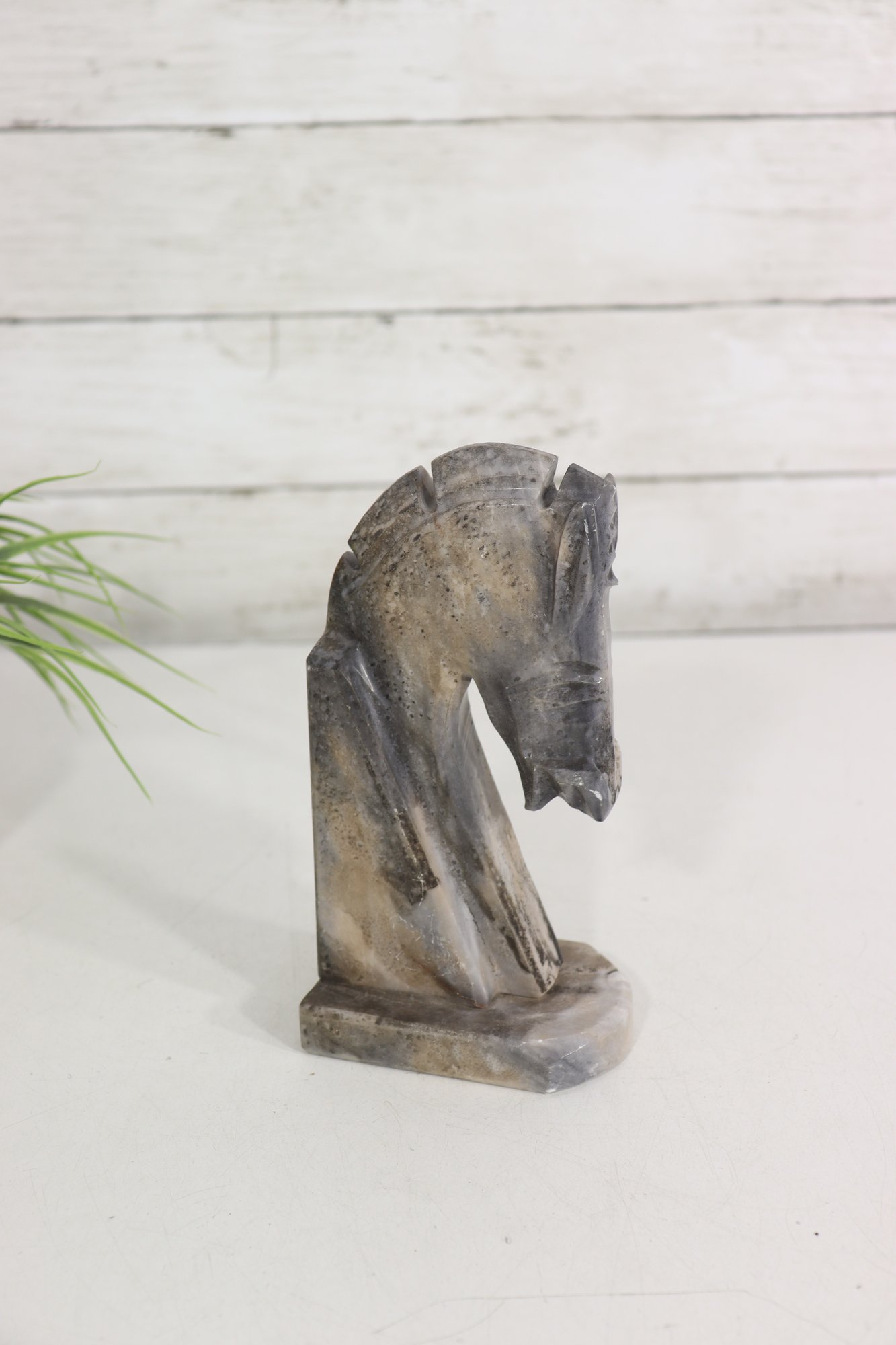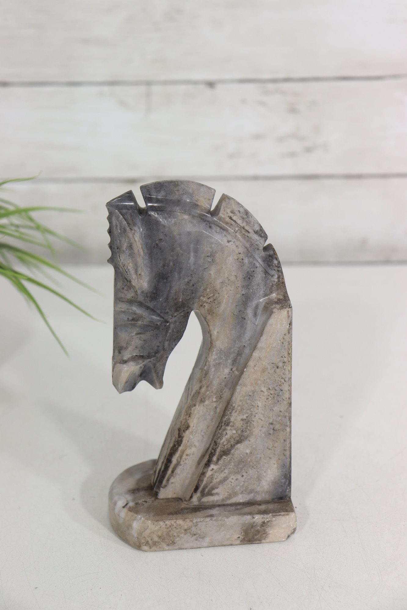 a carved stone horse head sculpture, rendered in a stylized, abstract modernist form. The piece captures the strength and elegance of the horse through simplified lines, angular planes, and a subtly textured surface.