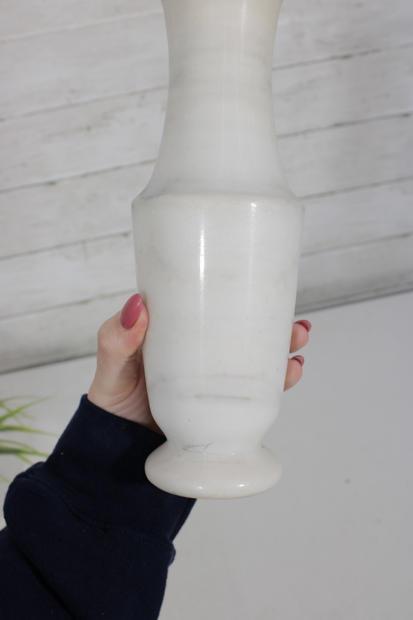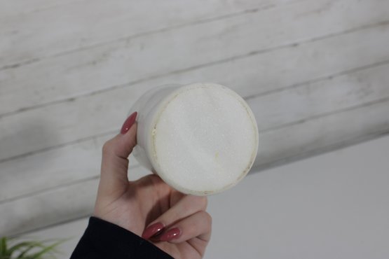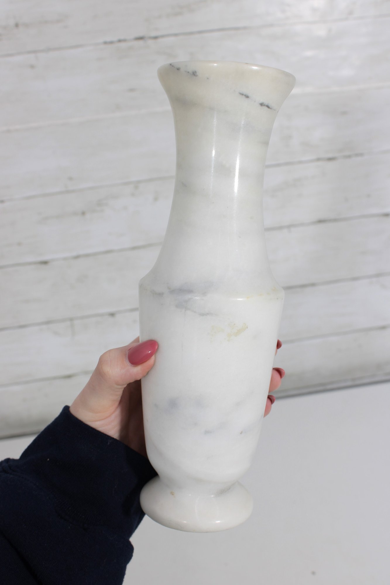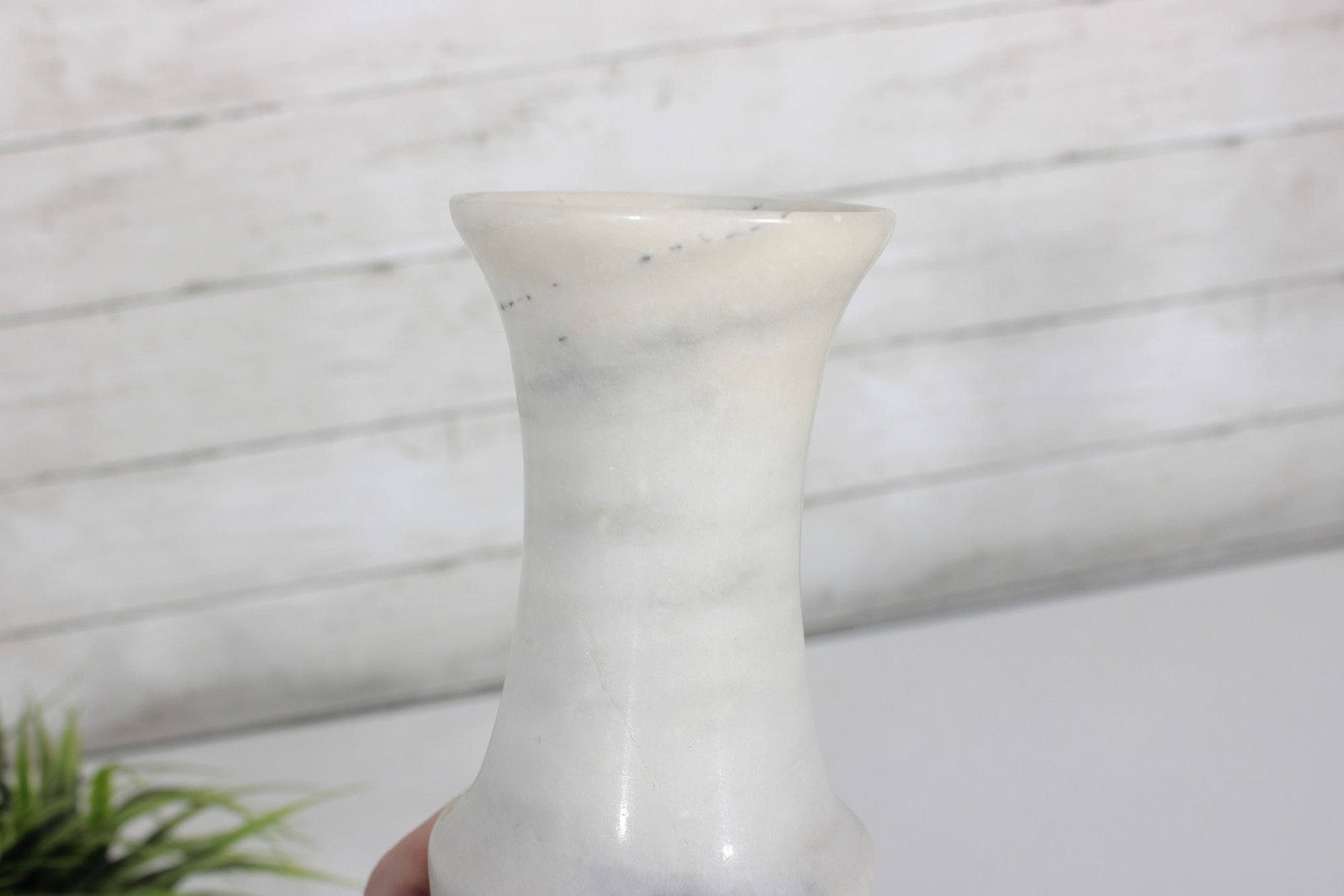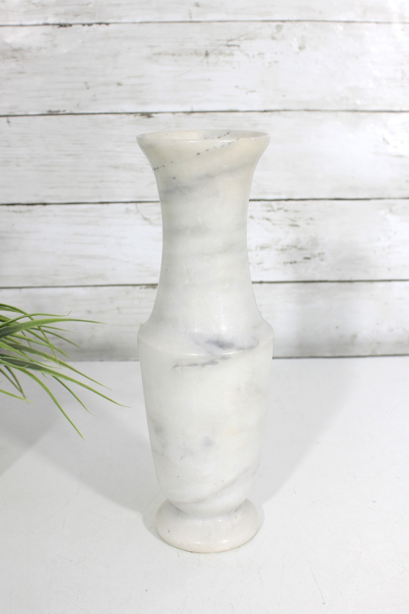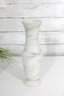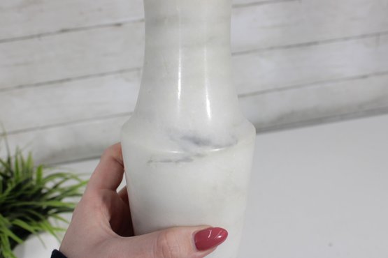 carved white marble vase featuring a timeless, minimalist silhouette. This solid stone piece showcases natural gray veining throughout, giving each side a unique and organic look.
