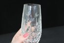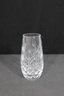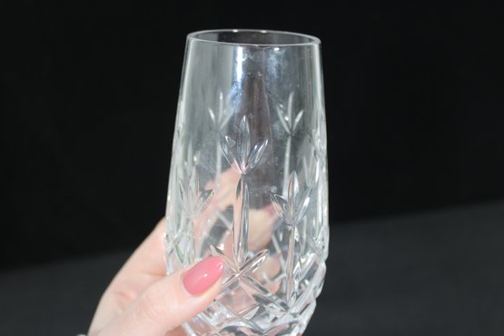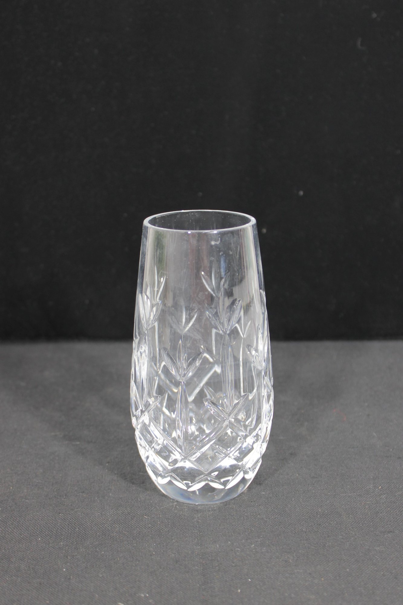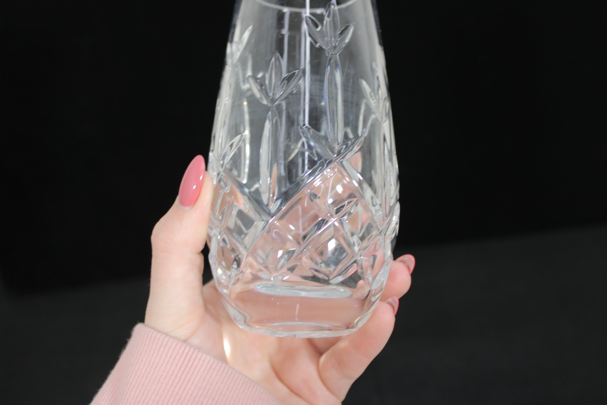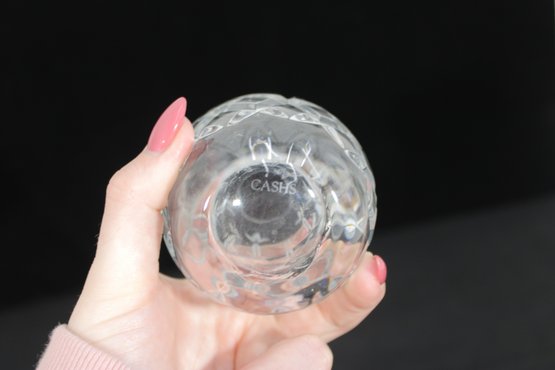 Cashs Ireland cut crystal vase, featuring a classic diamond and crosshatch pattern that beautifully reflects light. The vase has a gently tapered form with a rounded base and smooth rim, making it a versatile piece for small floral arrangements or standalone display.