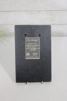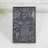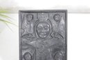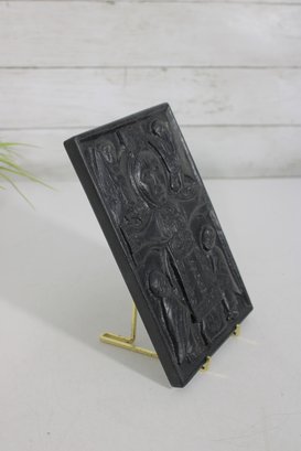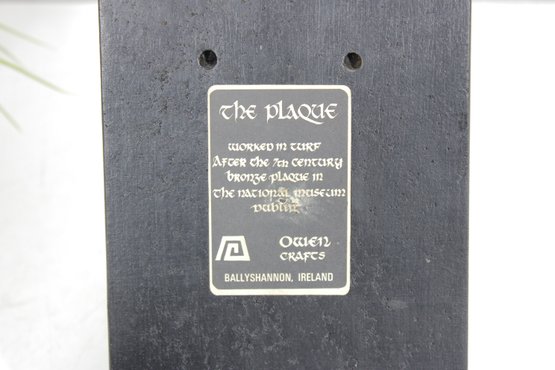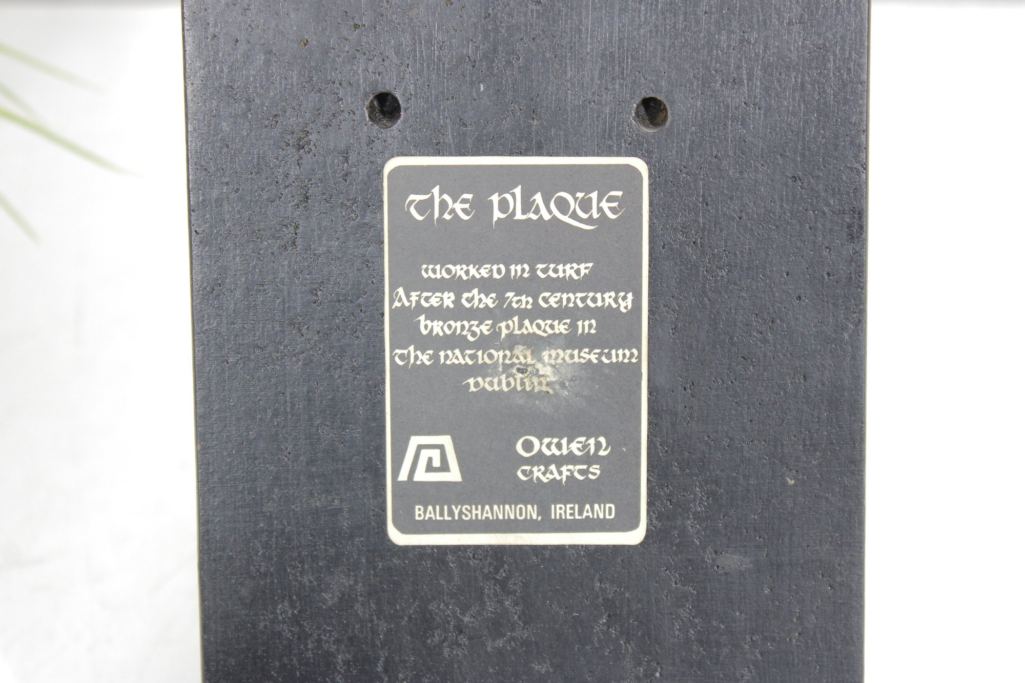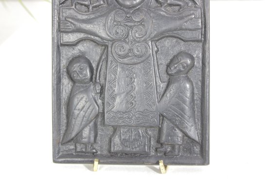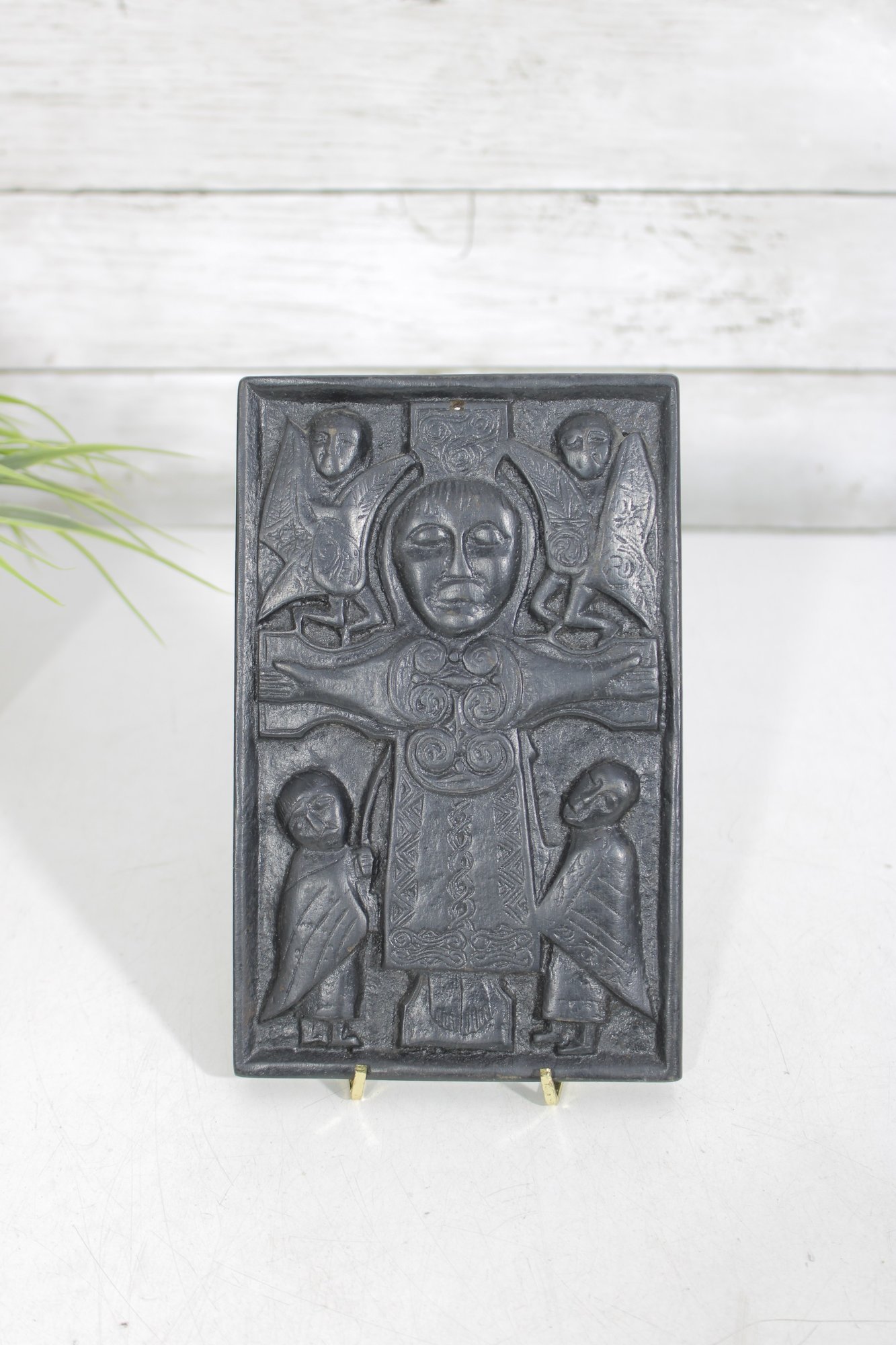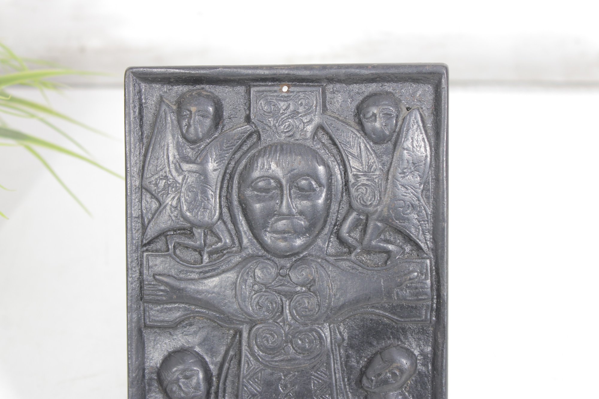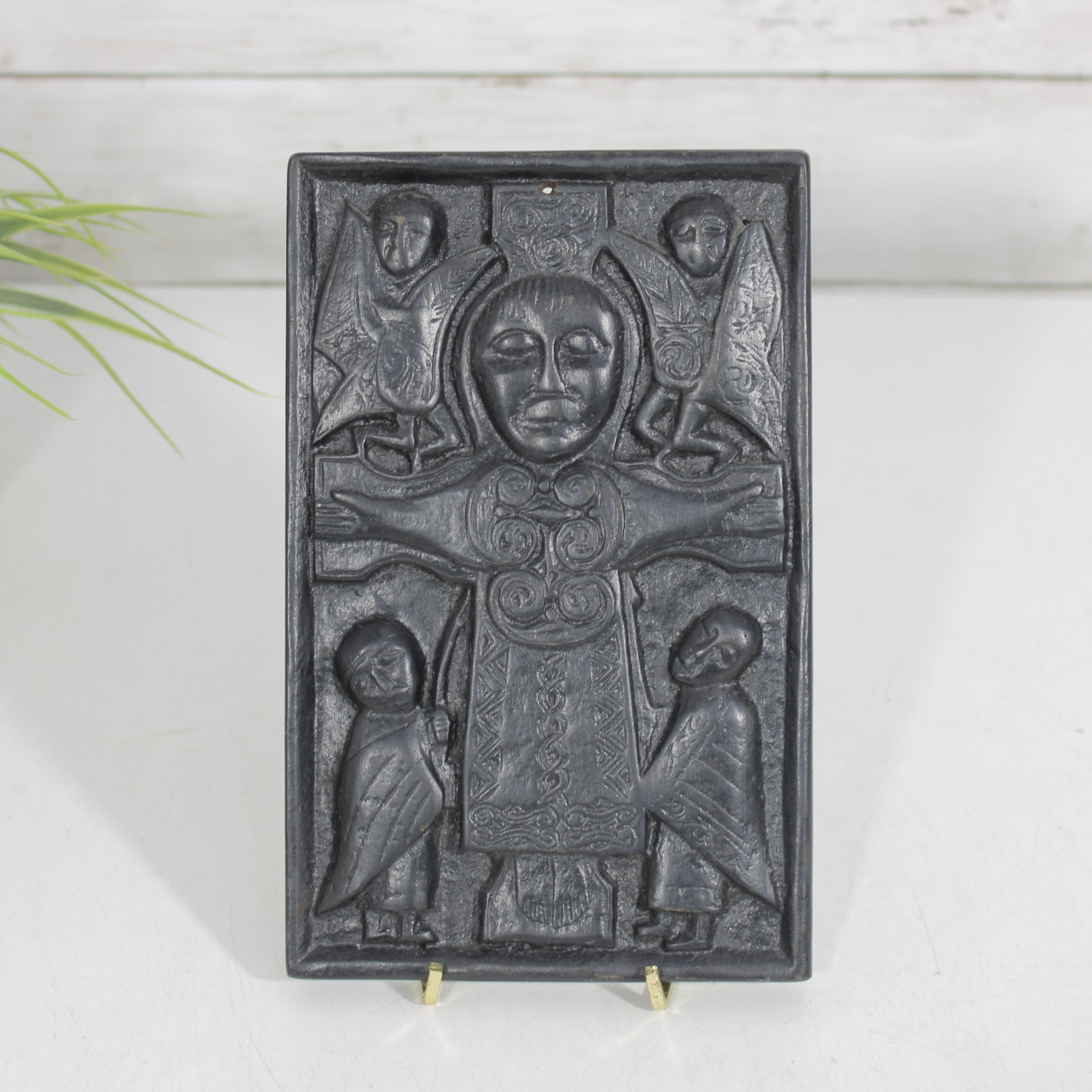 Made from peat resin, a material associated with Irish craftsmanship, the plaque has a dark, textured finish that enhances the depth and character of the design. The composition includes a central figure of Christ with outstretched arms, flanked by stylized figures and iconographic elements.
